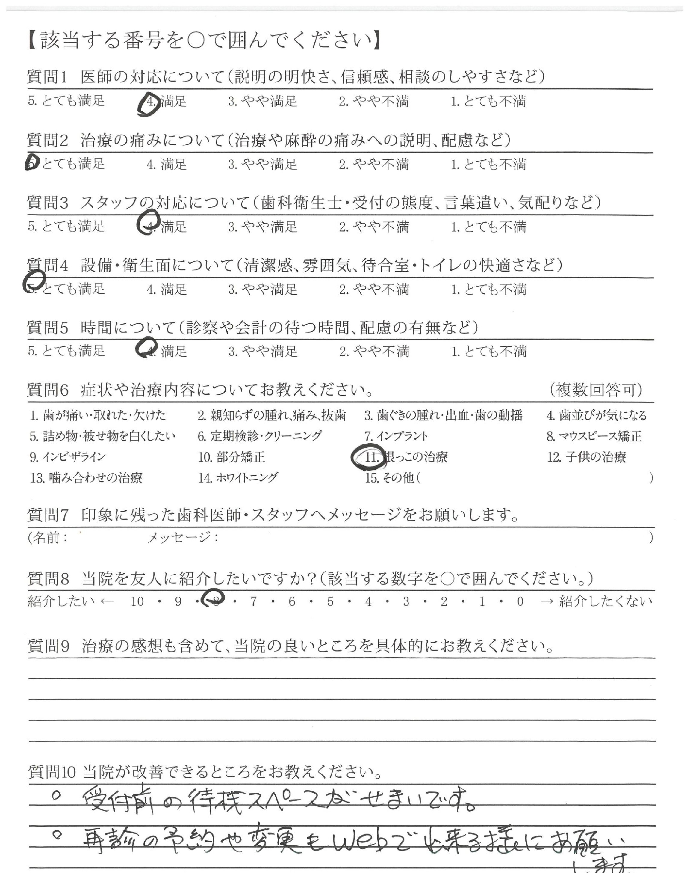 ・待つ人が集中する時があり、立った状態で待つことがあります。予約の時間調整が改善できると良いです。