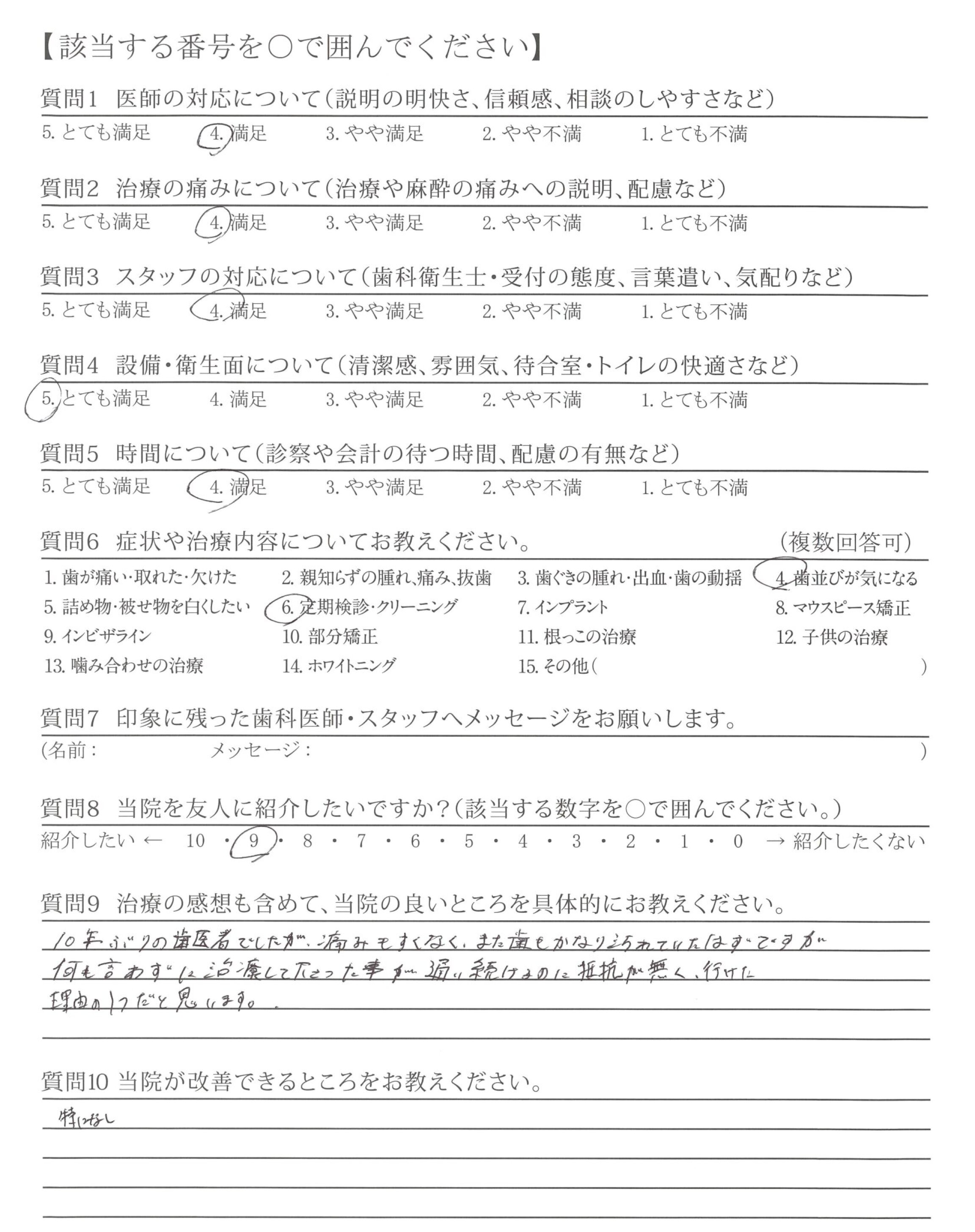 10年ぶりの歯医者でしたが、痛みもすくなく、また歯もかなり汚れていたはずですが何も言わずに治療して下さった事が通い続けるのに抵抗が無く、行けた理由の1つだと思います。