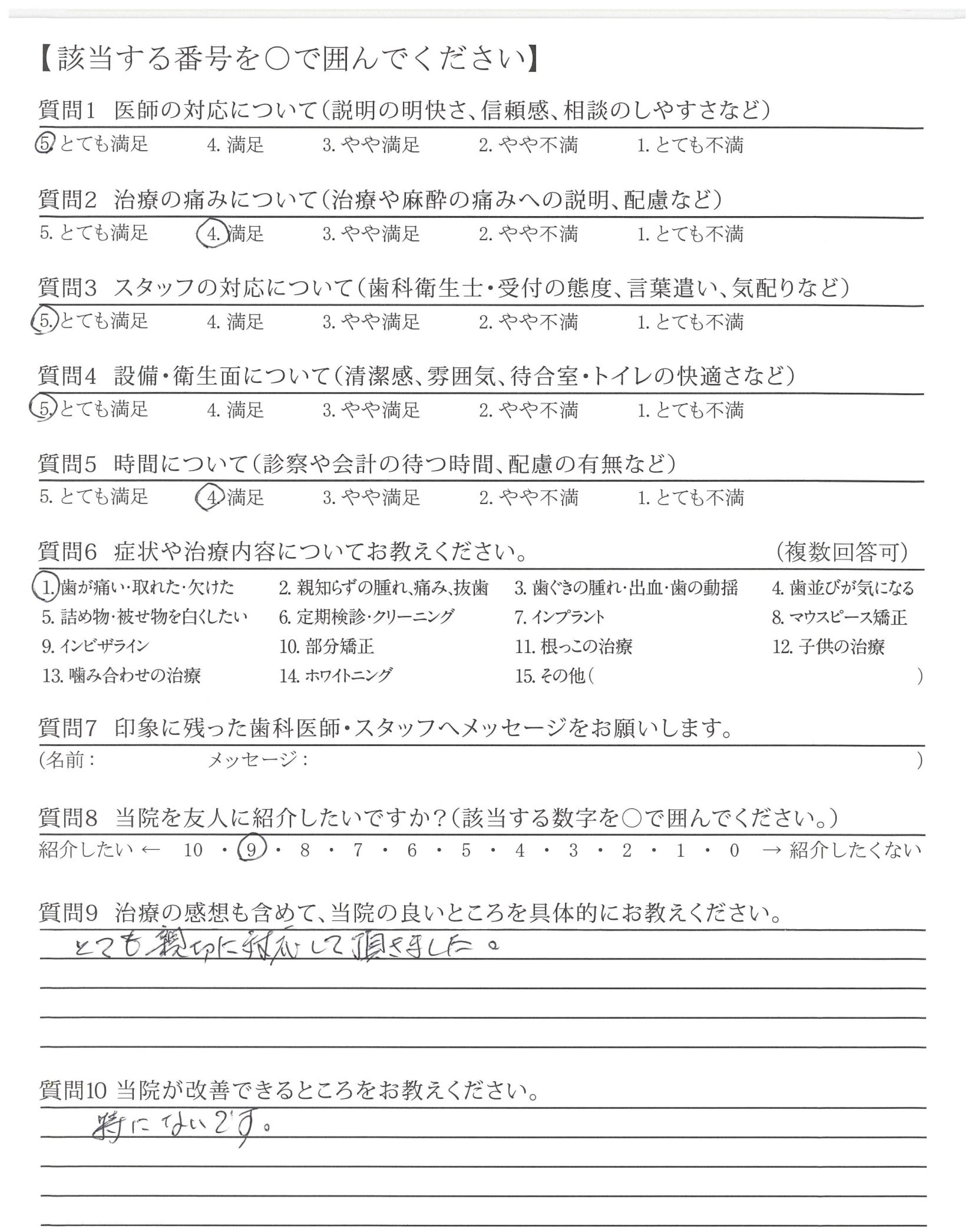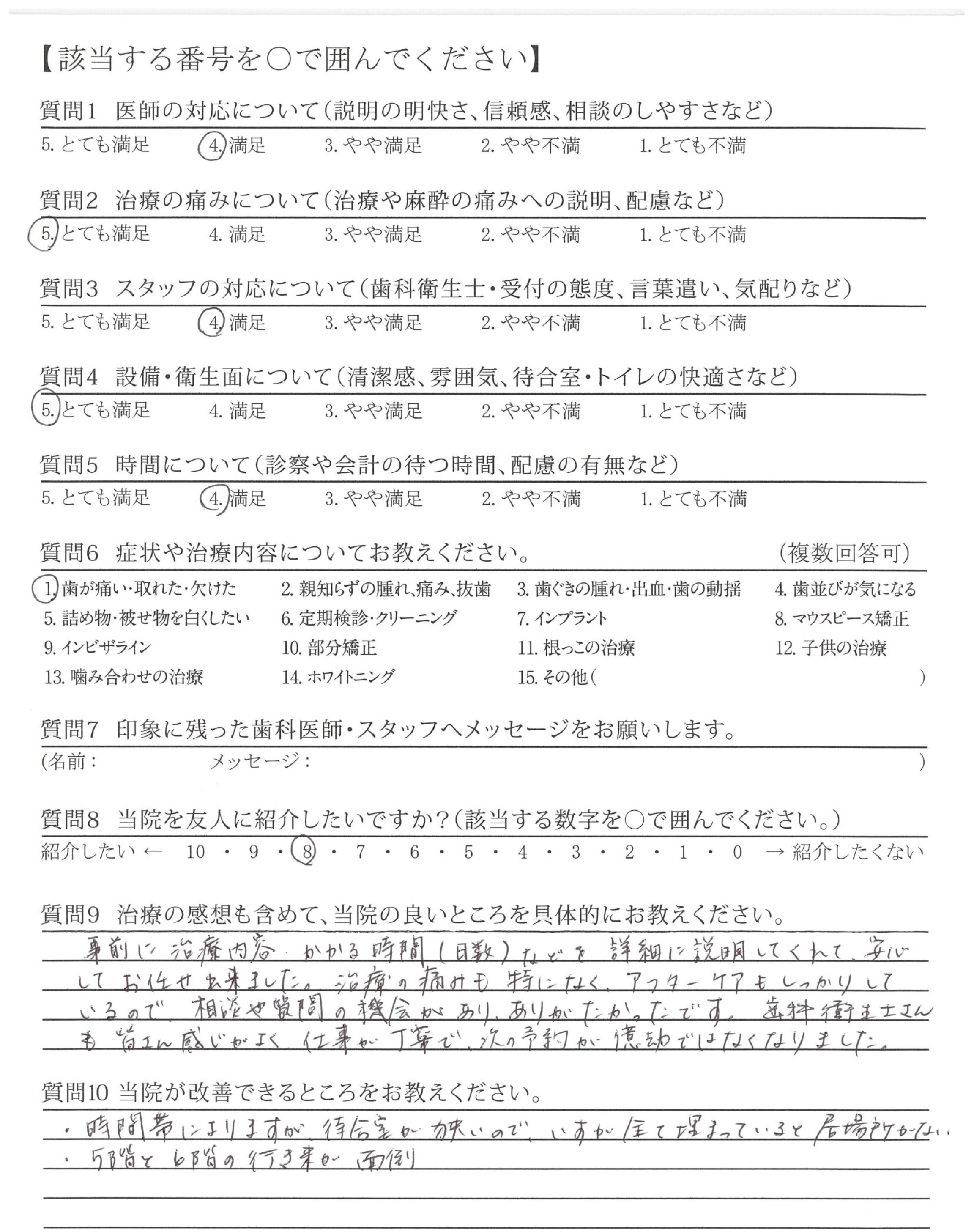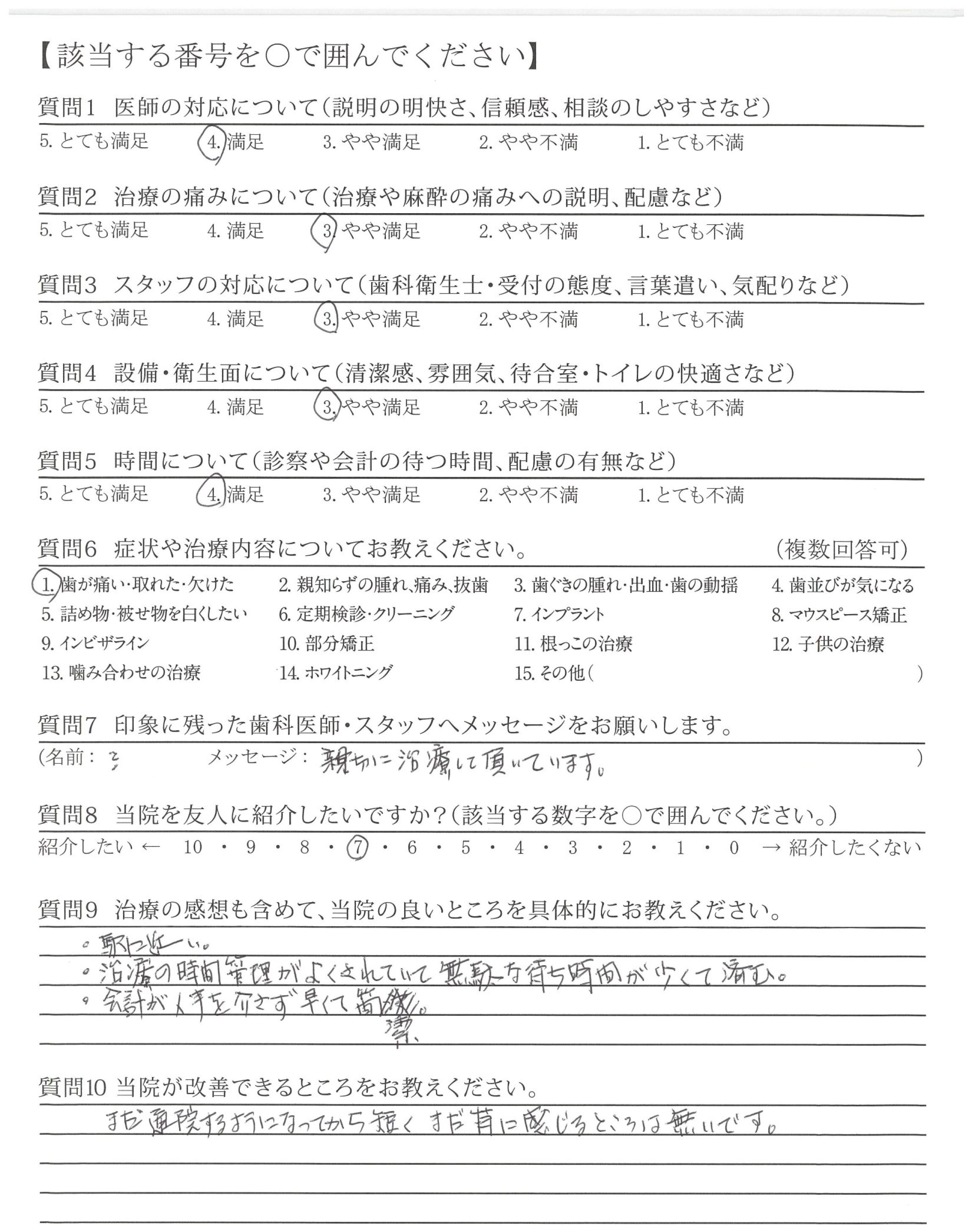 治療の痛みも特になく、アフターケアもしっかりしているので、相談や質問の機会があり、ありがたかったです。