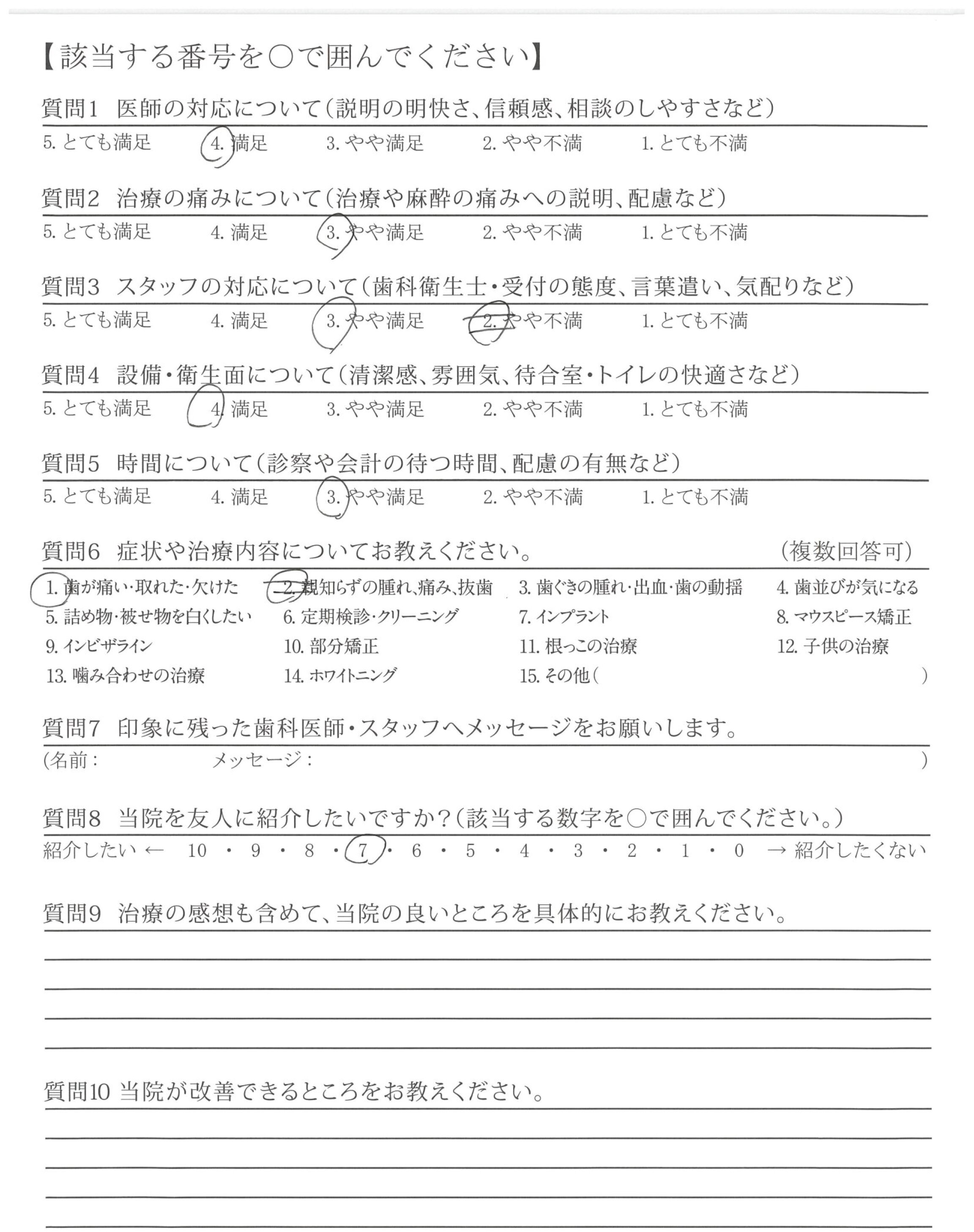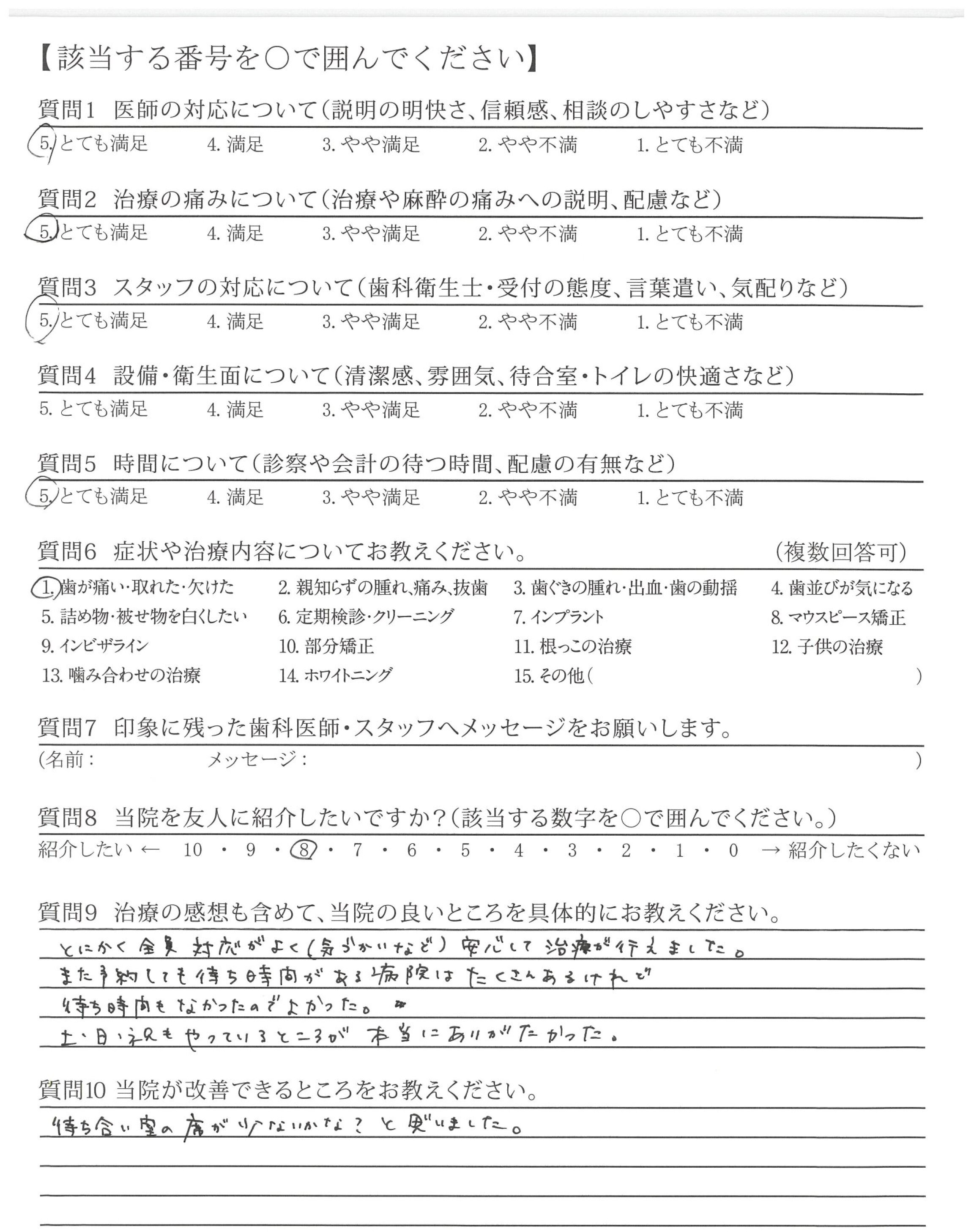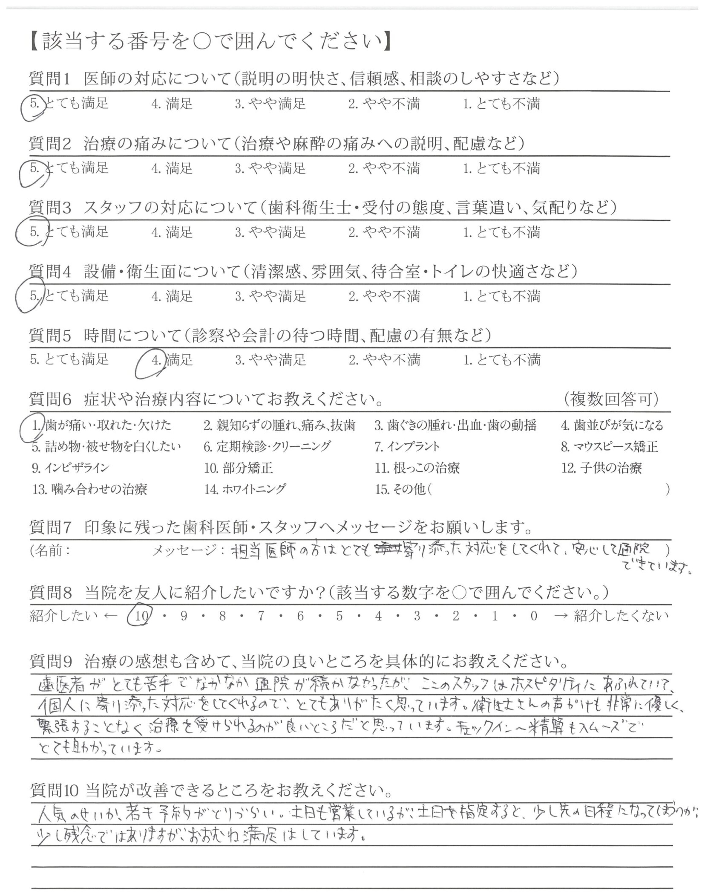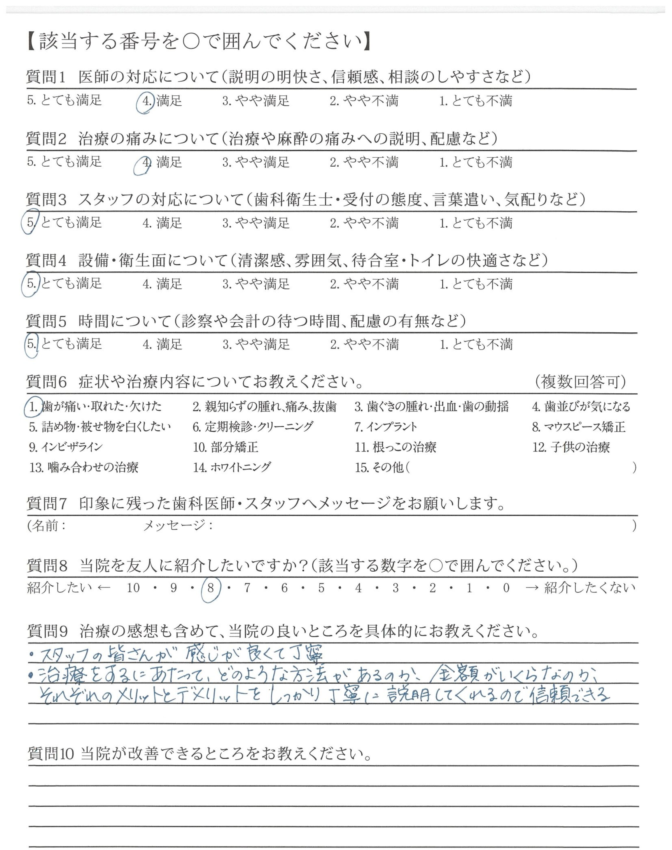 治療の痛みも特になく、アフターケアもしっかりしているので、相談や質問の機会があり、ありがたかったです。