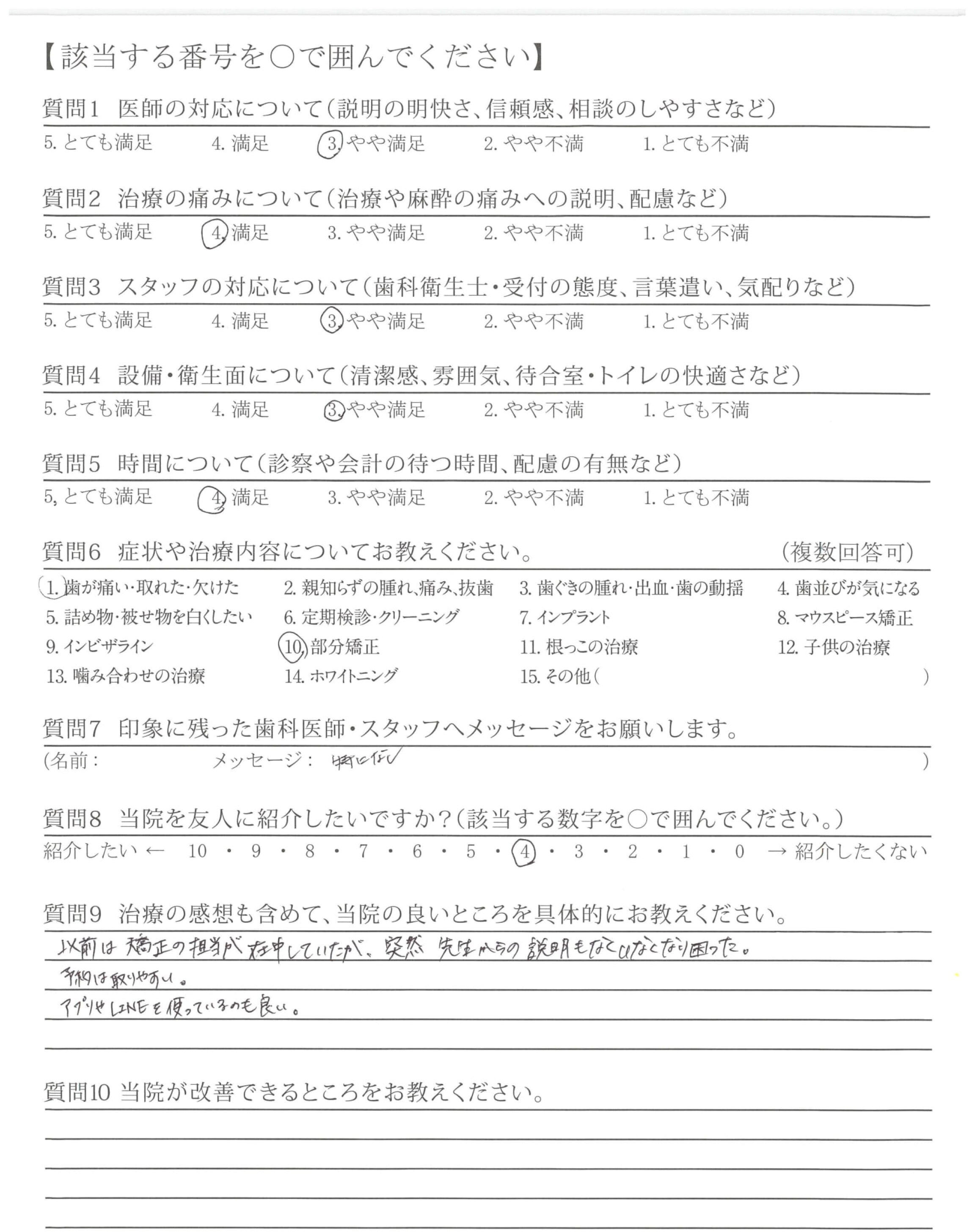 治療の前に「〇〇します」といつも言ってくださり、写真(ビフォーアフター)でわかりやすく説明してくださり、歯科医師として技術もピカ一だと思います。今後もお体を大事になさって下さい。よろしくおねがいします。