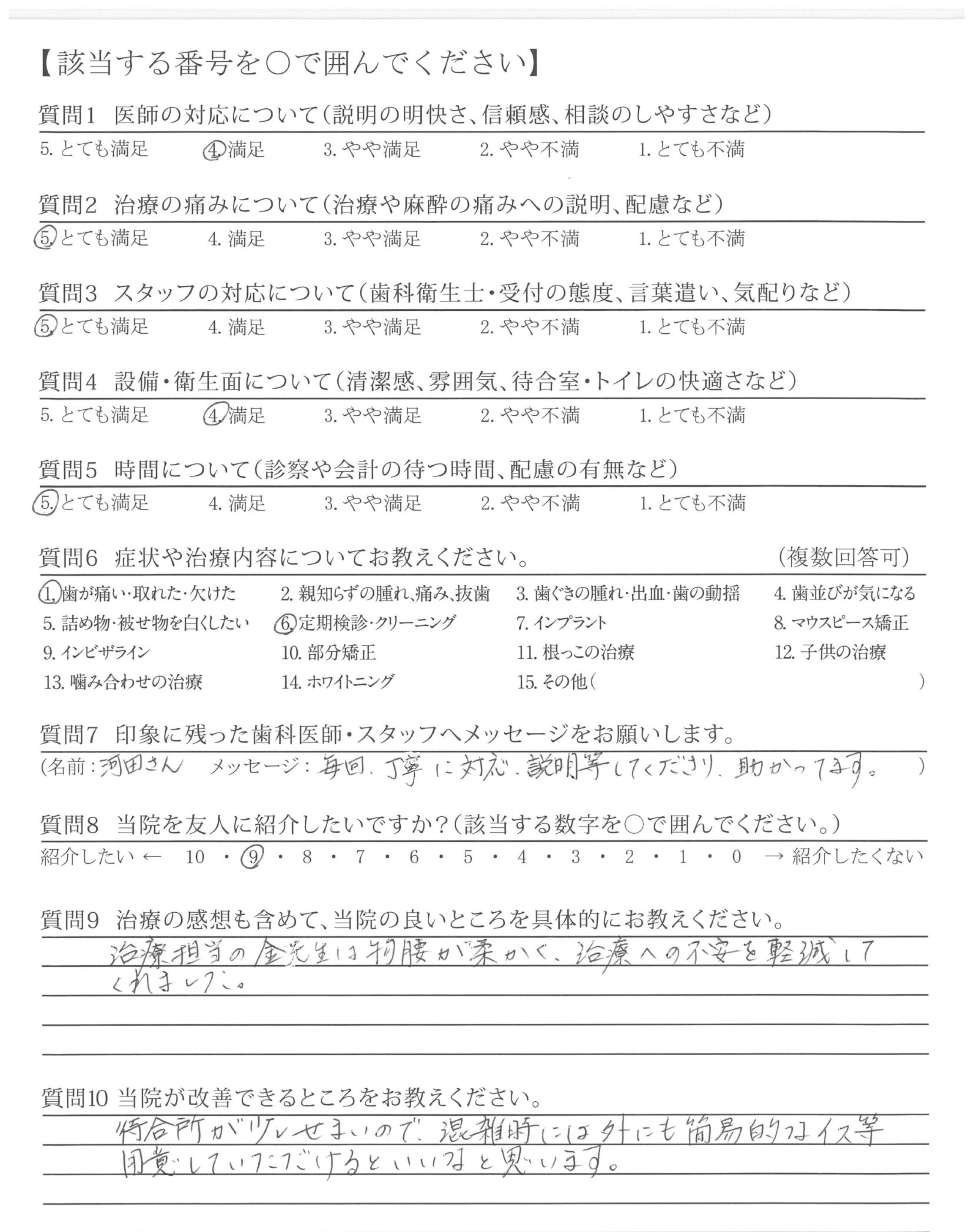 治療の内容をくわしく教えてくださり、又治療中も声掛けをして下さり安心して治療を受ける事ができました。