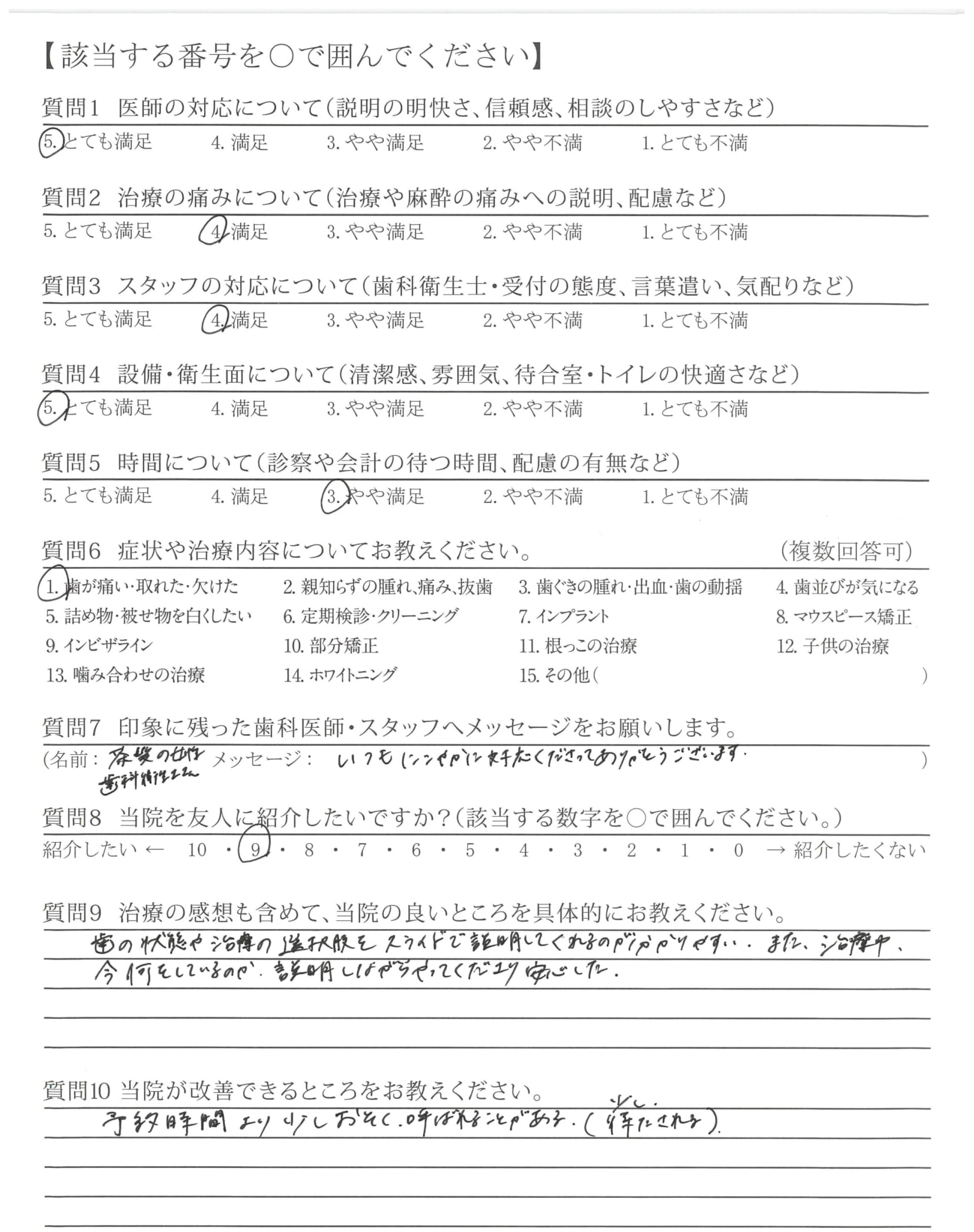 とても優しく、緊張がほどける。多少痛い麻酔をがまんすれば治療は痛くなく仕上がりもきれいです。ずーっと指名していきたいです。最後の笑顔にいやされます。