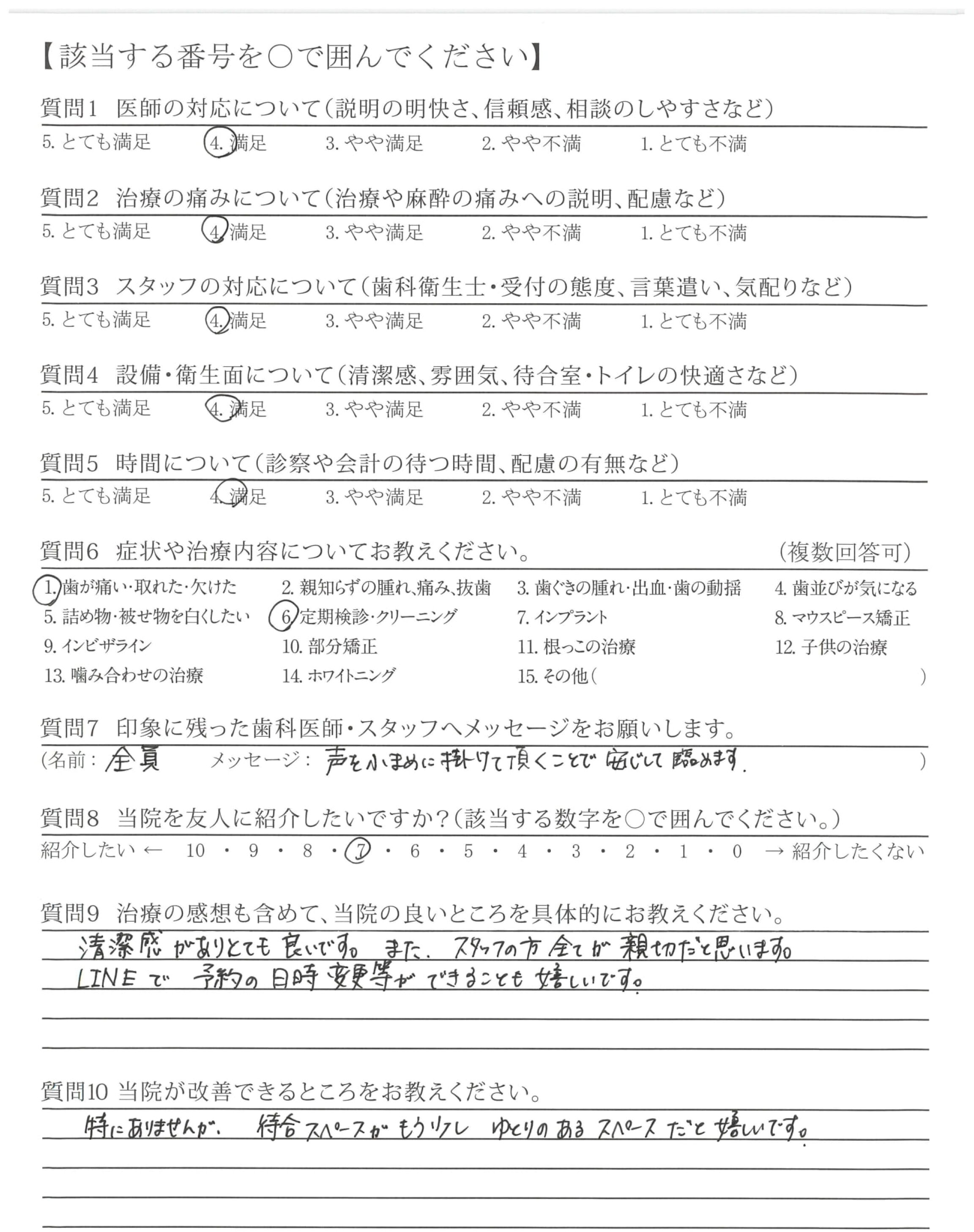 衛生士、受付、医師もみんな顔を見て話してくれるので安心する。歯科以外でも顔も見ず診察する方がいるので、その際とても不安、不信になるので。