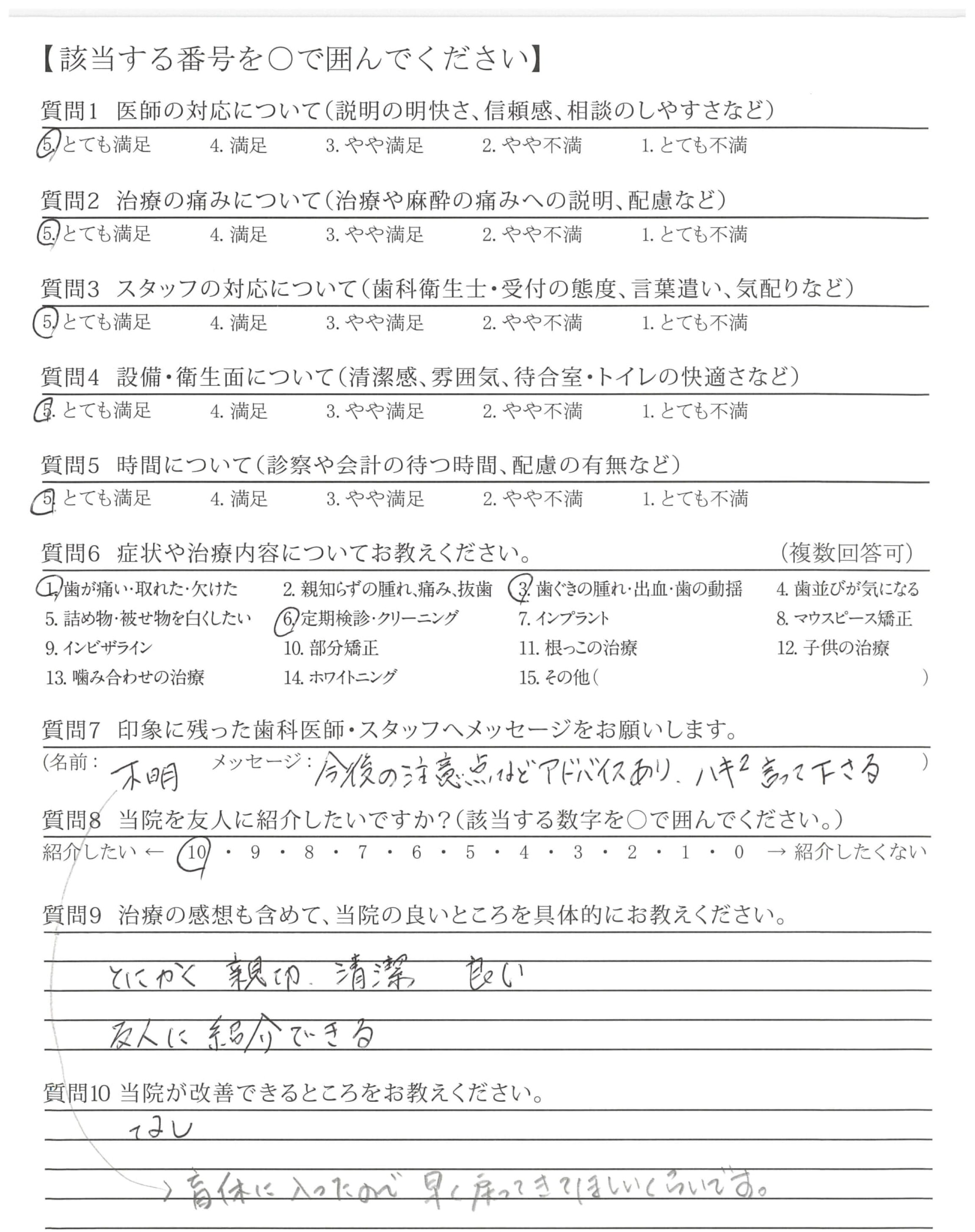 ・麻酔をかける時に一言欲しいです。気付いたら歯茎にチクッとした痛みがありビックリしてしまいました。