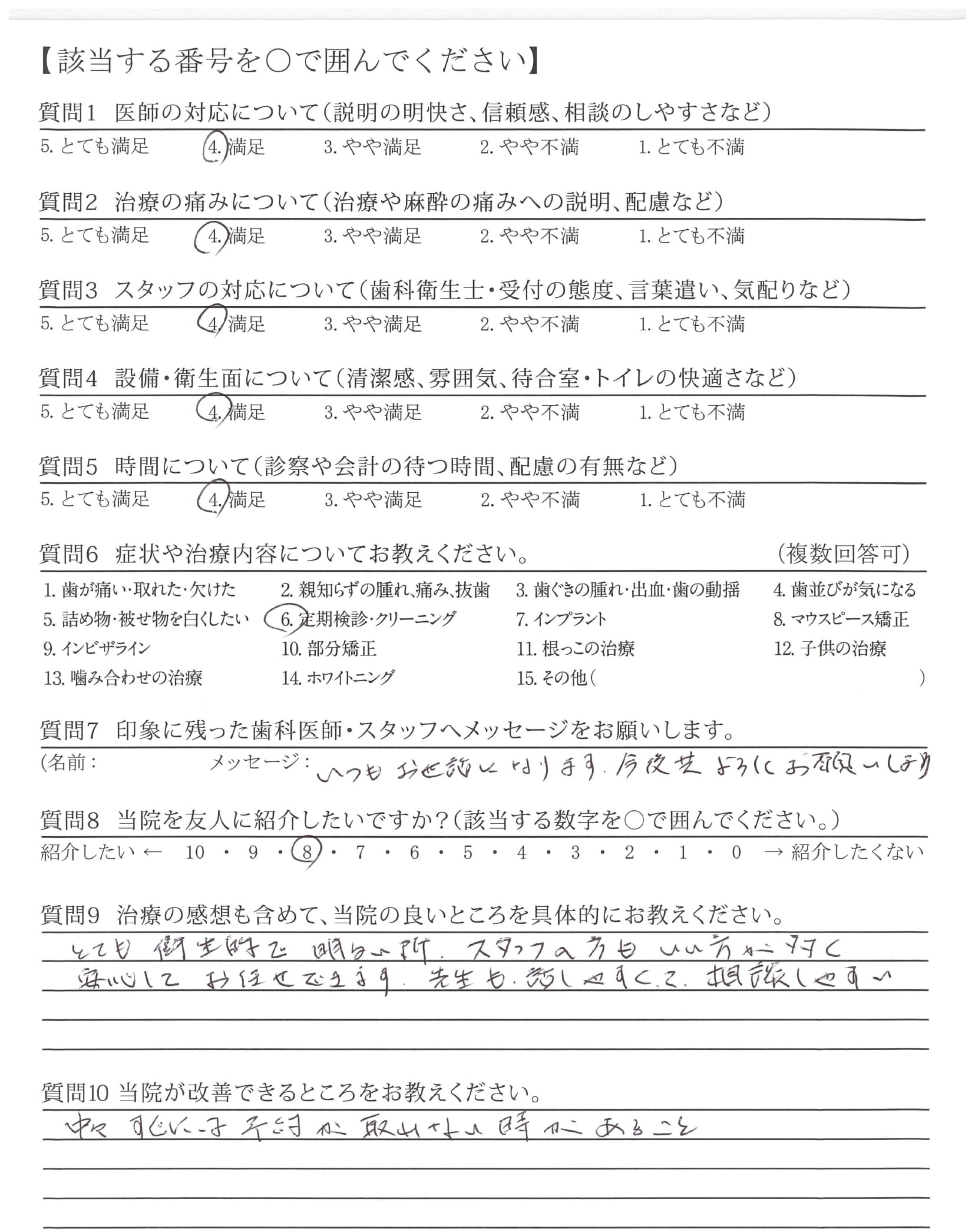 いつも丁寧に診て下さり、治療も早いのに、やわらかい感じがする所がすごく安心できます。