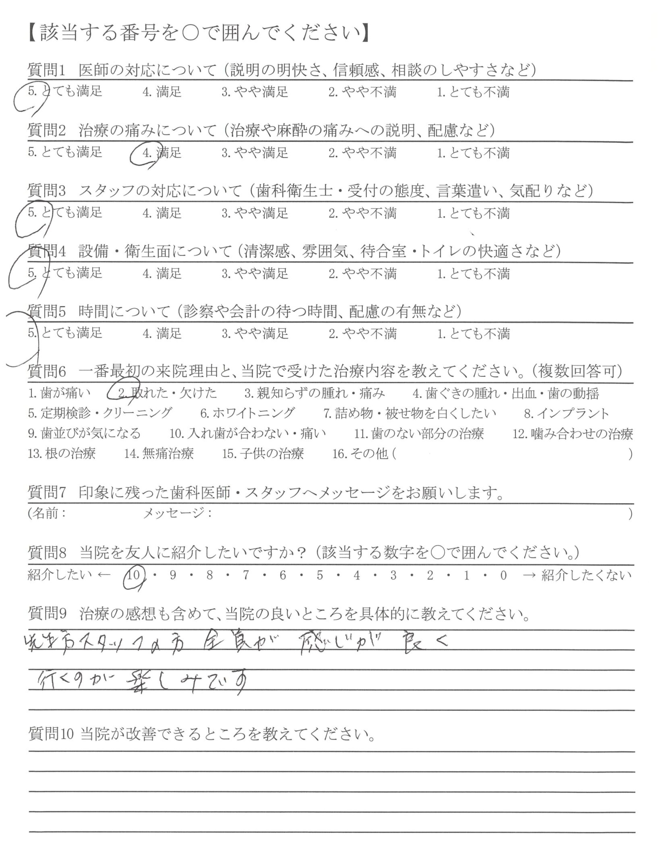 抜歯に恐怖心がありましたが、安心して通えました。本当に優しい対応に感謝致します。ありがとうございました。
