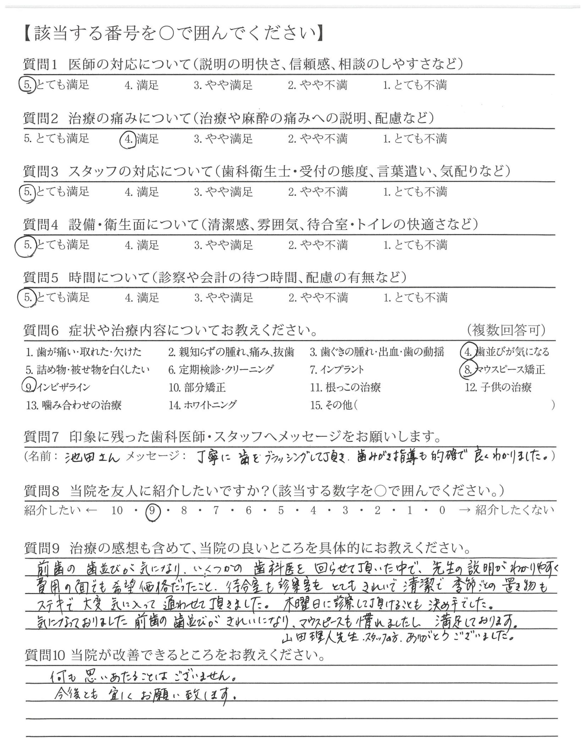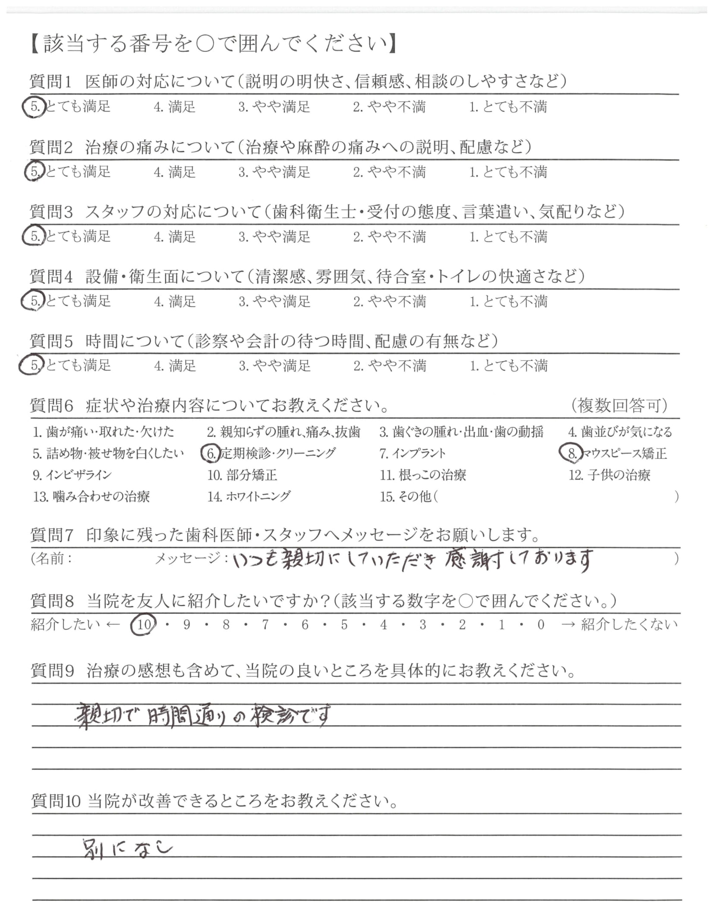 気になっておりました前歯の歯並びがきれいになり、マウスピースも慣れましたし満足しております。