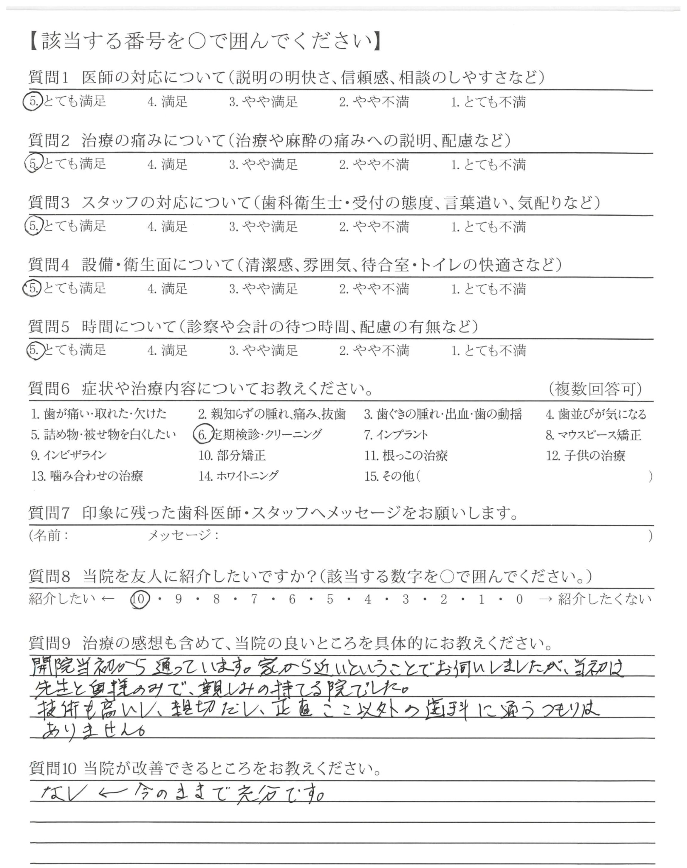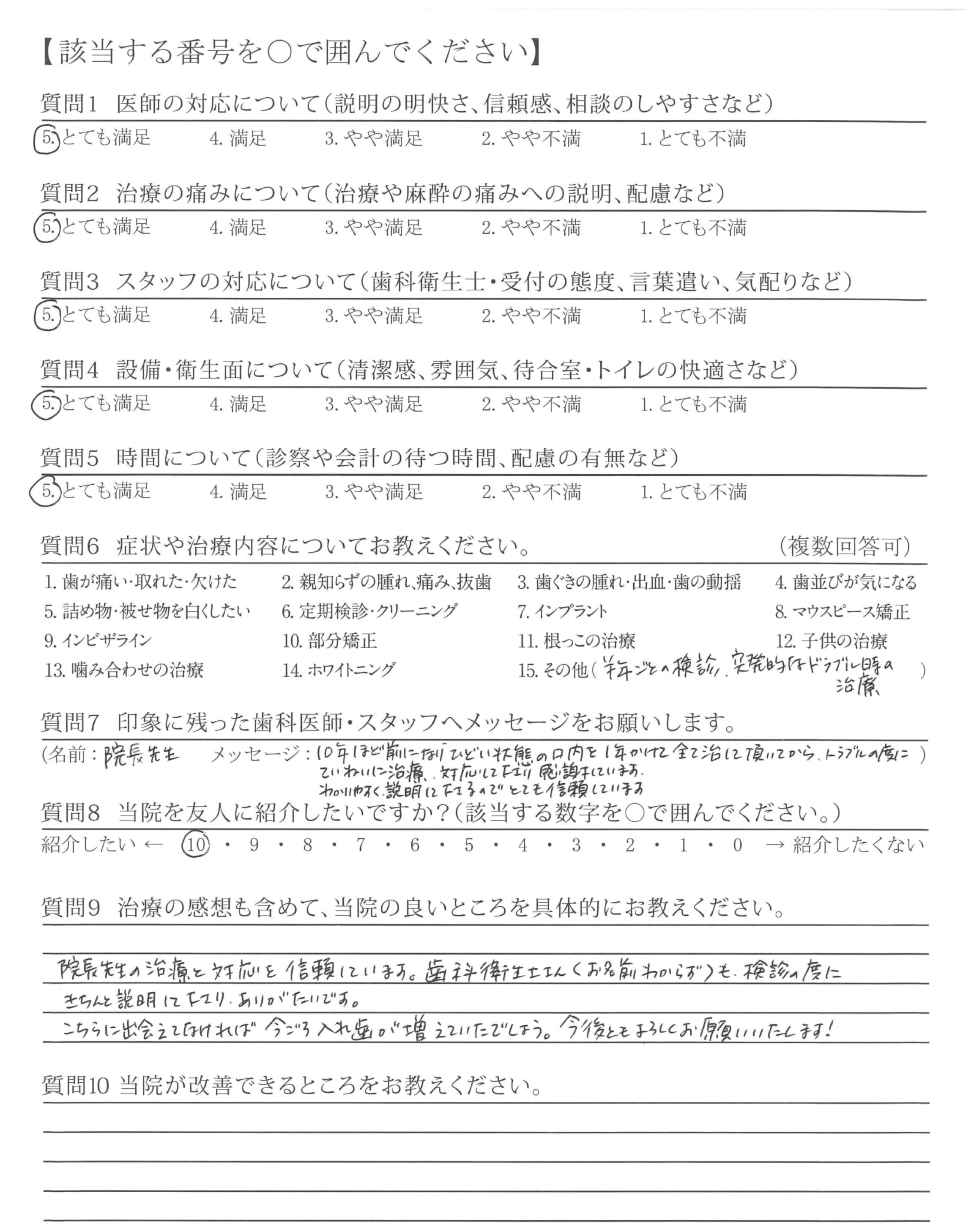 10年ほど前になりひどい状態の口内を1年かけて全て治して頂いてから、トラブルの度にていねいに治療、対応して下さり感謝しています。わかりやすく説明して下さるのでとても信頼しています