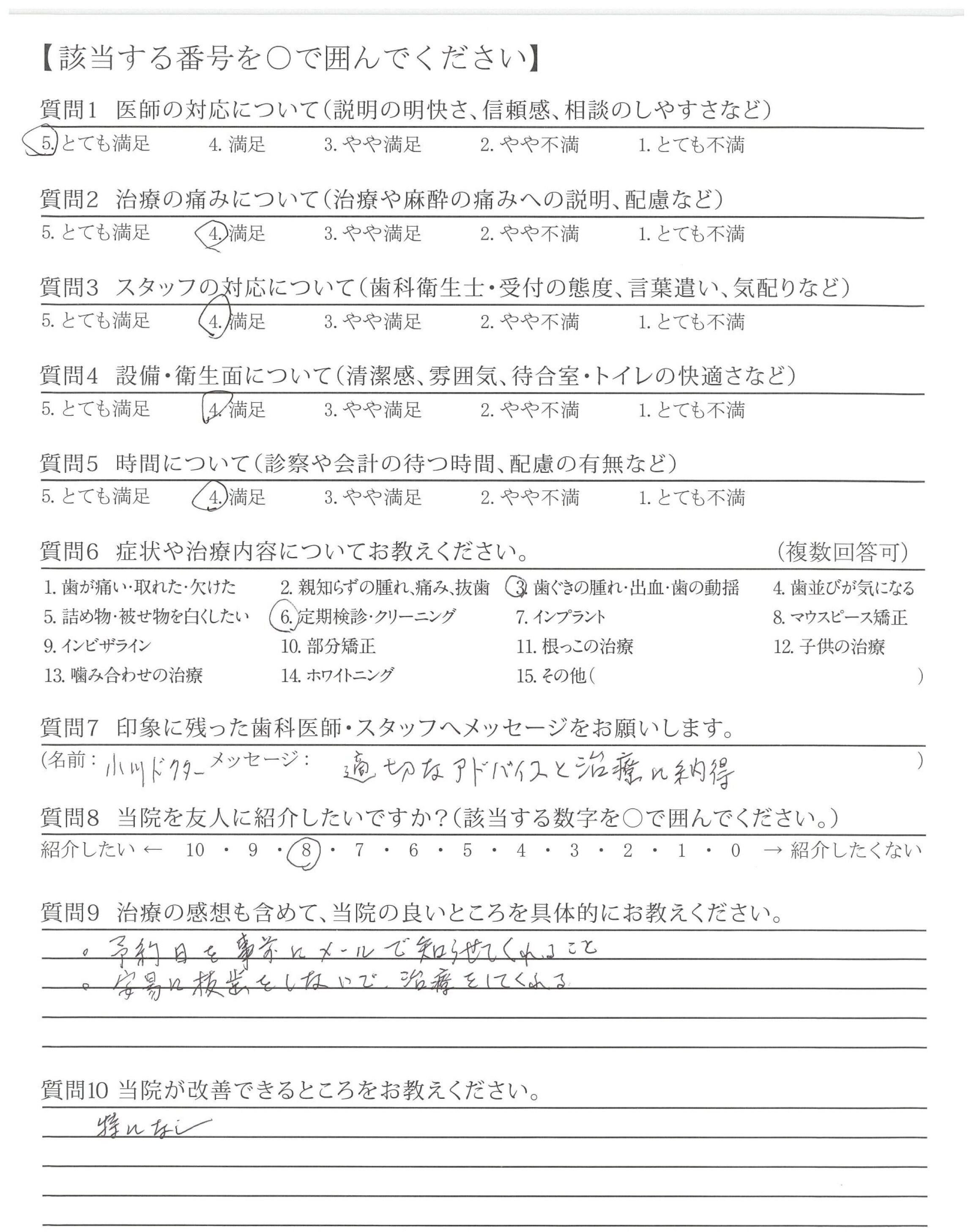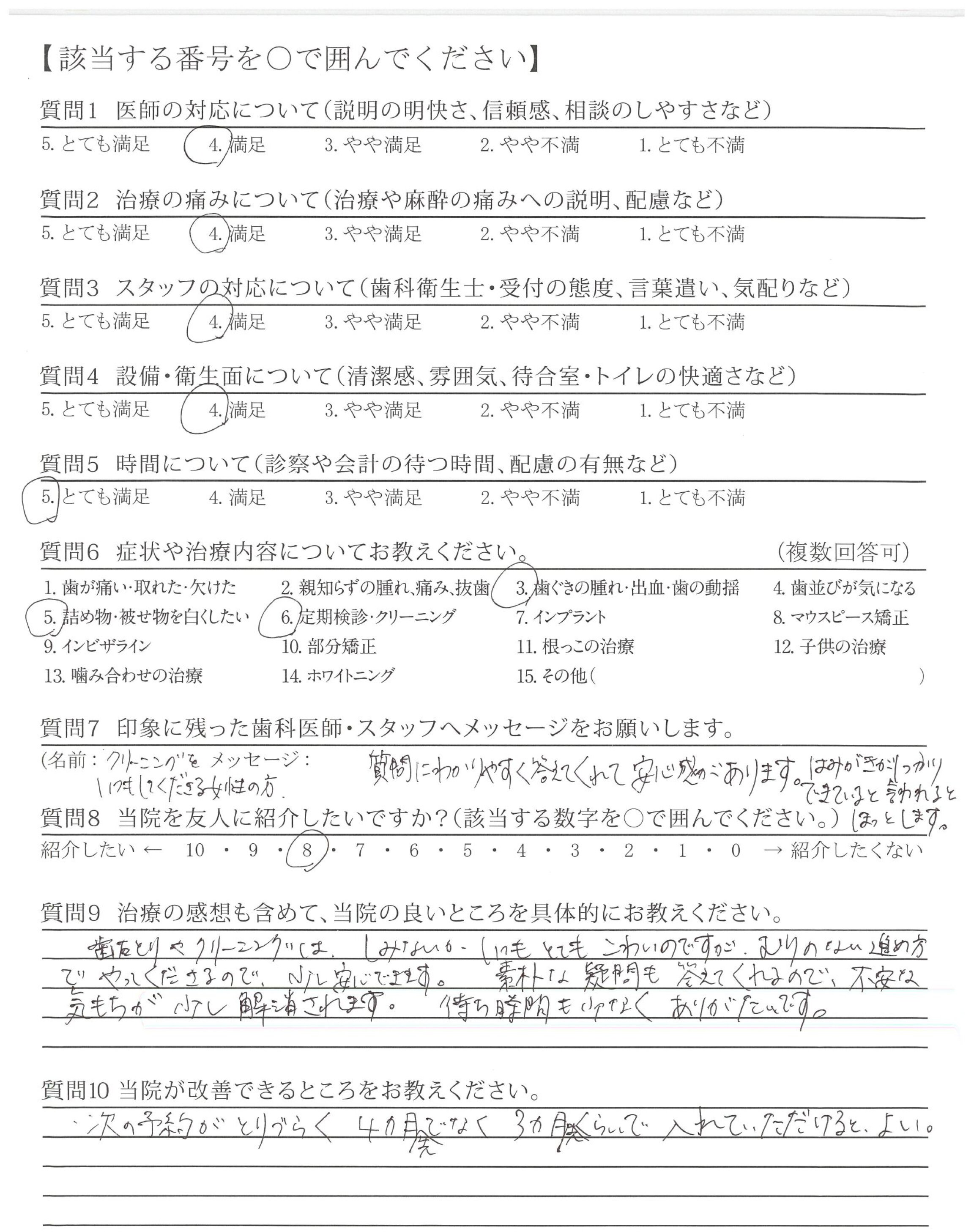 ・次の予約がとりづらく4カ月先ではなく3ヵ月先くらいで入れていただけると、よい。