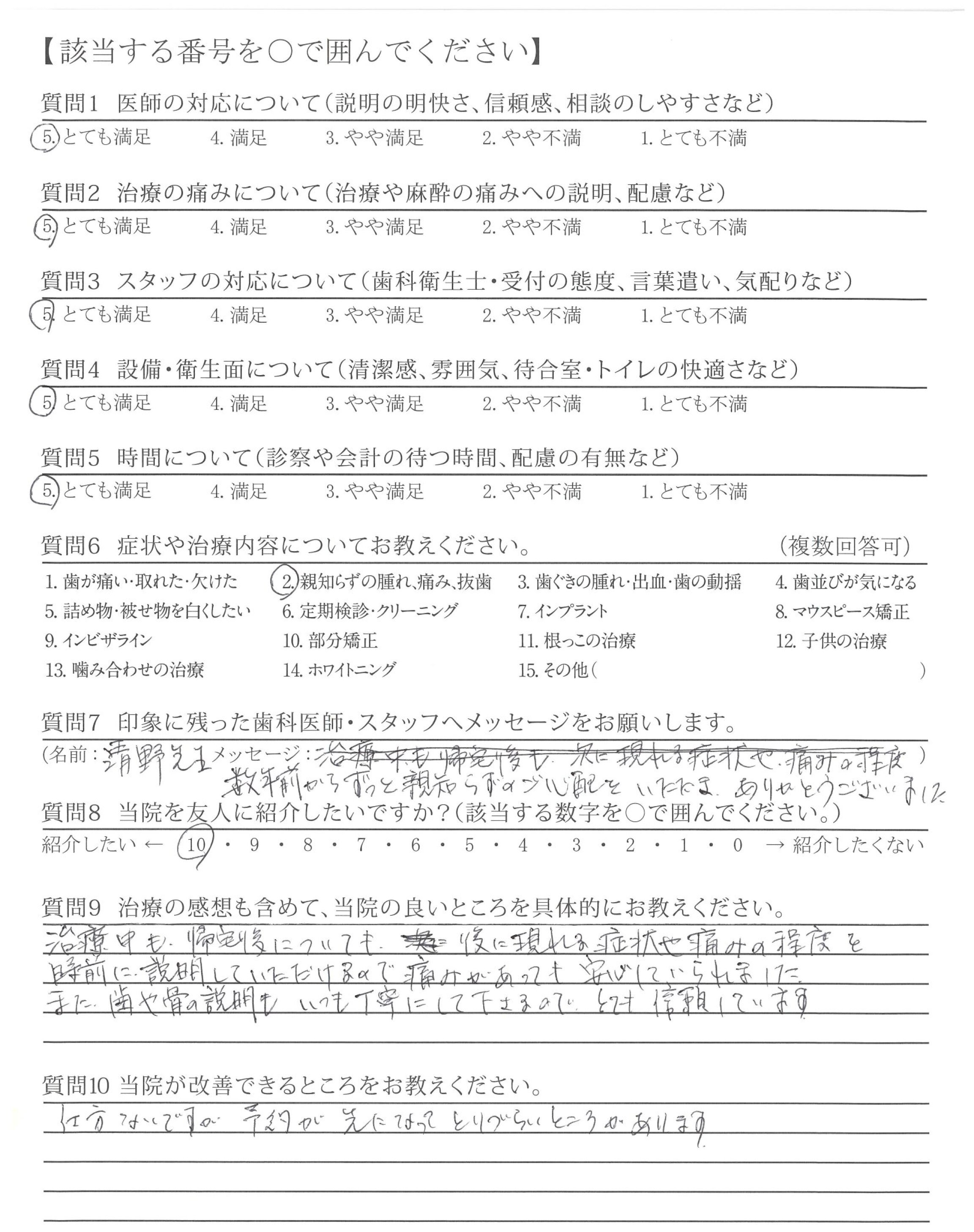 治療中も、帰宅後についても、後に現れる症状や痛みの程度を事前に説明していただけるので痛みがあっても安心していられました。また、歯や骨の説明もいつも丁寧にして下さるのでとても信頼しています。