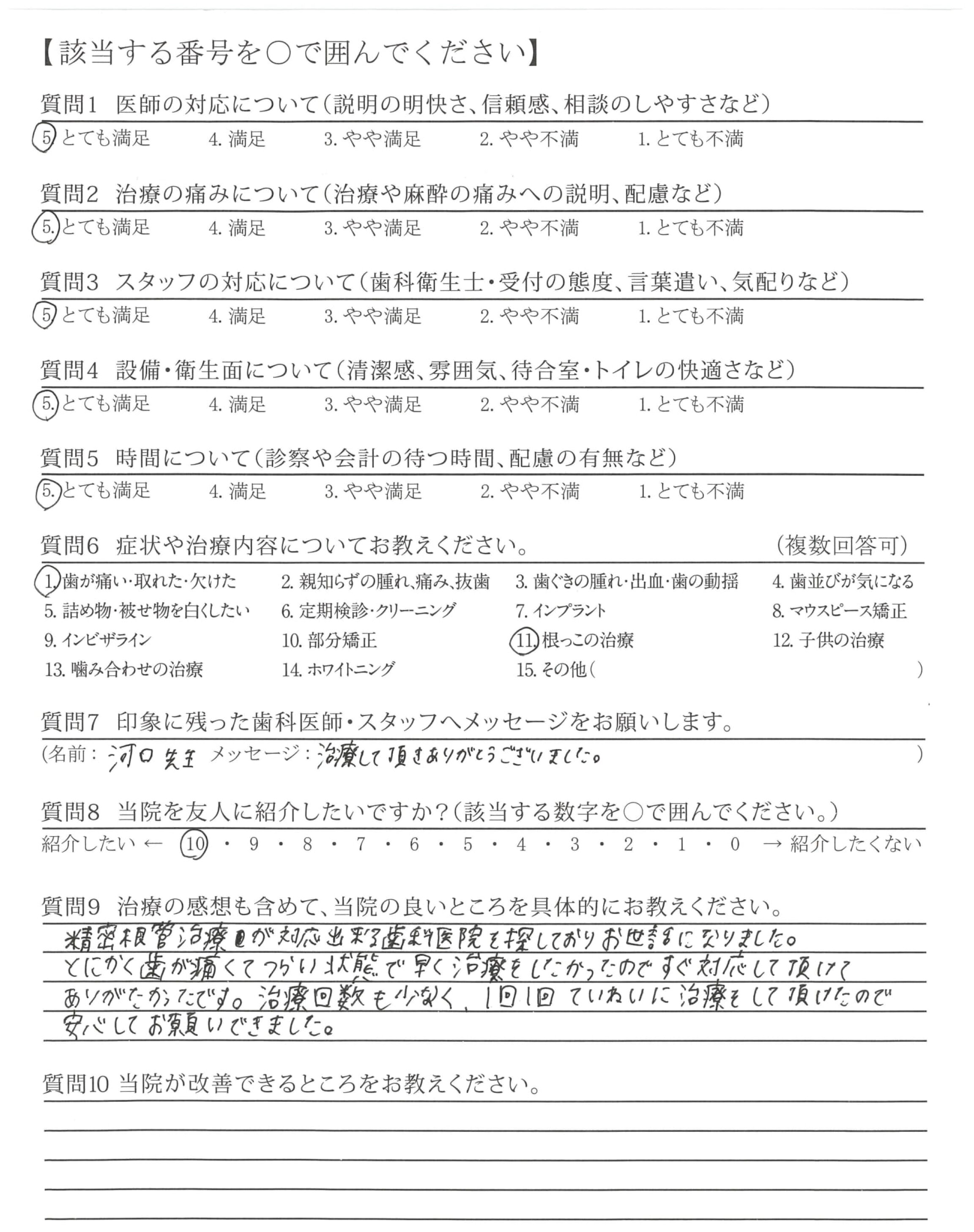 インプラントにしなければならないかなと思った歯を残して下さり、他の歯も根っこを含めきれいに治して頂き痛みやピリピリもなくなり大変うれしいです。麻酔も痛くなくとてもお上手でした。