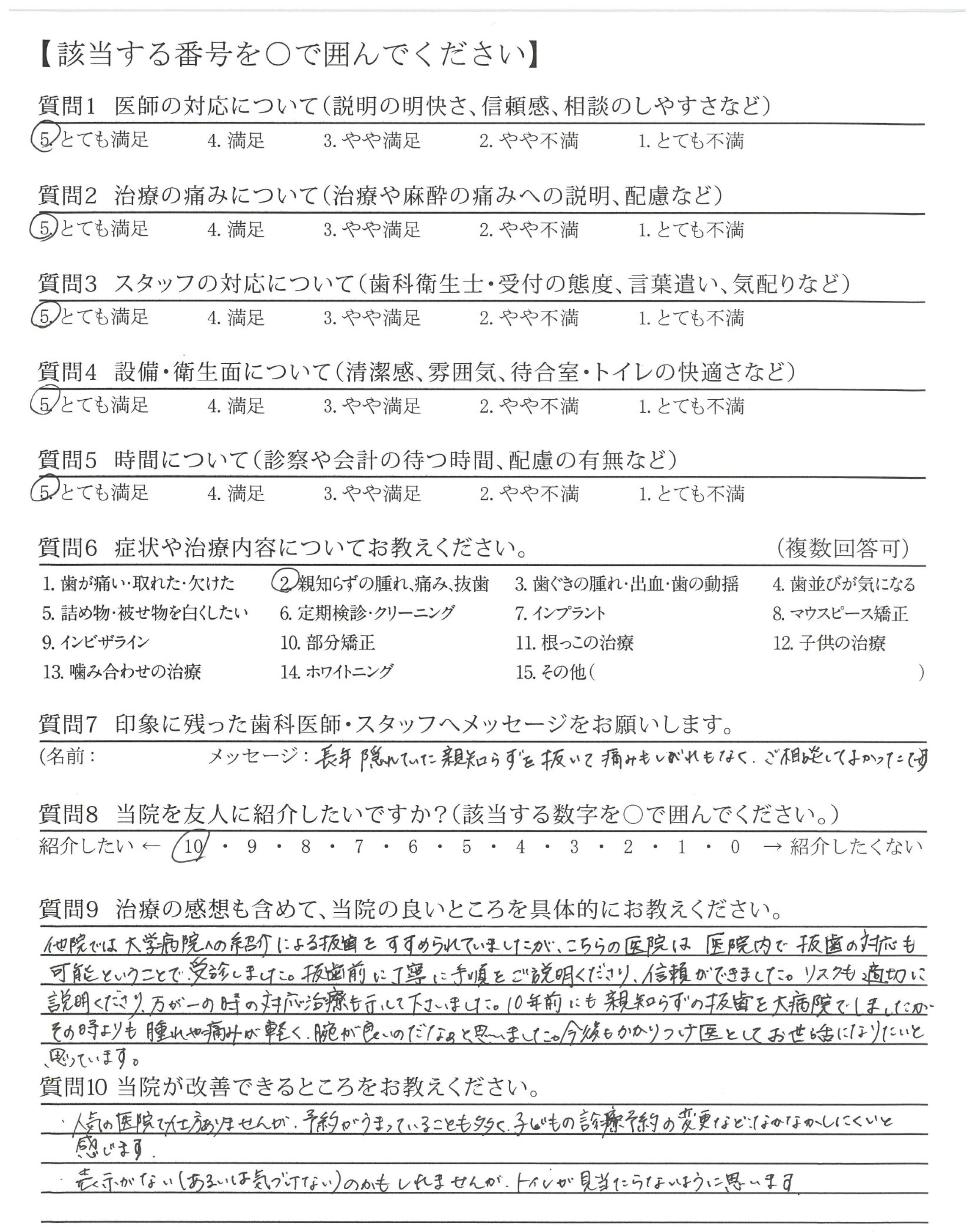 長年隠れていた親知らずを抜いて痛みもしびれもなく、ご相談してよかったです。
