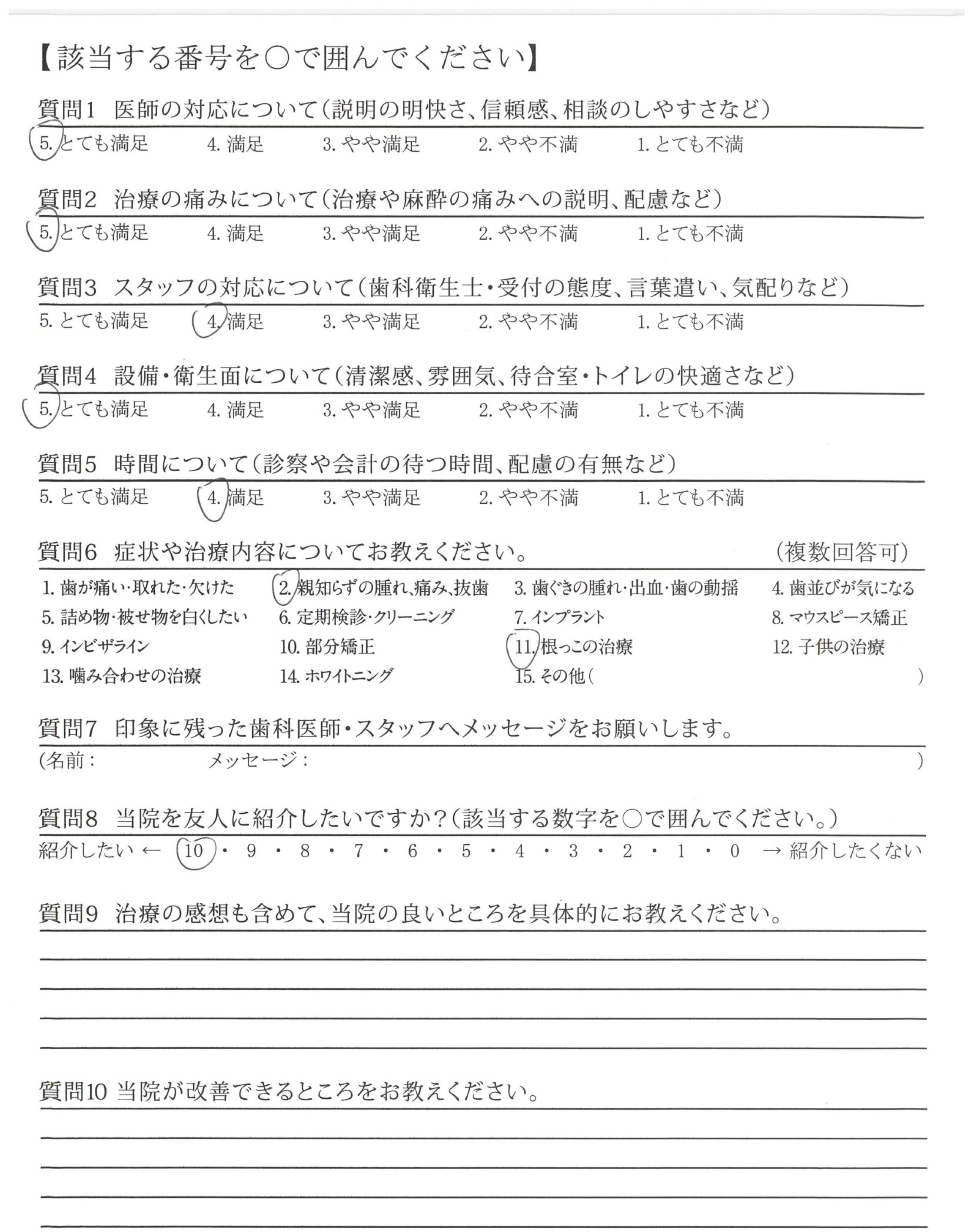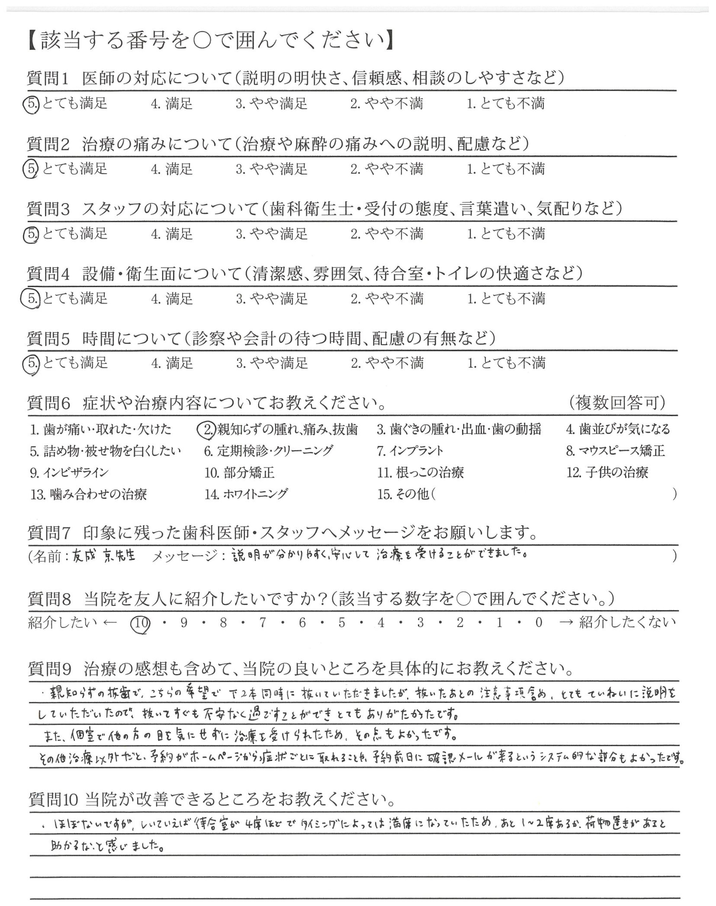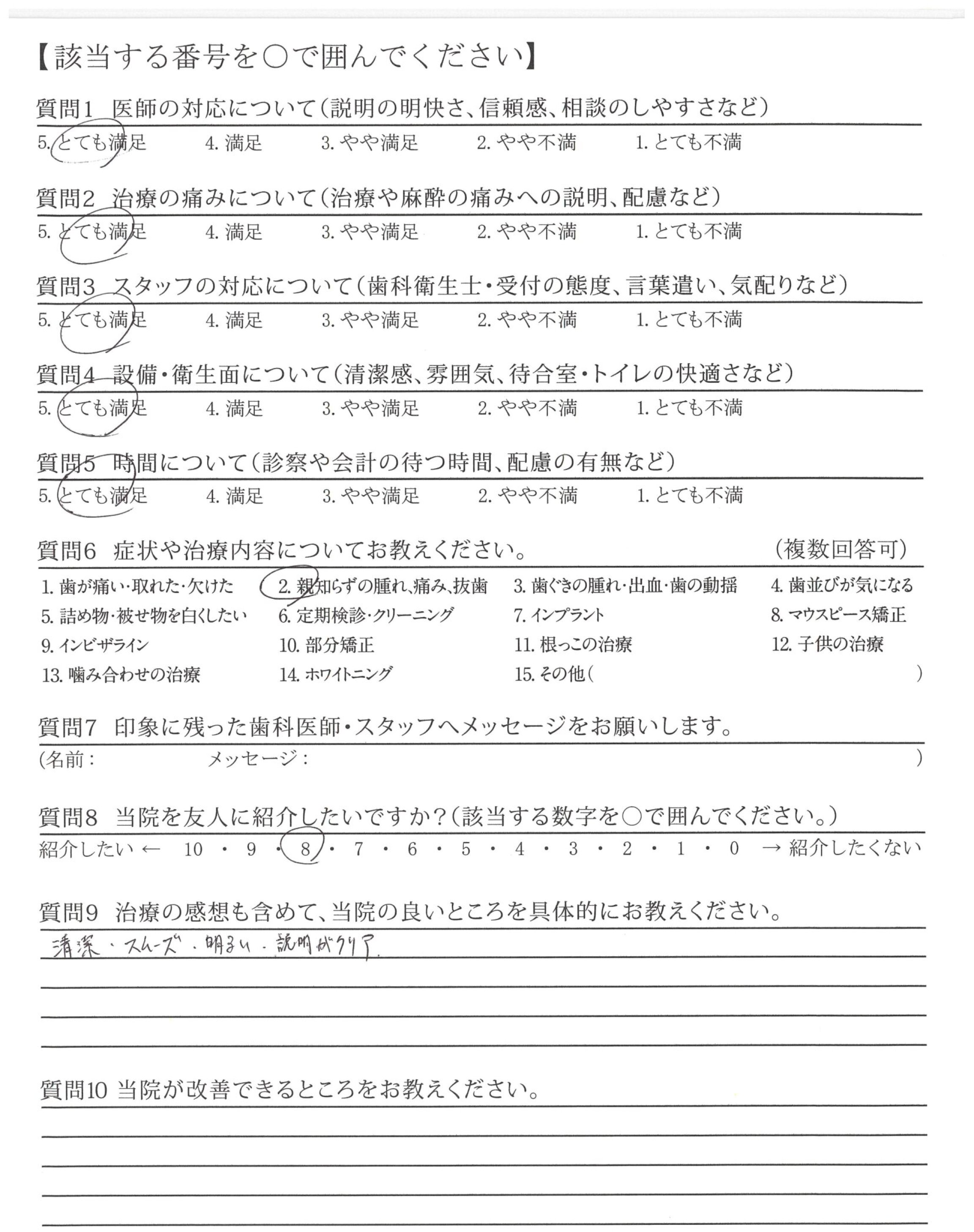 治療前に、どう治療を勧めていくか説明していただいたが、その説明が丁寧で安心して治療を進められた。治療でも、痛みをあまり感じず良好だった。
