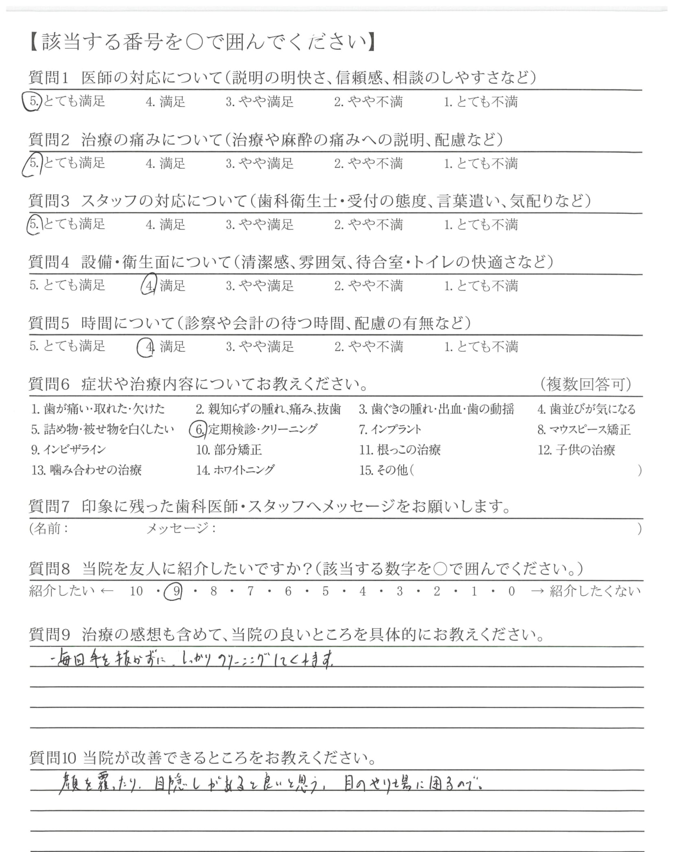 医院が家から近い上、どんな小さい事でも電話でお願いしますと、先生の時間のゆるす最短の時間で診察して頂けますので、とっても助かって居ります。食べ物を、かみしめる時は、先生に感謝致して居ります。