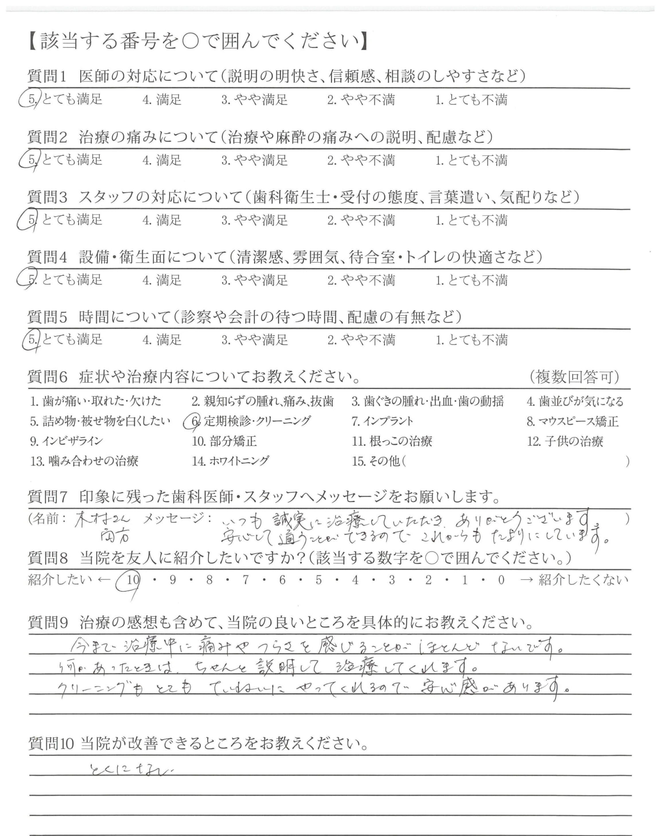 いつも誠実に治療していただき、ありがとうございます。安心して通うことができるのでこれからもたよりにしています。