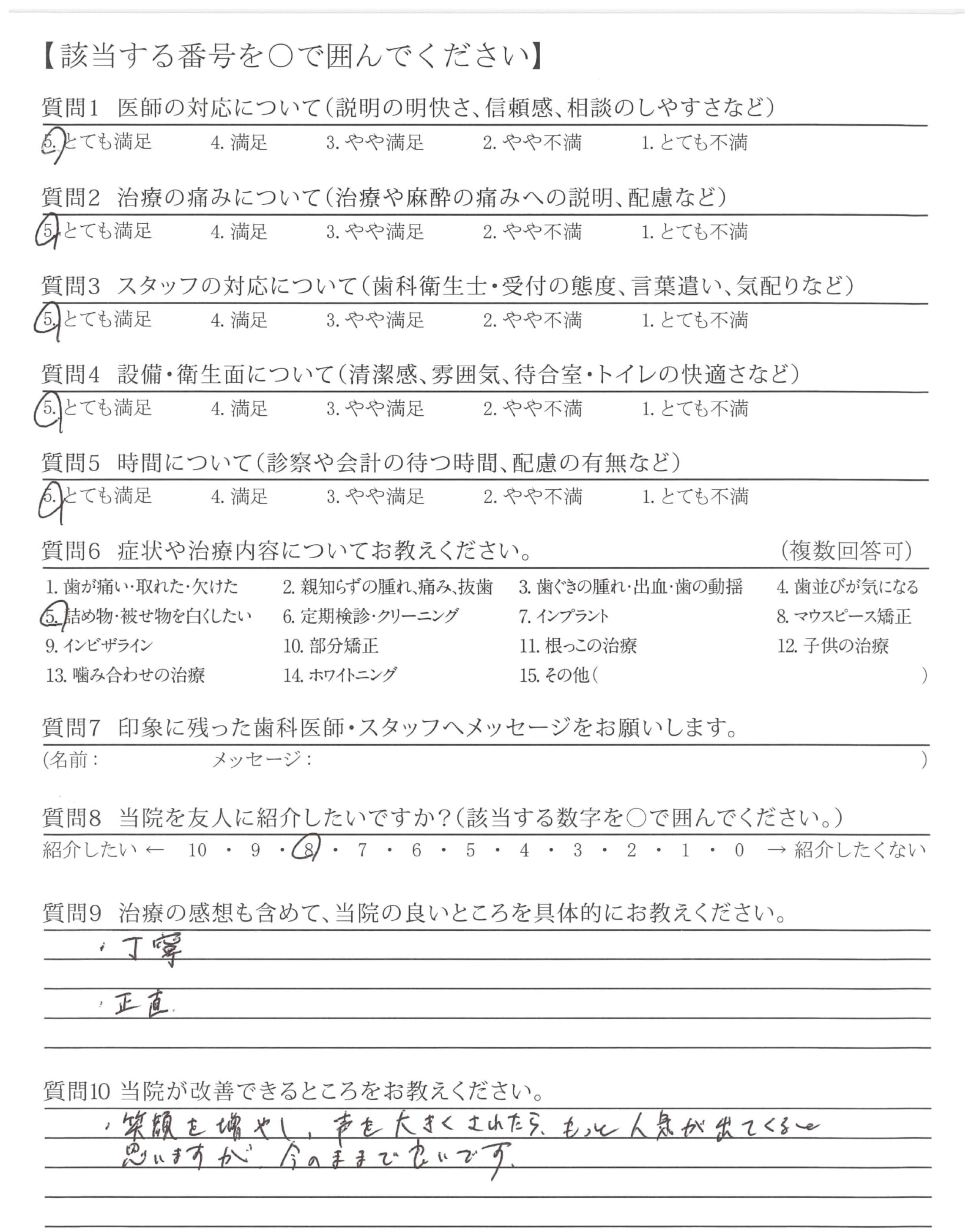 最初は近所なので区か都から来た検診だけのつもりで行きました。痛い所も有り、感じが合わなければ他所を探そうとも思ってましたが、良い先生で、衛生士の方も良い感じで今は3ヶ月検診で通院してます