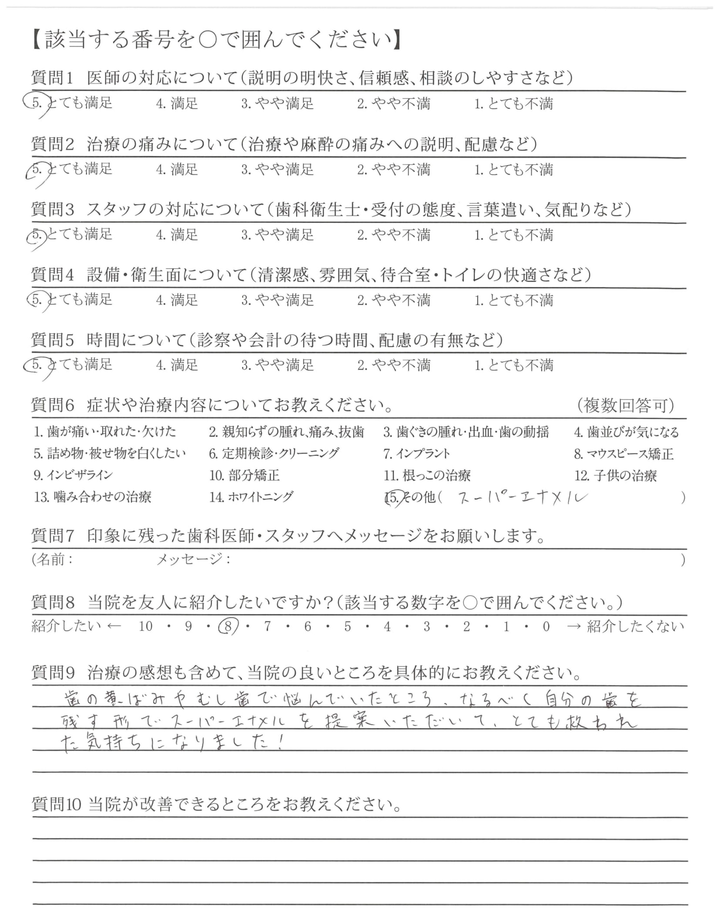 ホワイトニングでは白くならなかった歯を、スーパーエナメルできれいにして頂き、QOLが向上しました。