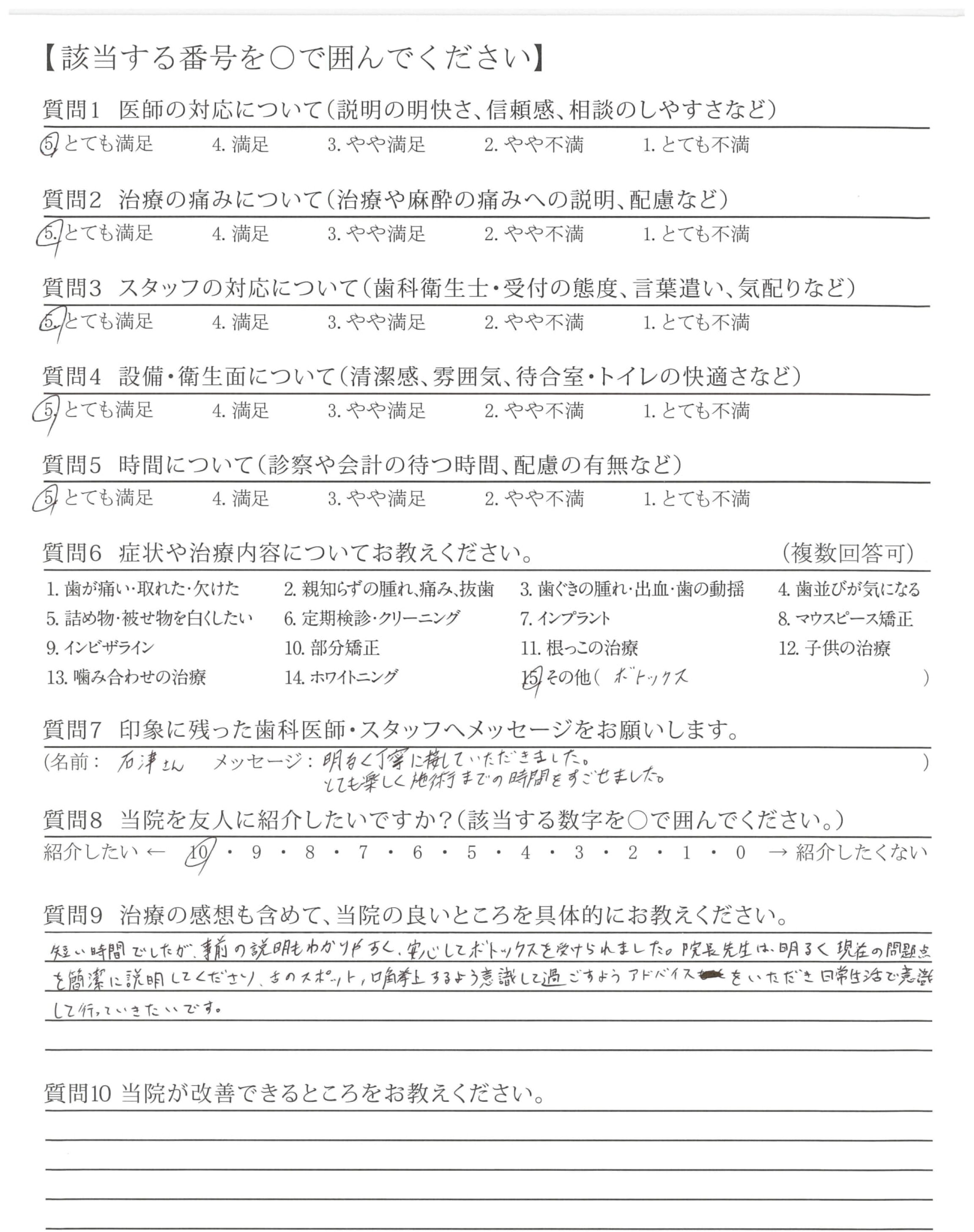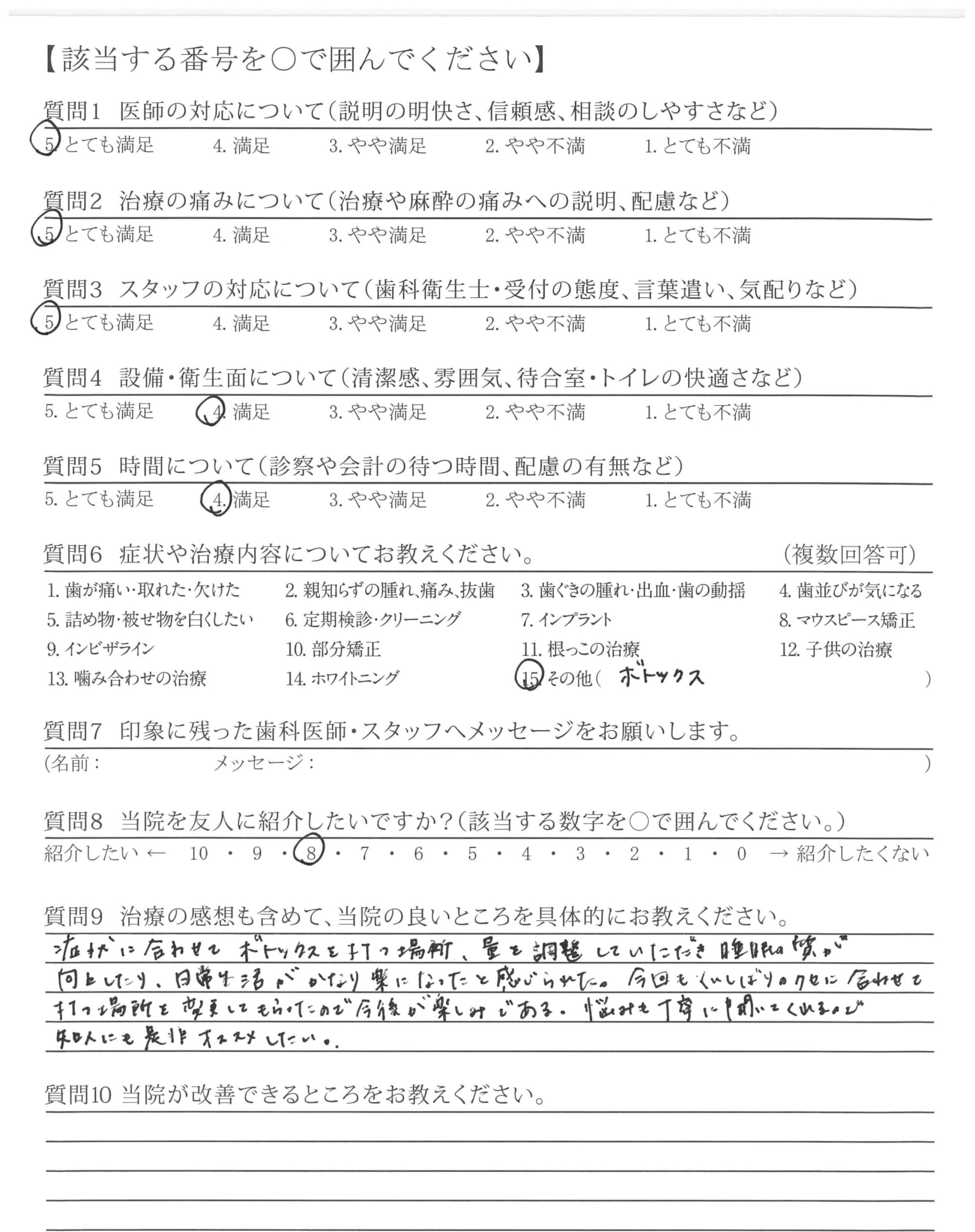 短い時間でしたが、事前の説明もわかりやすく、安心してボトックスを受けられました。