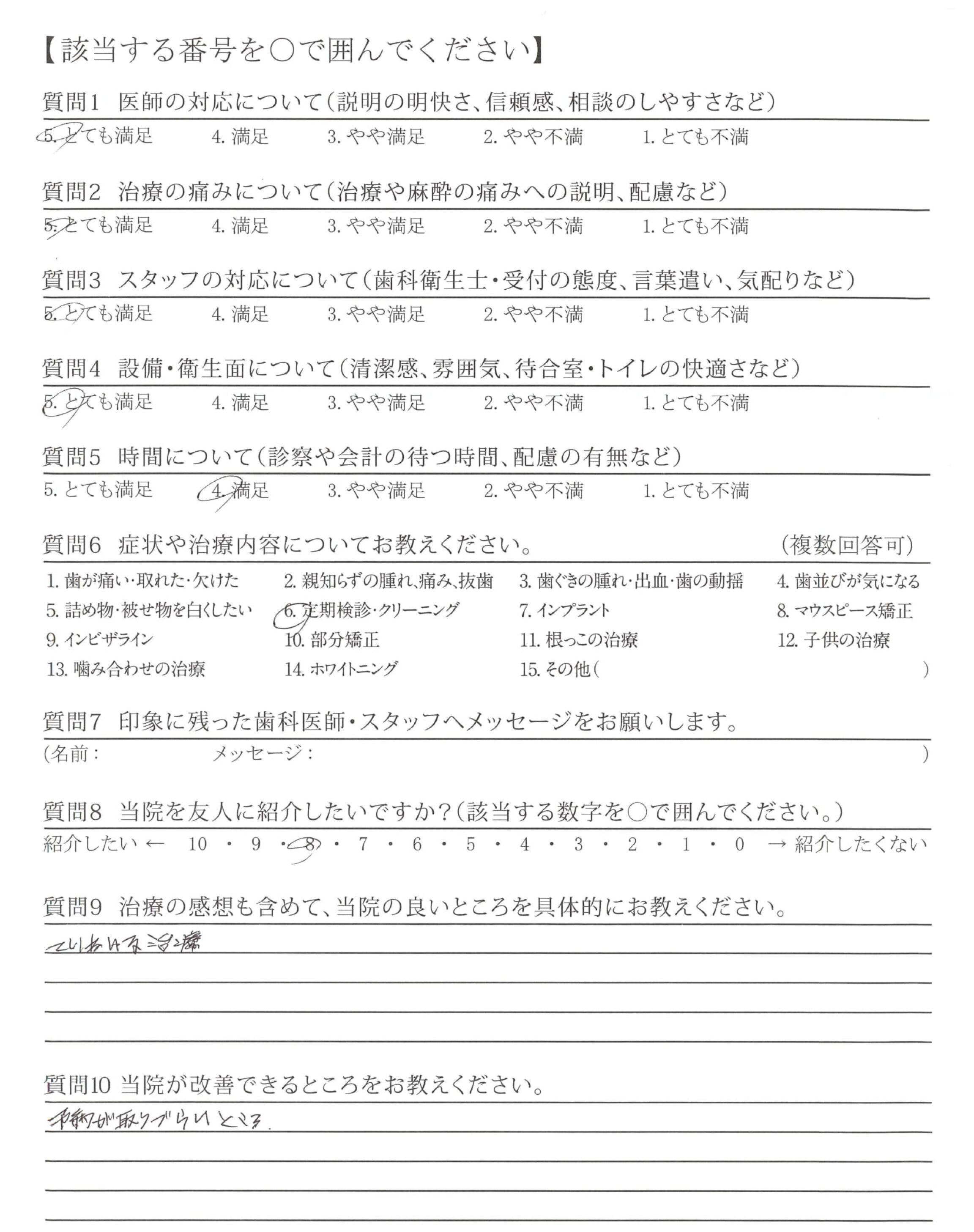 ・自分が悩んでいた事に対して、とても細かく検査をしてくれて、それに対して治療をして頂いたので、とても納得しました、他の歯医者さんがどうかわかりませんが、最新のアプローチをしてると感じました。歯医者選びに迷っている方は、"ここを選べば間違いない"です。