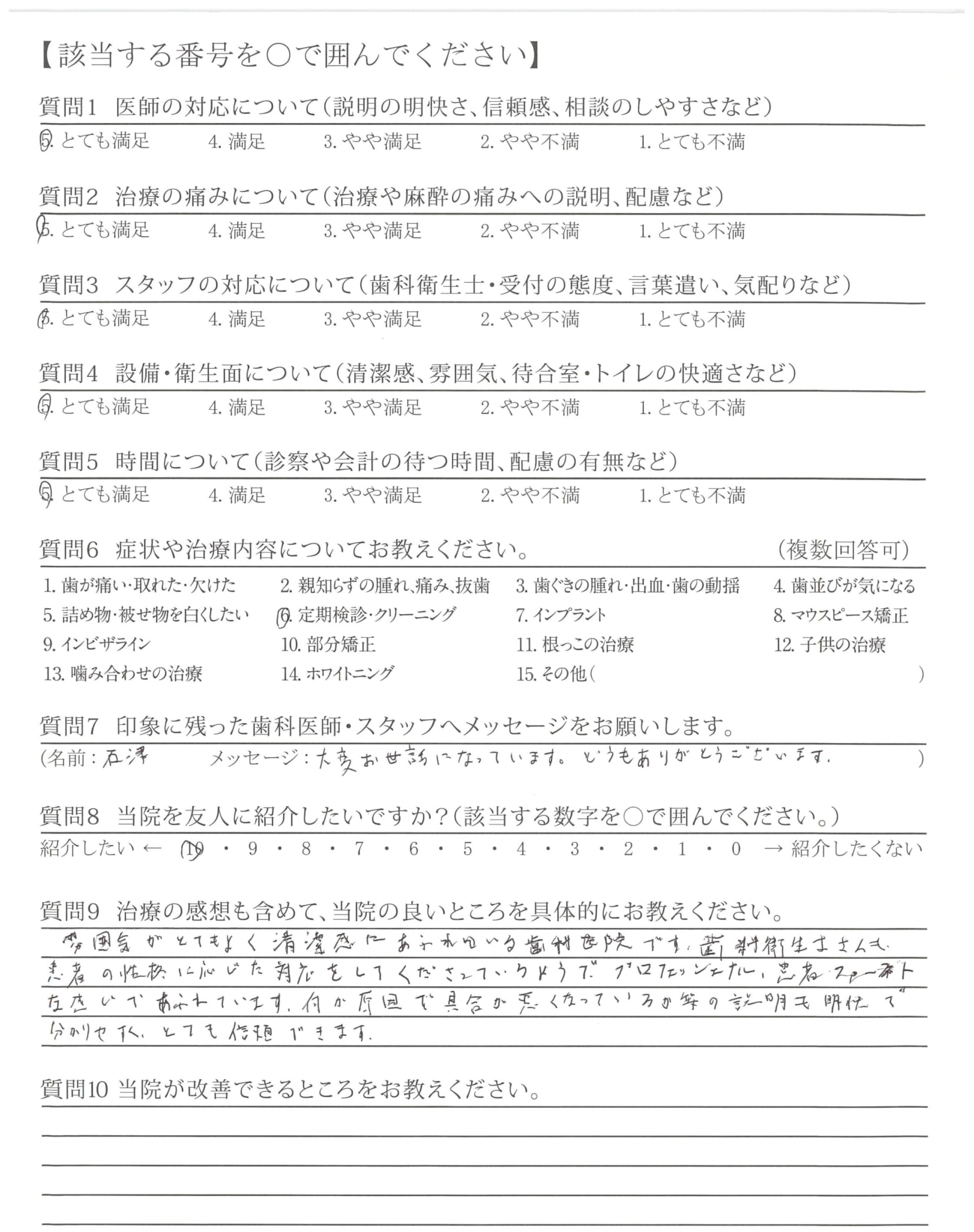 院長先生は、とても研究熱心でいつも最先端の治療をして下さいます。口の中が快適というのは何にもまさる事でありがたいです。