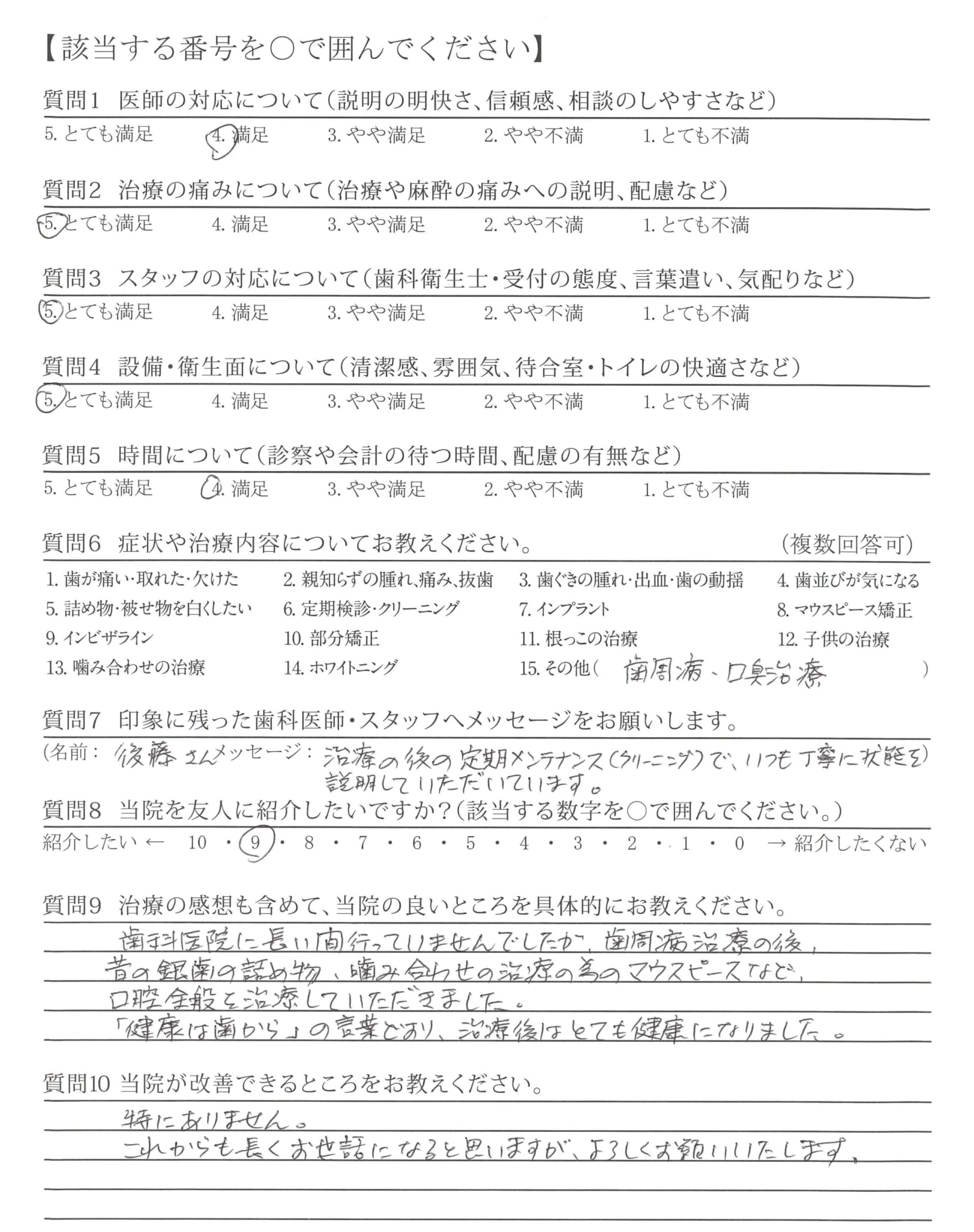 歯科医院に長い間行っていませんでしたが、歯周病治療の後、昔の銀歯の詰め物、嚙み合わせの治療の為のマウスピースなど、口腔全般を治療していただきました。