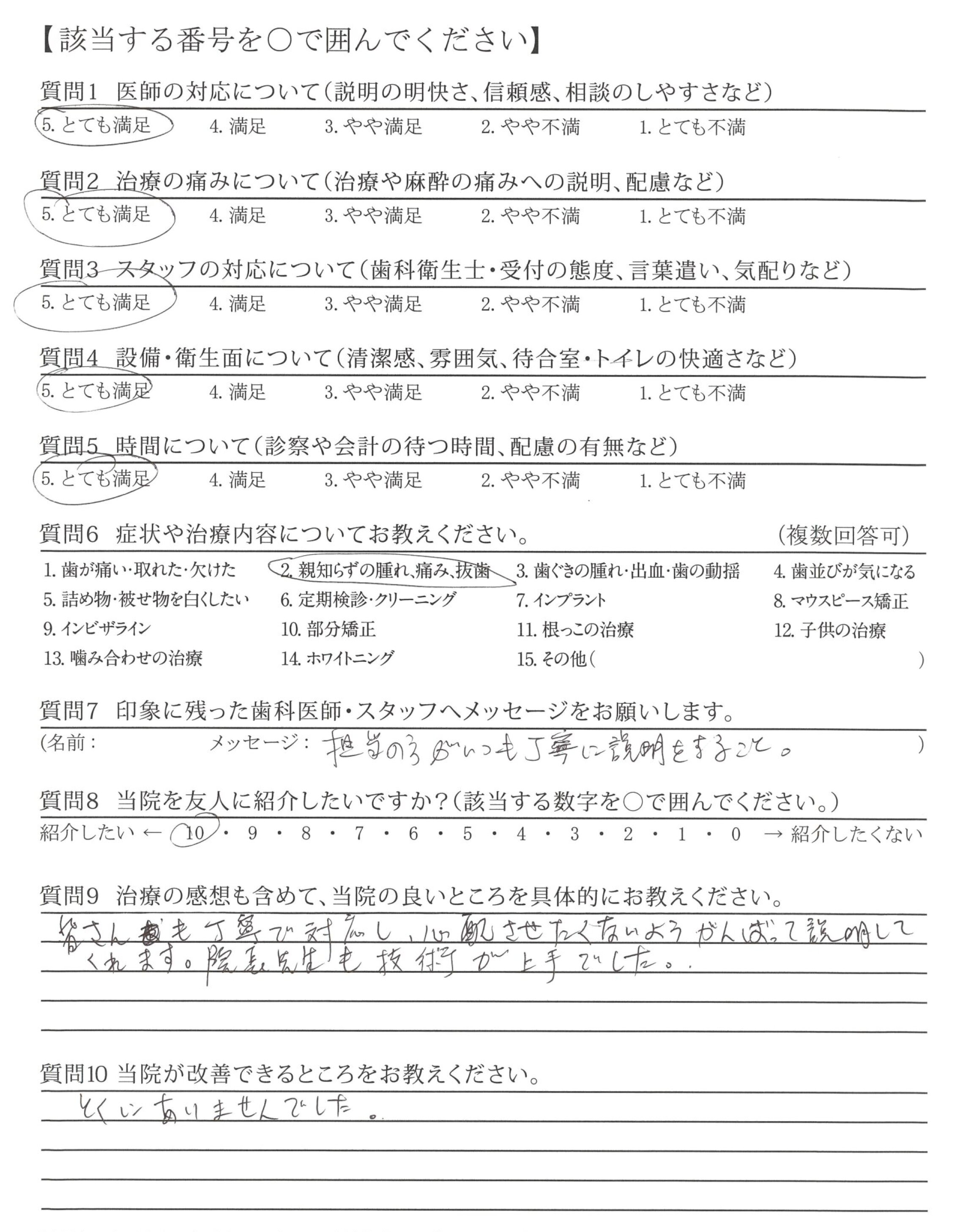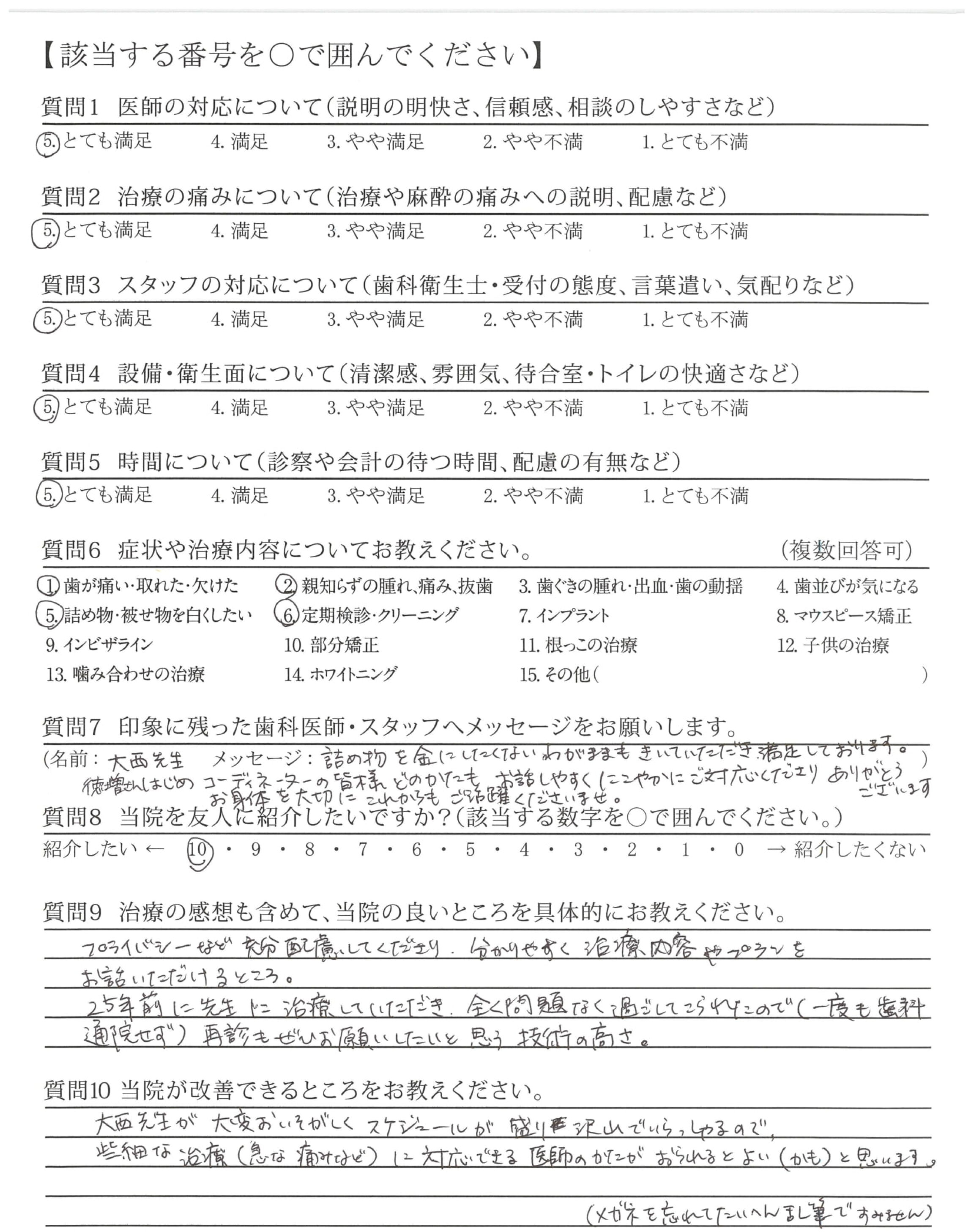 ・過去の治りょうも丁寧な説明とともに長びくことなく治りょう完了、最先端の工夫をして頂き、健康な口腔環境が維持できているのは、大西先生以下スタッフのみなさんのおかげです。