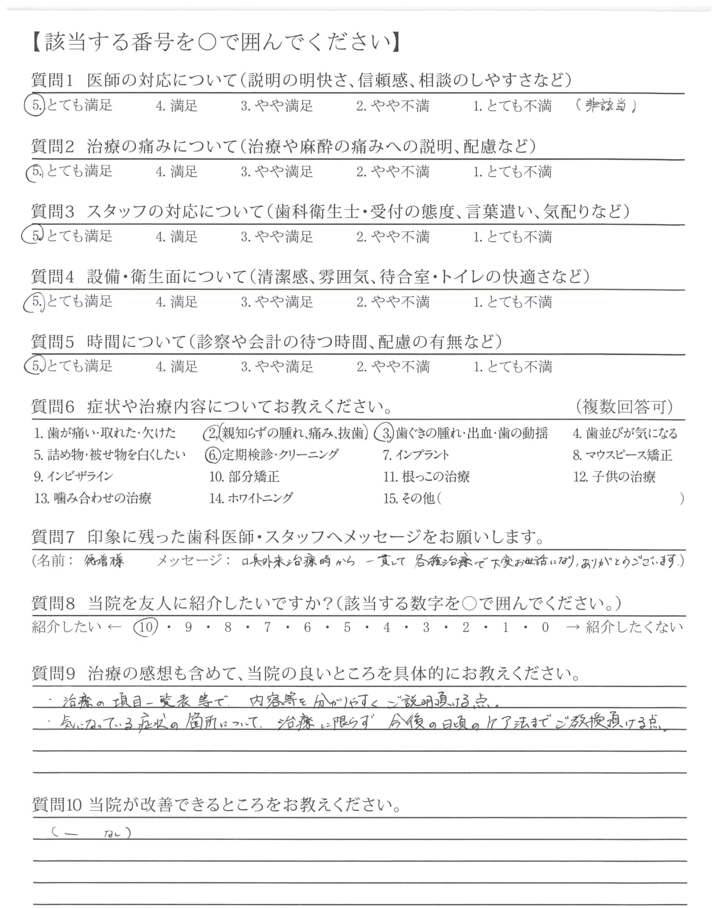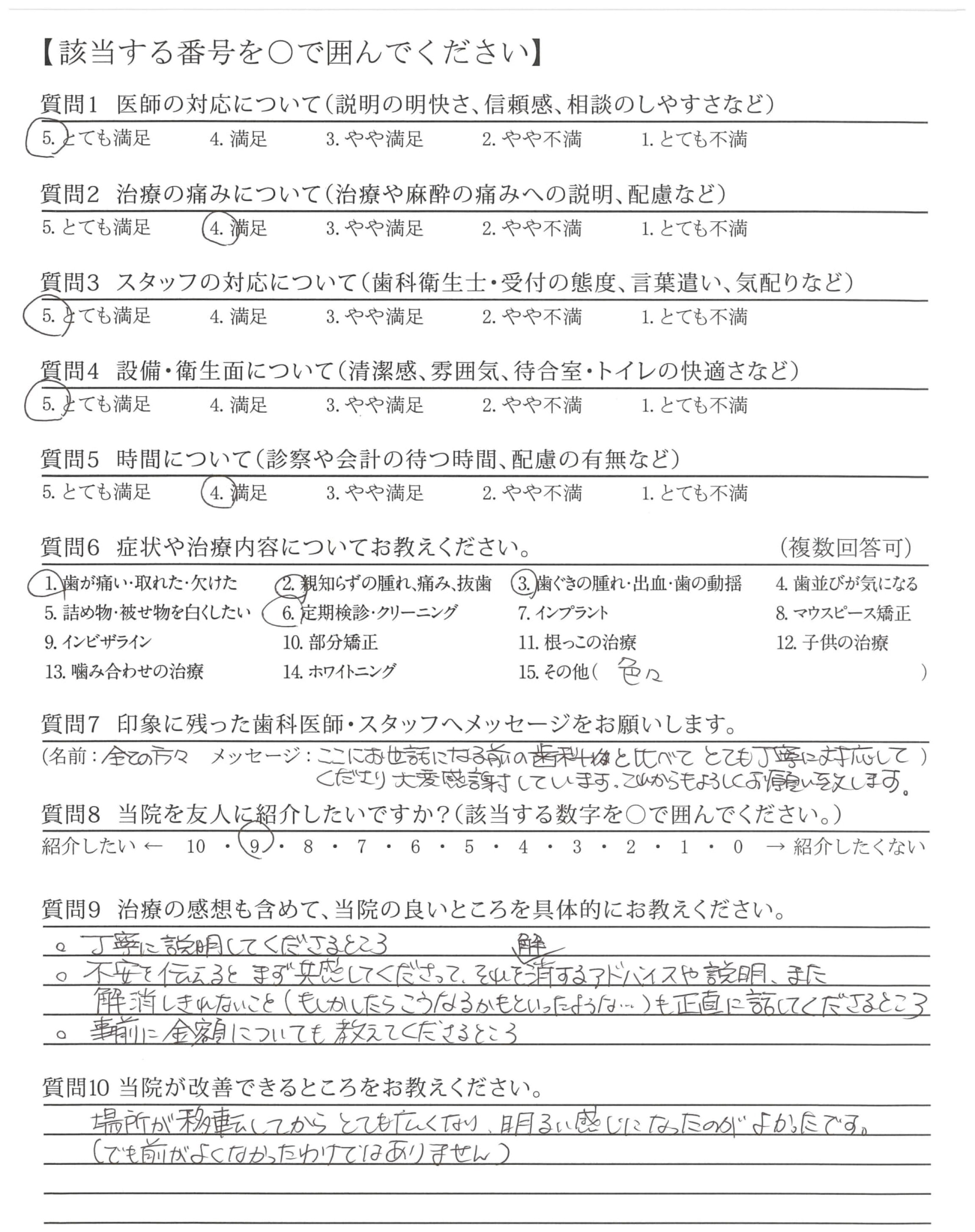 ・長期間不具合があり、とても複雑な治療だったと思いますが、順序立てて、きっちりと治療していただき、とても感謝しております。