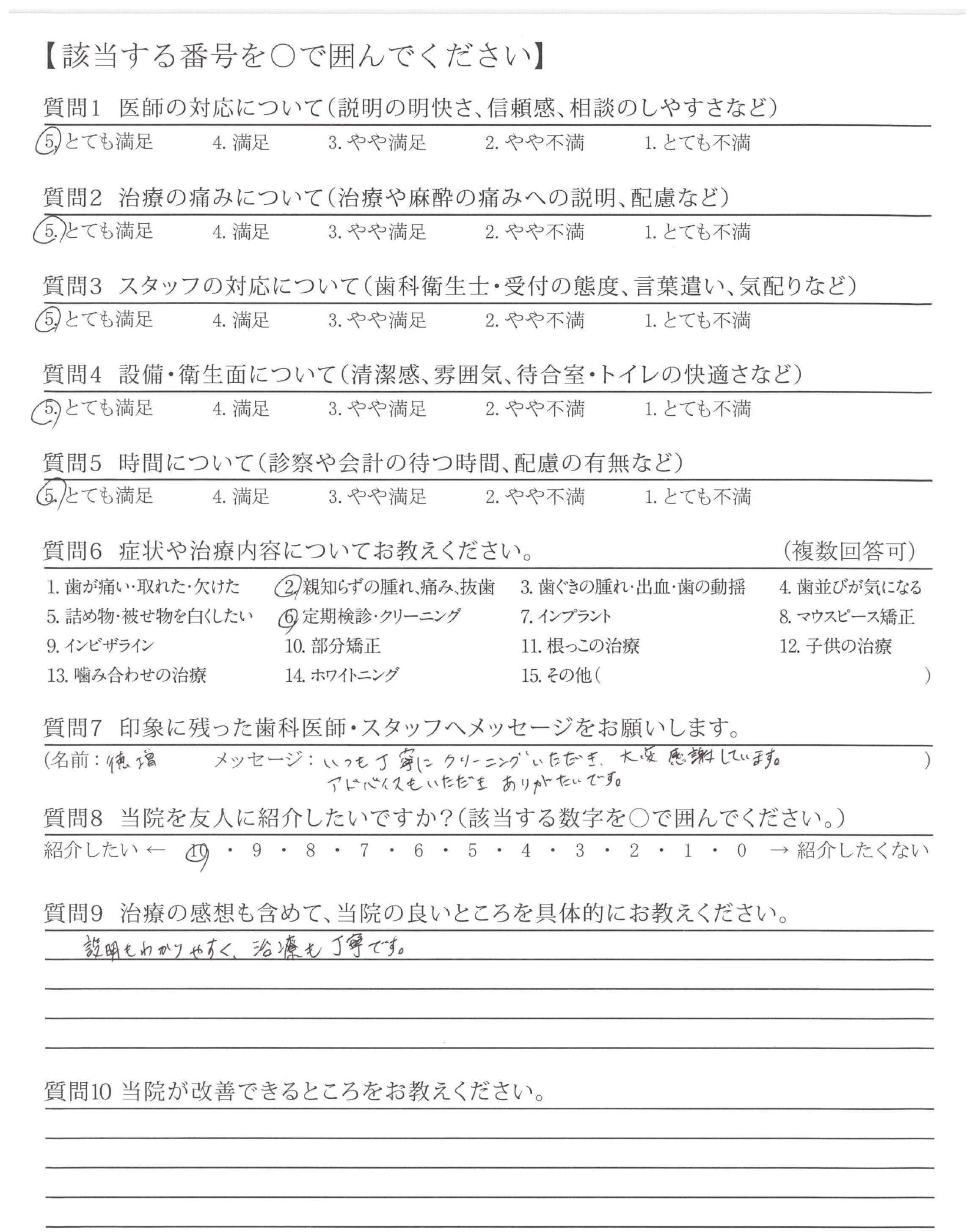 院長先生の治療のおかげで以前何度も問題があったかぶせものもこちらで治療して頂いてから歯の調子が良くなりました。石津さんには定期的にクリーニングをして頂き、丁寧で手際良くしてもらっており、感謝しています。今後もよろしくお願いします。
