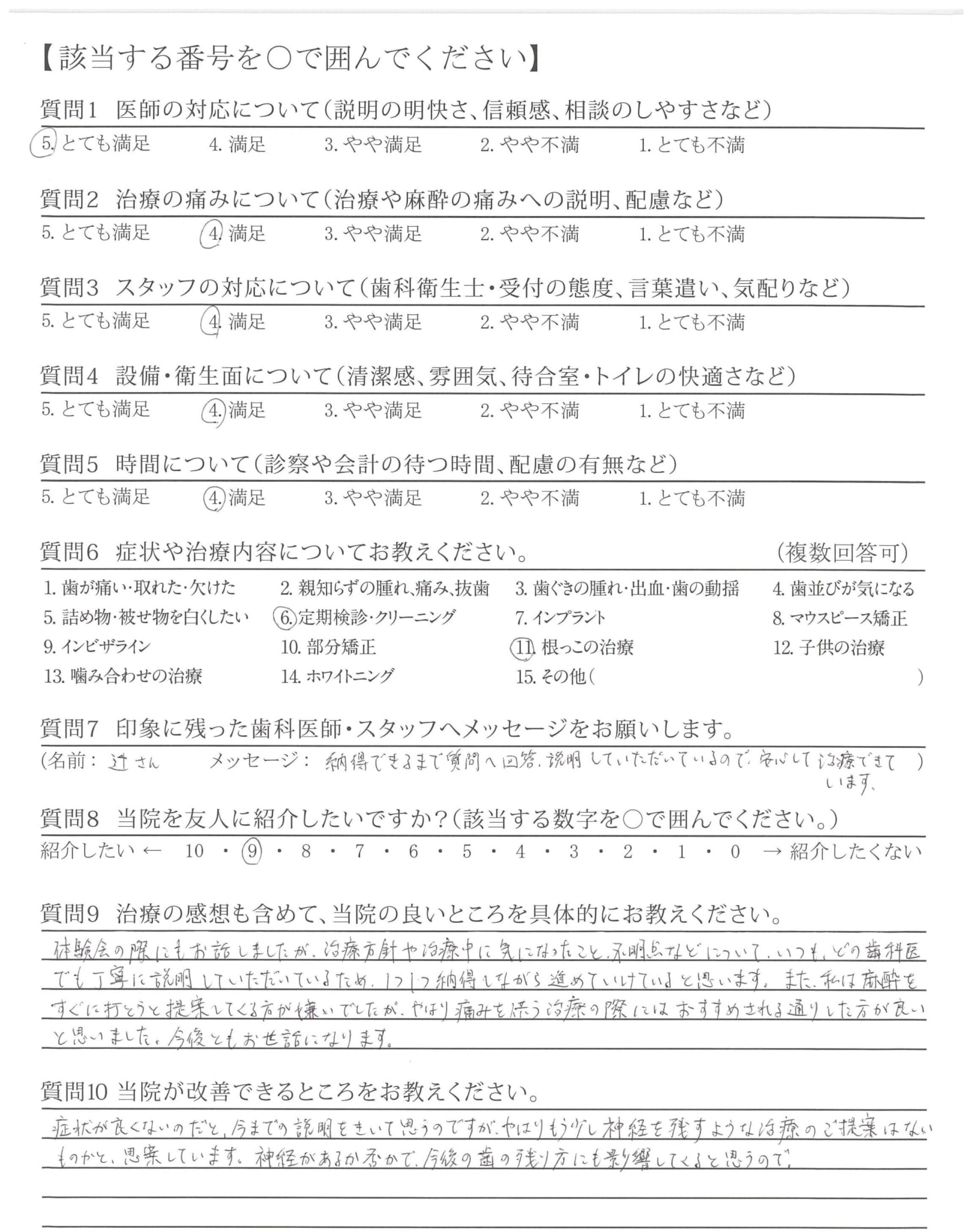 体験会の際にもお話しましたが、治療方針や治療中に気になったこと、不明点などについて、いつも、どの歯科医でも丁寧に説明していただいているため、1つ1つ納得しながら進めていけていると思います。また、私は麻酔をすぐに打とうと提案してくる方が嫌いでしたが、やはり痛みを伴う治療の際にはおすすめされる通りした方が良いと思いました。今後ともお世話になります。