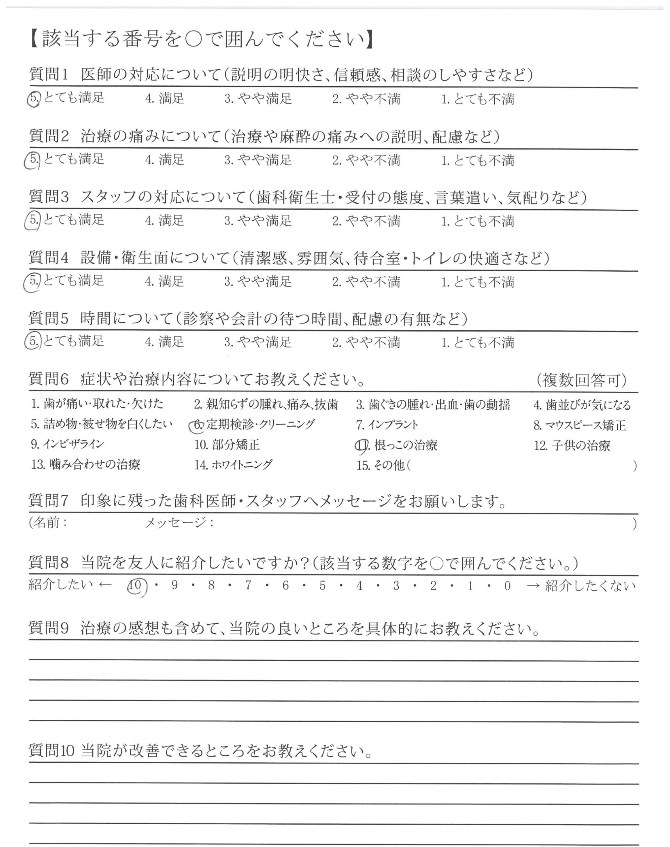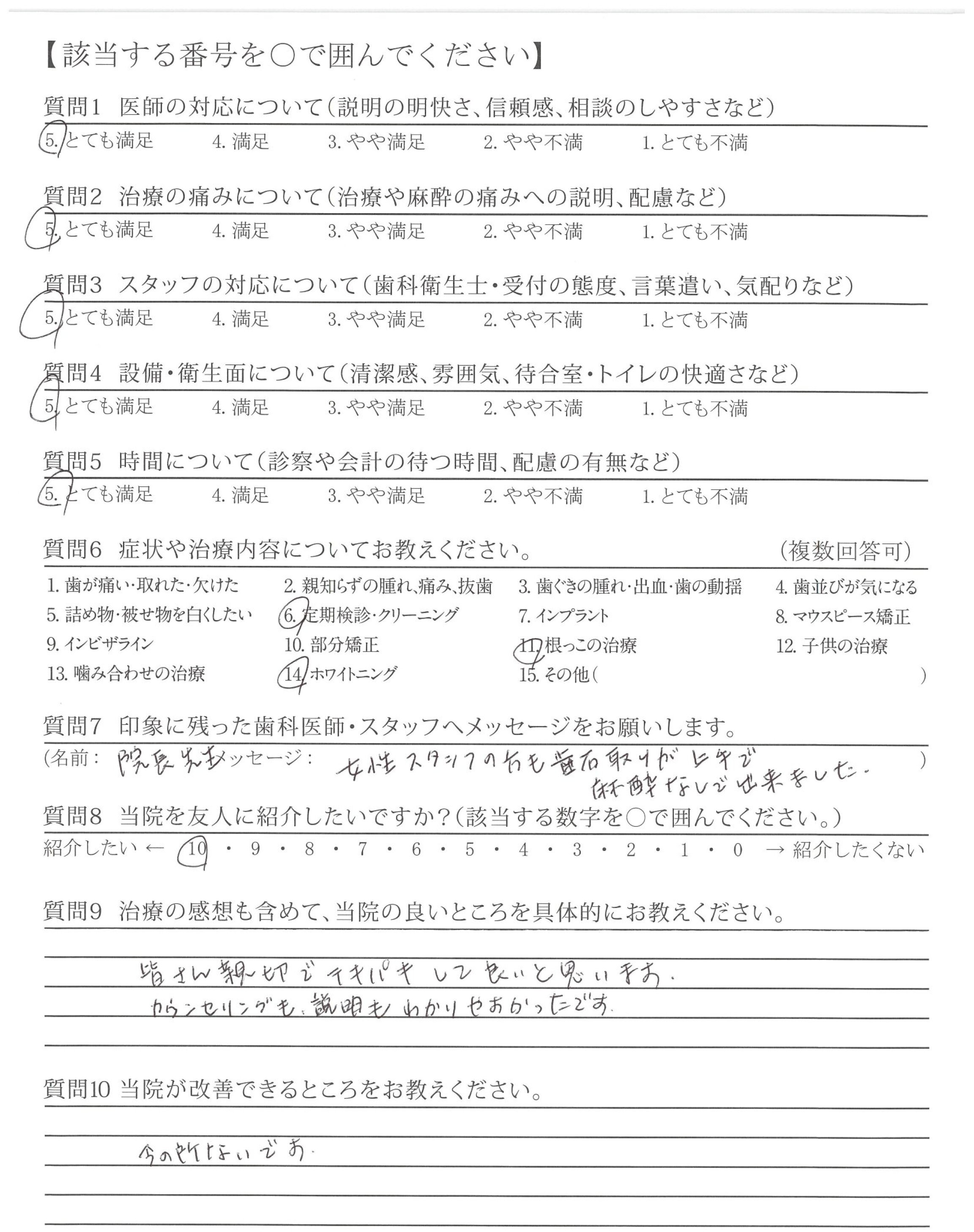 質問「医師の対応」「治療の痛み」「スタッフの対応」「設備・衛生面」「時間」ついてで「とても満足」と示した通り、悪い所を探す方が難しい程、よい医院です。