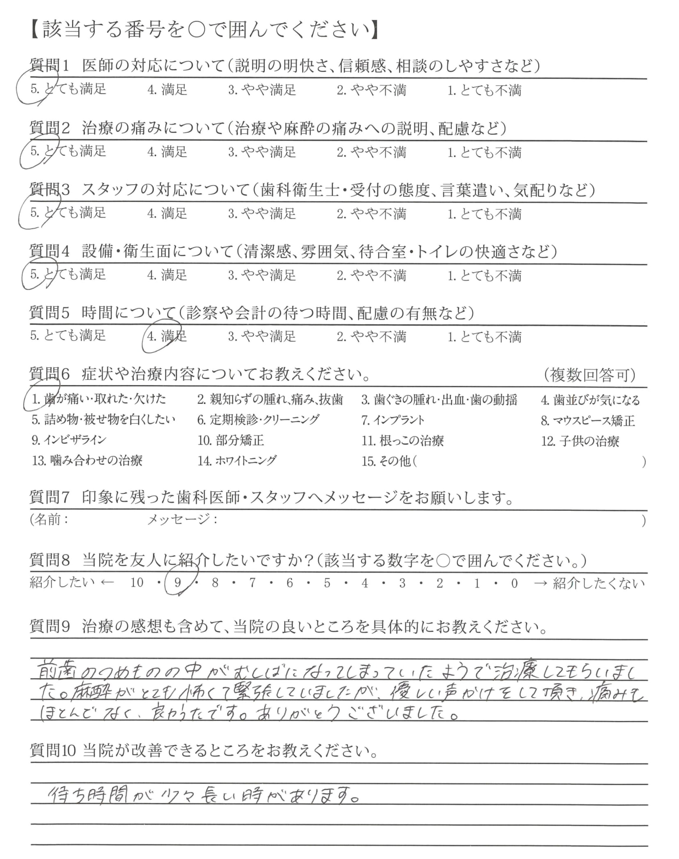 麻酔がとても怖くて緊張していましたが、優しい声かけをして頂き、痛みもほとんどなく、良かったです。ありがとうございました。