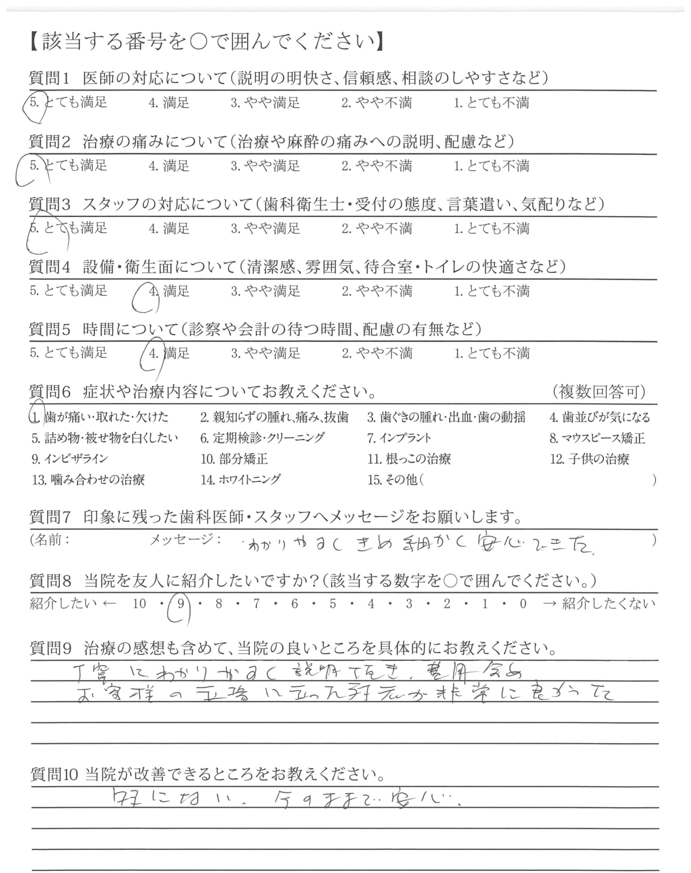 1回目の欠けた歯の治療も痛みを感じずできましたし、2回目のクリーニングも歯科衛生士さんがとてもご丁寧に説明してくださり、分かりやすかったです。また、定期検診でお世話になりたいです。