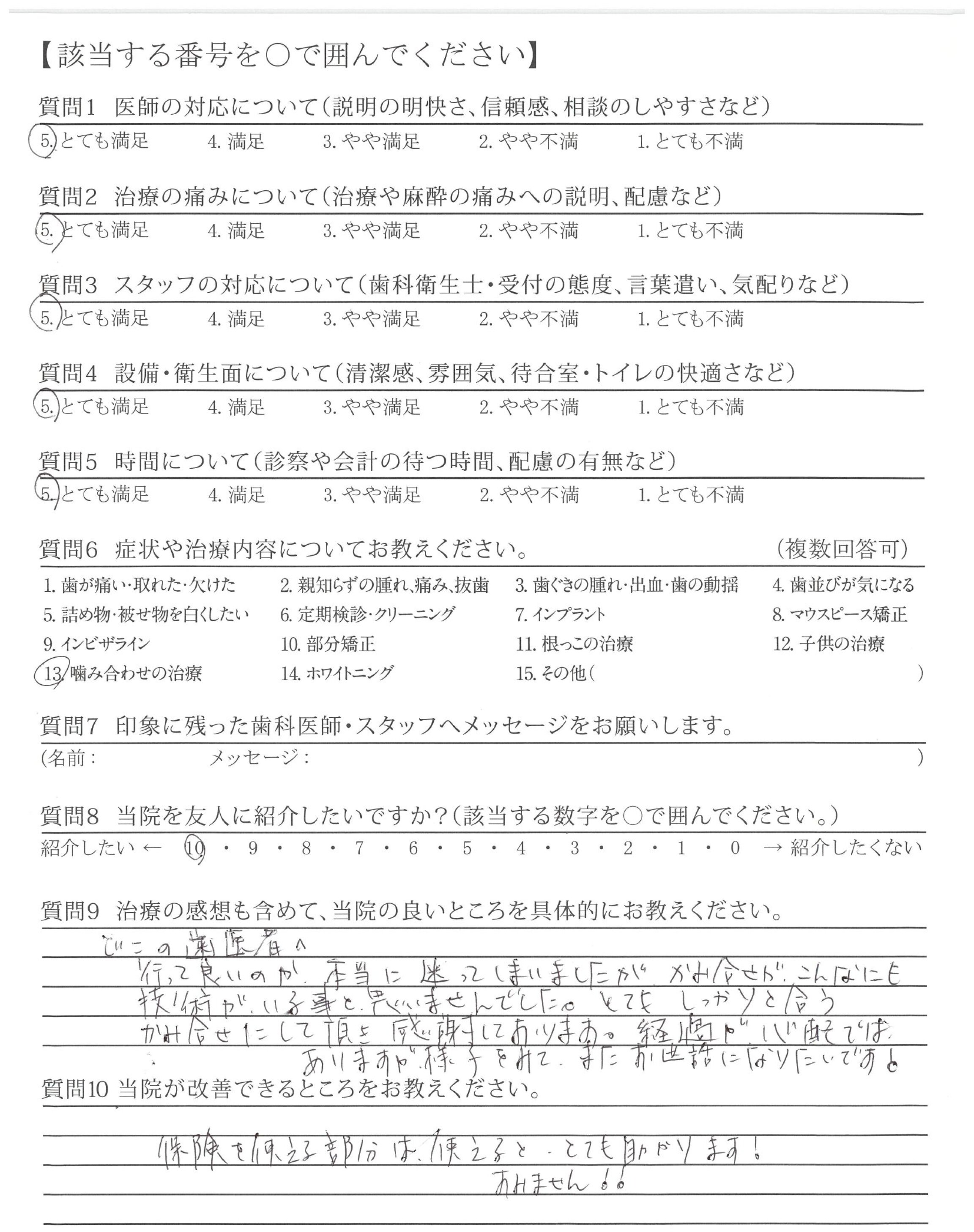 どこの歯医者へ行って良いのか、本当に迷っていましたが、かみ合わせが、こんなにも技術が、いる事と、思いませんでした。とてもしっかりと合うかみ合わせにして頂き感謝しております。経過が、心配ではありますが、様子をみて、またお世話になりたいです!