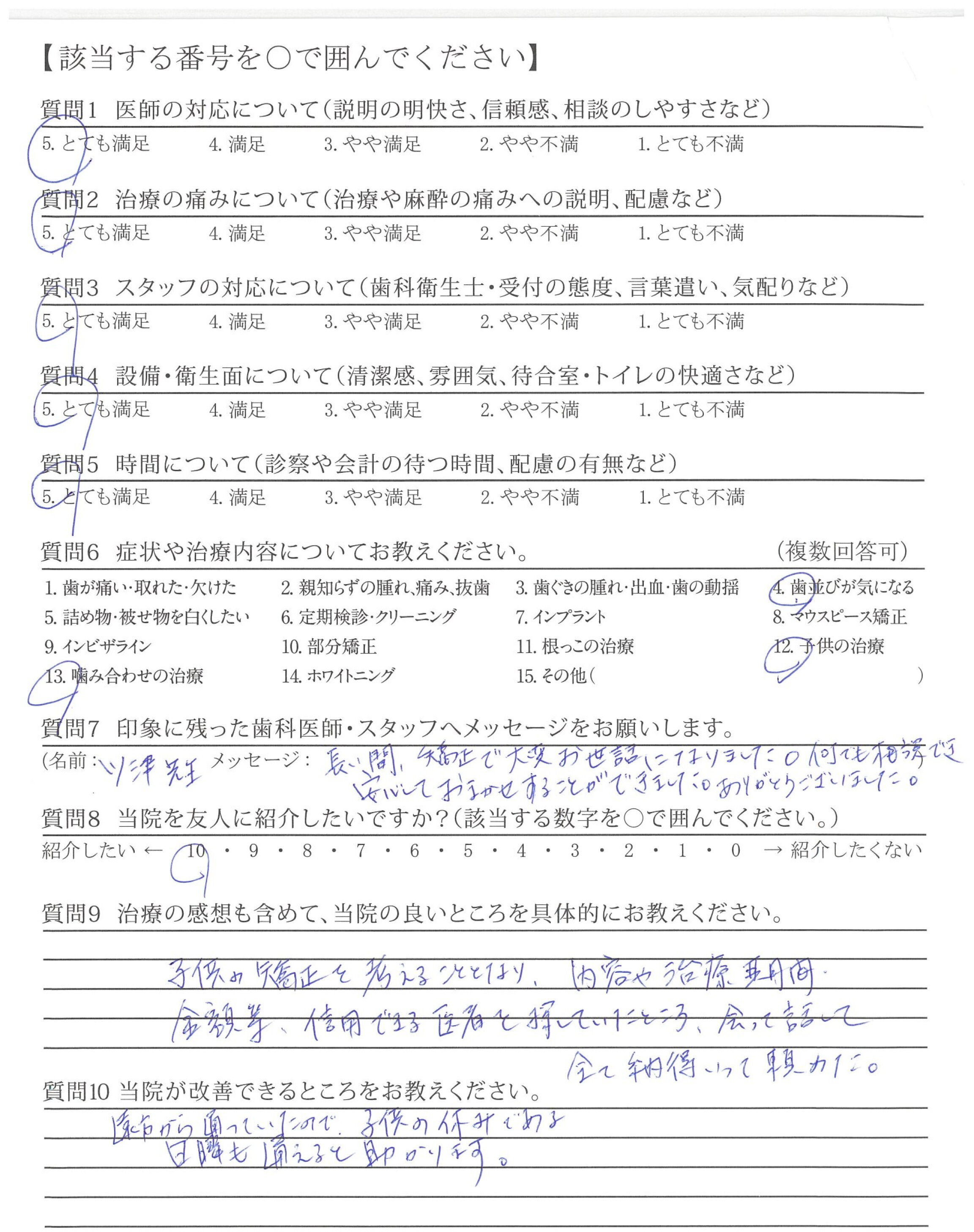 最初は矯正が不安でしたが、丁寧にお答え頂き、今では安心してお任せしています。子供達は、歯並びが綺麗になり喜んでおります。