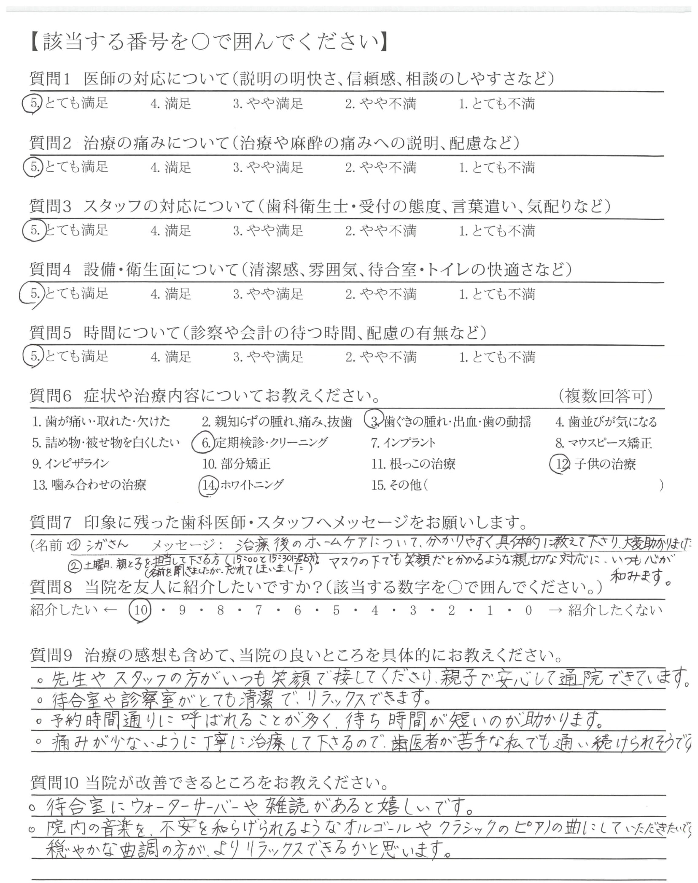 いつもいつもとてもていねいにして下さいますし、全く治療が怖くないです。先生にも相だんしやすいです。