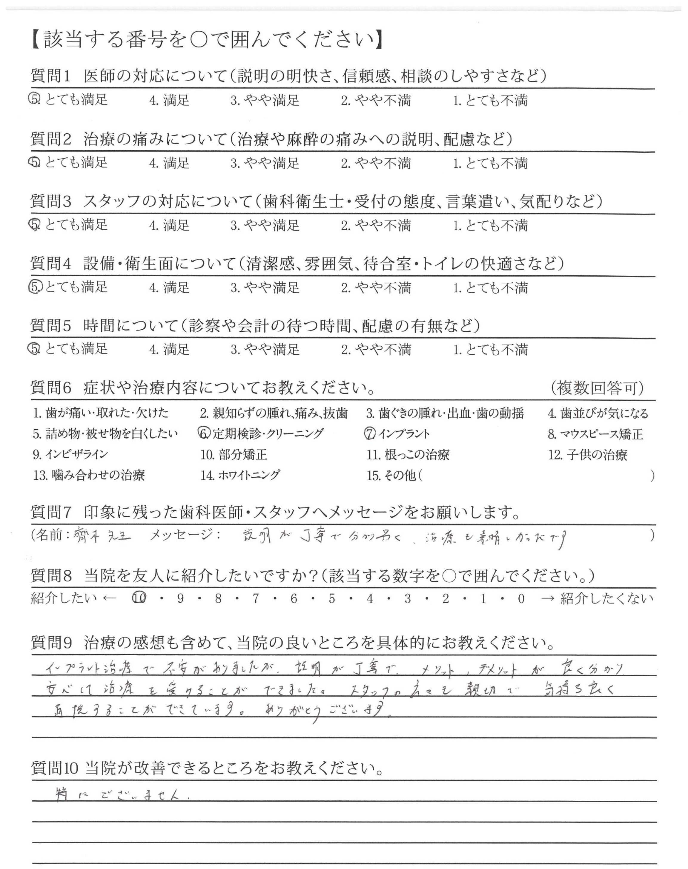 インプラント治療で不安がありましたが、説明が丁寧で、メリット、デメリットが良く分かり安心して治療を受けることができました。