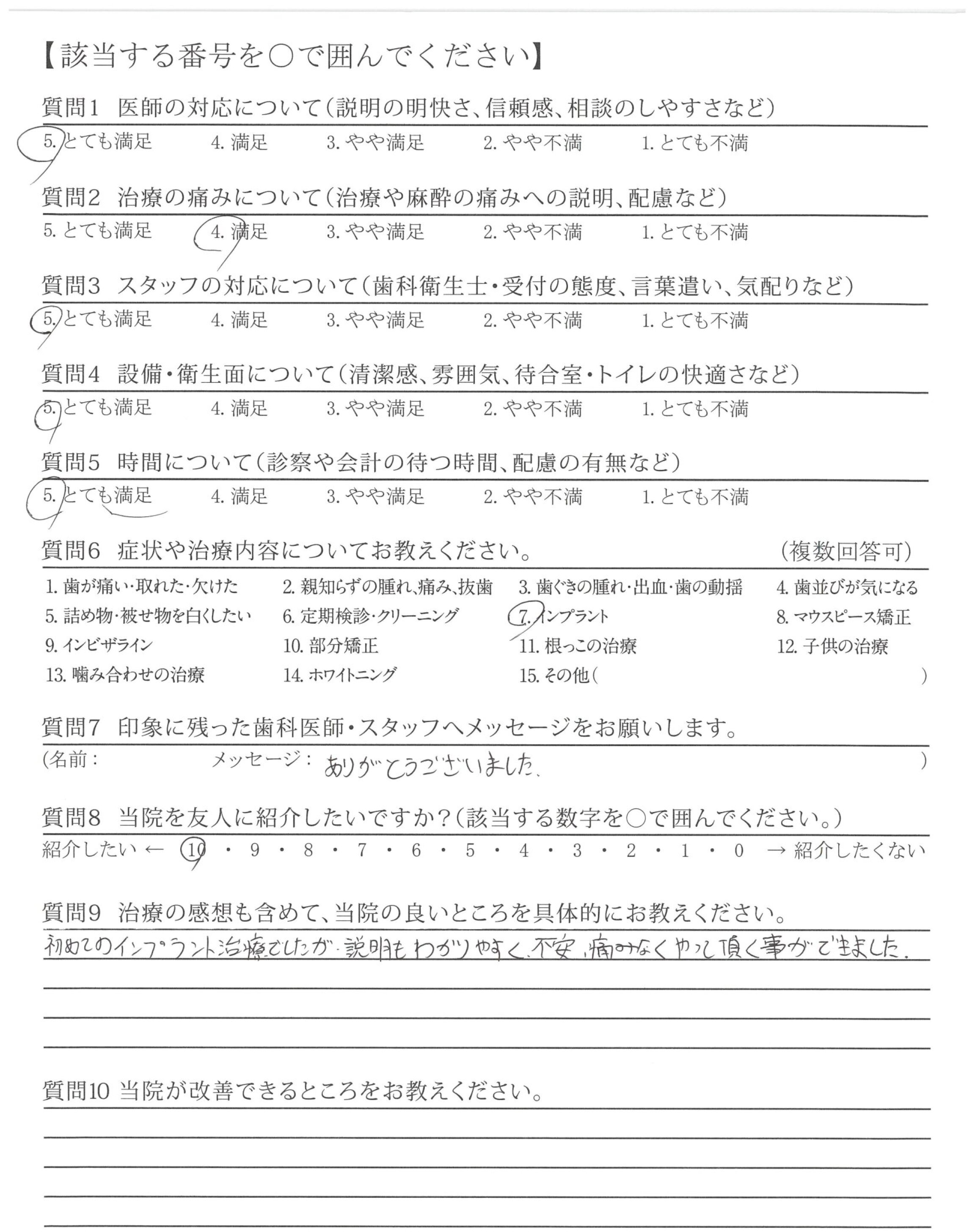 初めてのインプラント治療でしたが、説明もわかりやすく、不安、痛みなくやって頂く事ができました。