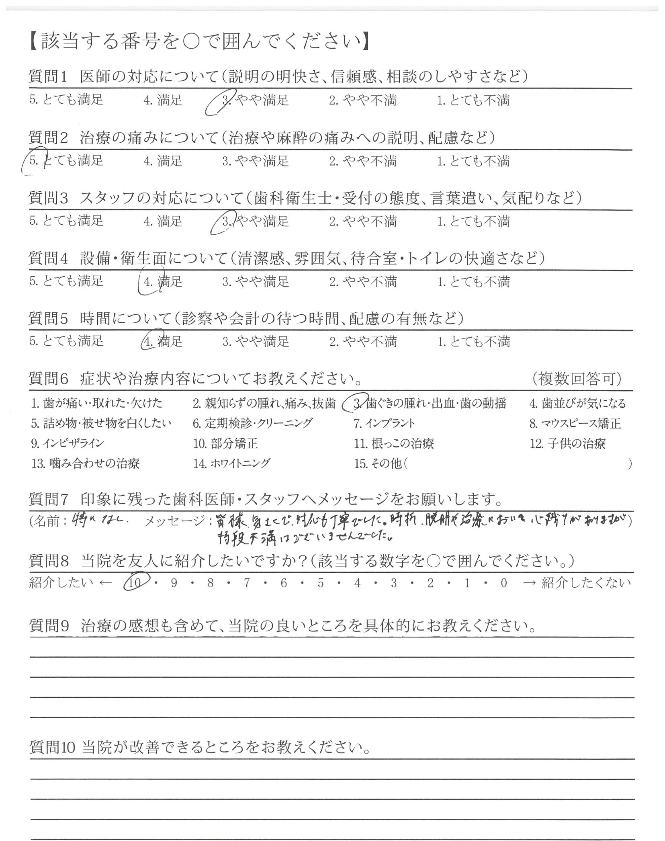 気さくで対応も丁寧でした。時折、説明や治療において心残りがありますが特段不満はございませんでした。