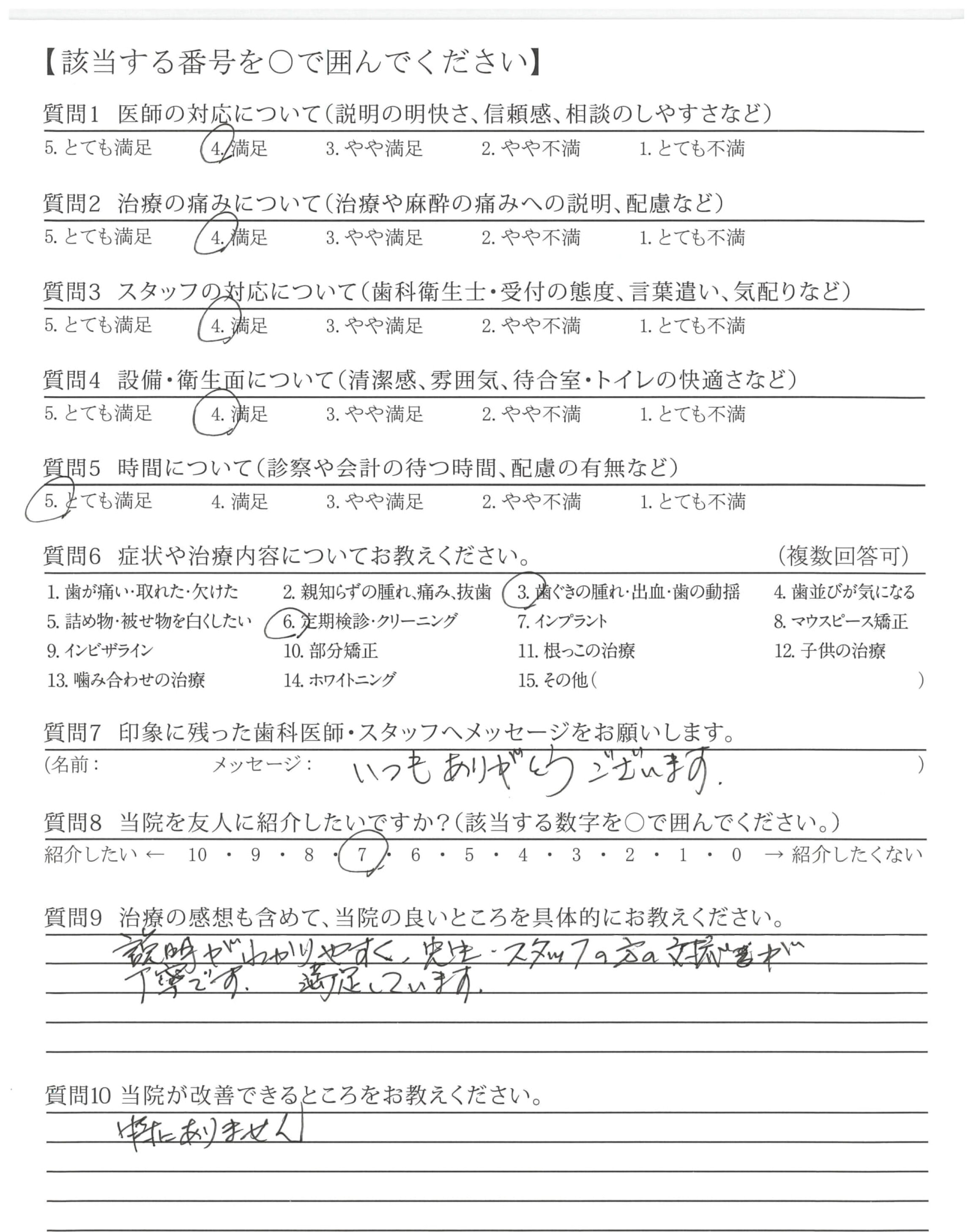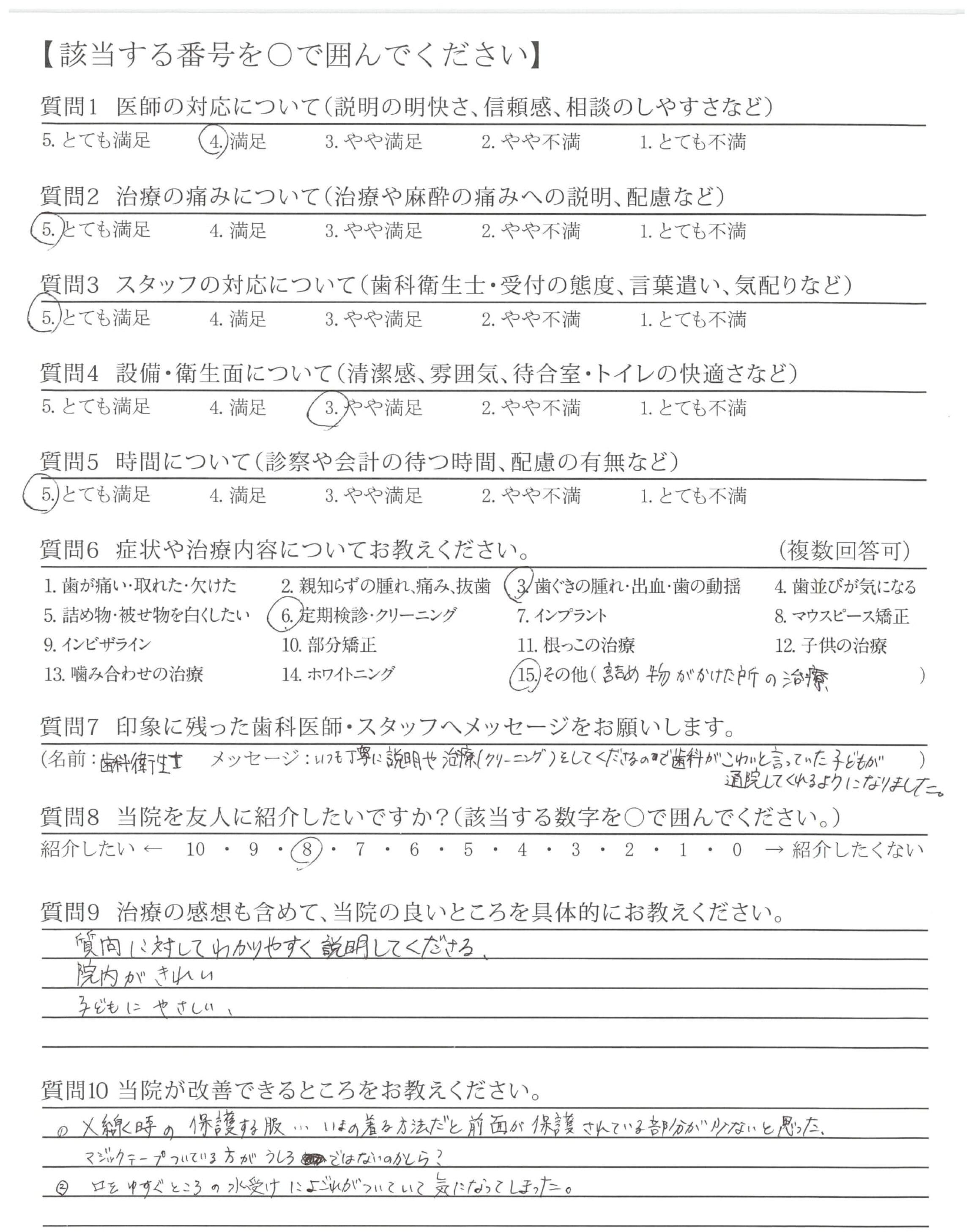 ・今までで一番時間をかけてしっかりクリーニングをしていただき驚くほどでした。2回目以降も改善した点を説明していただいたため、家での歯みがきに生かせていると思います。