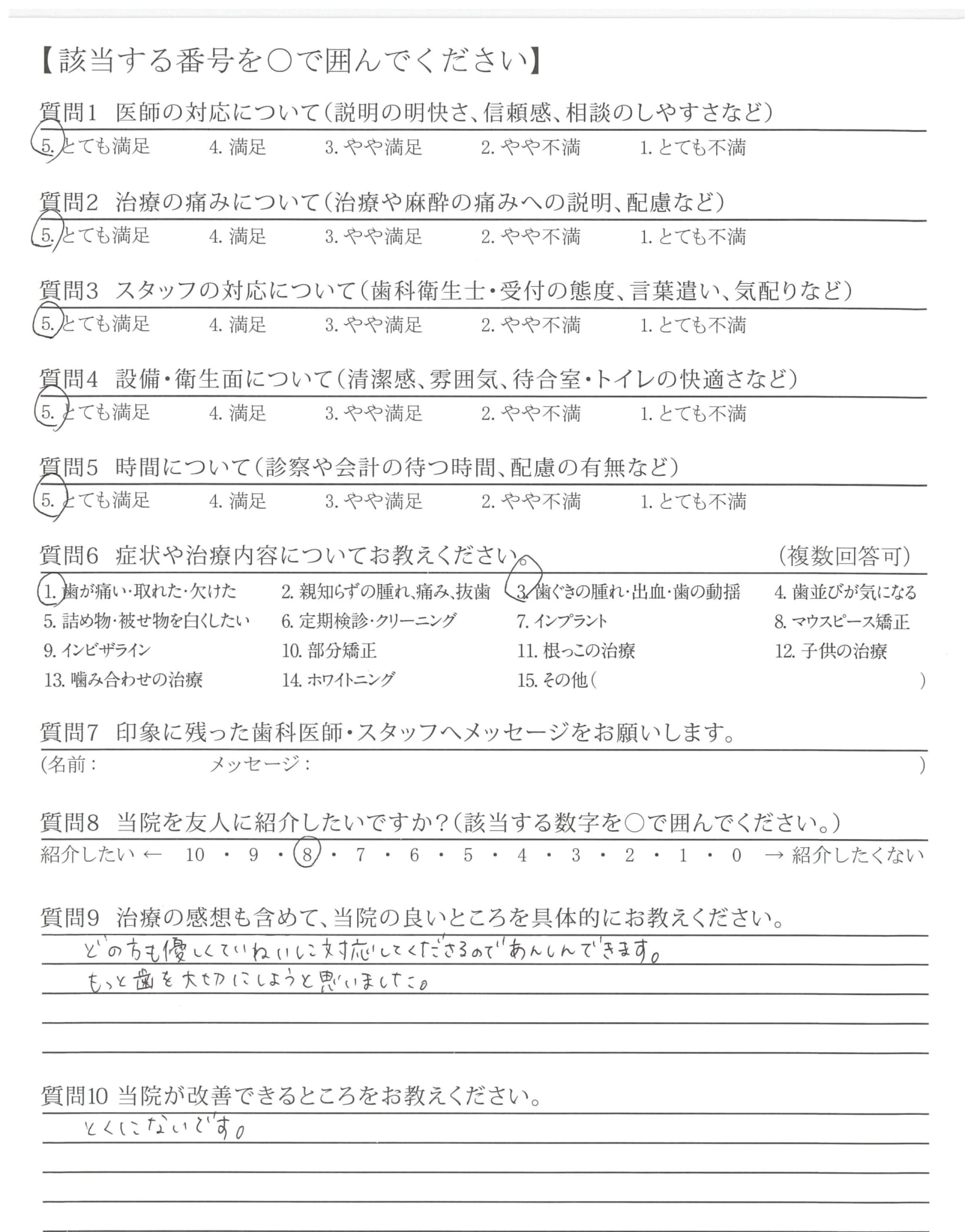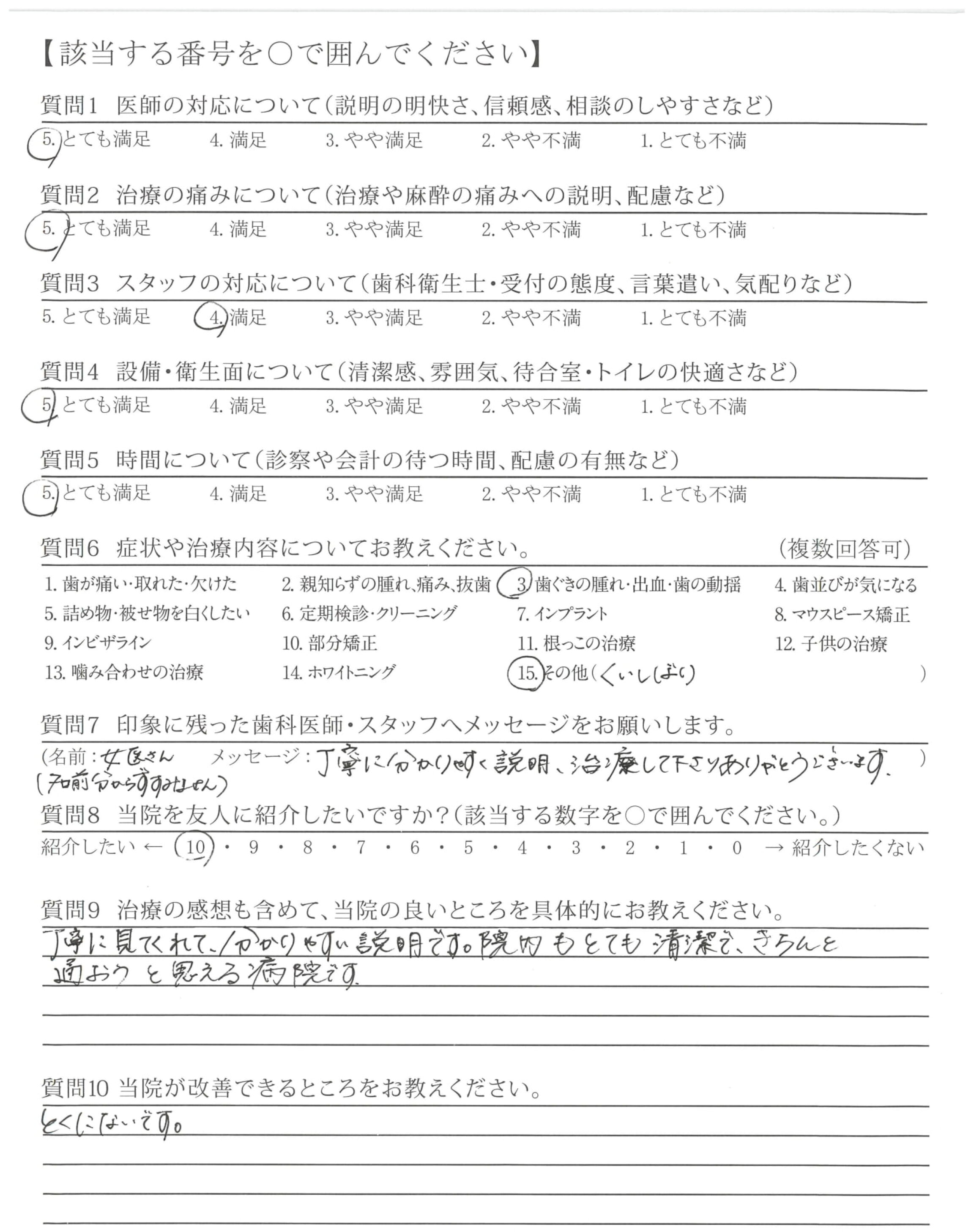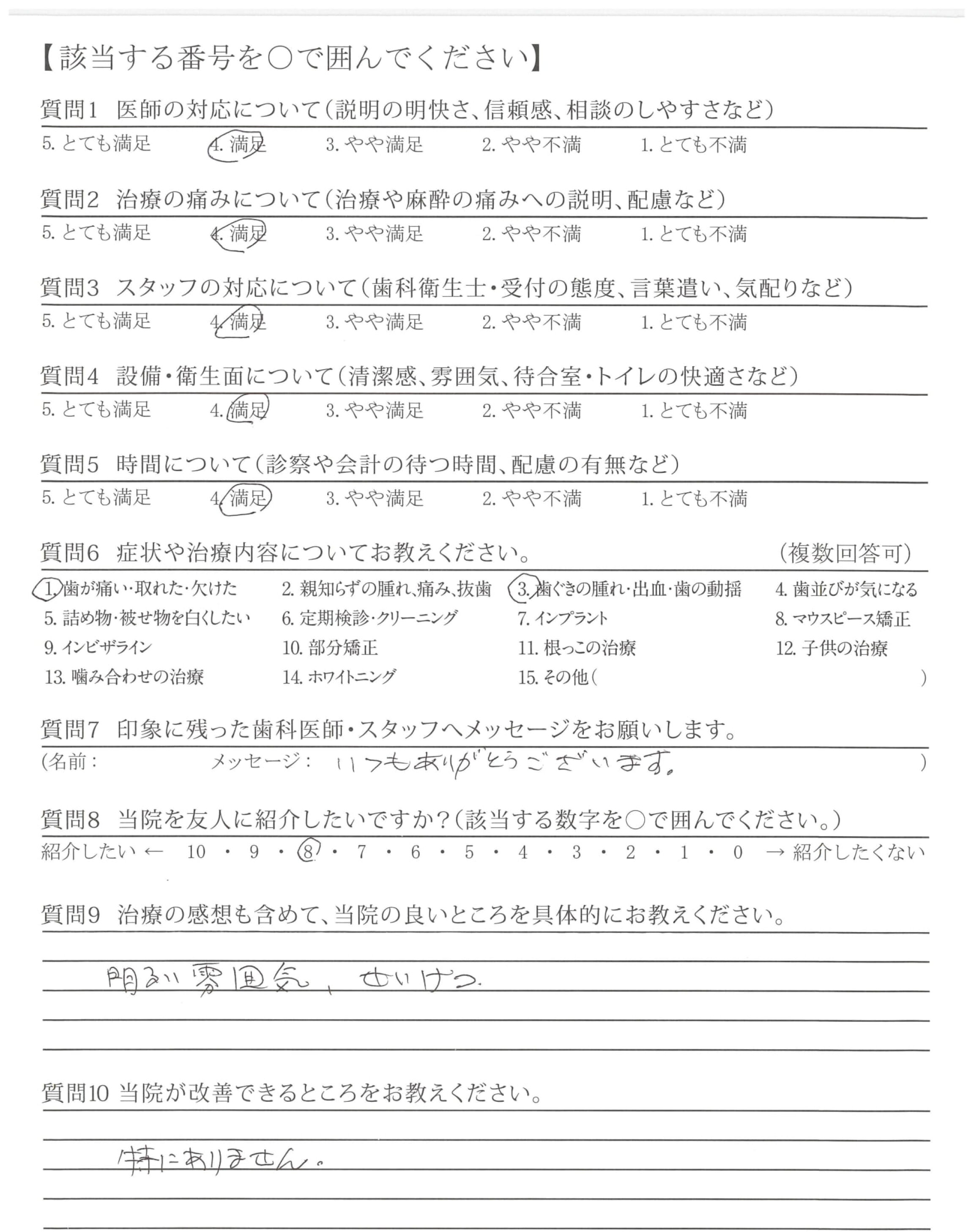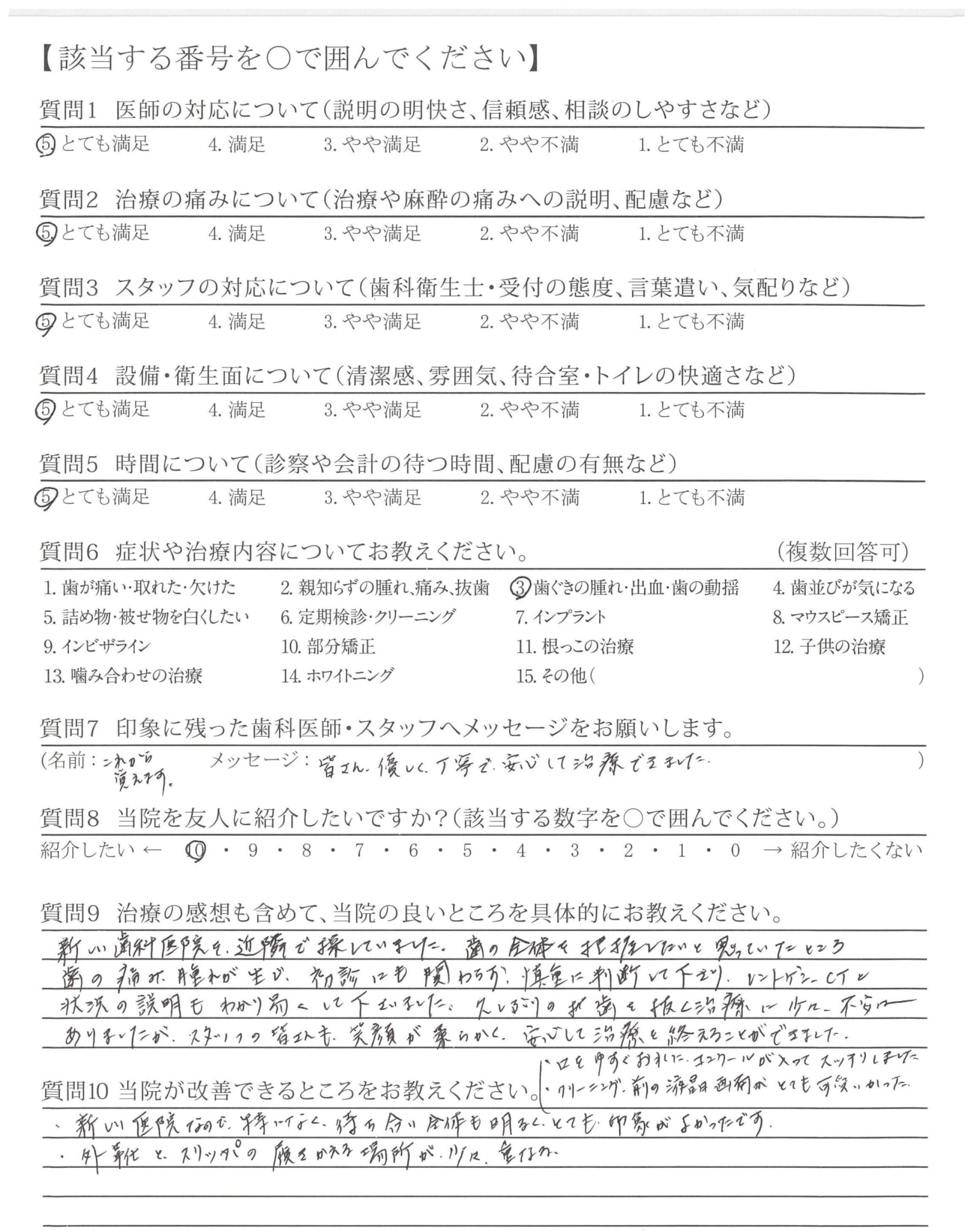 久しぶりの歯を抜く治療に少々、不安はありましたが、スタッフの皆さんも、笑顔が柔らかく、安心して治療を終えることができました。
