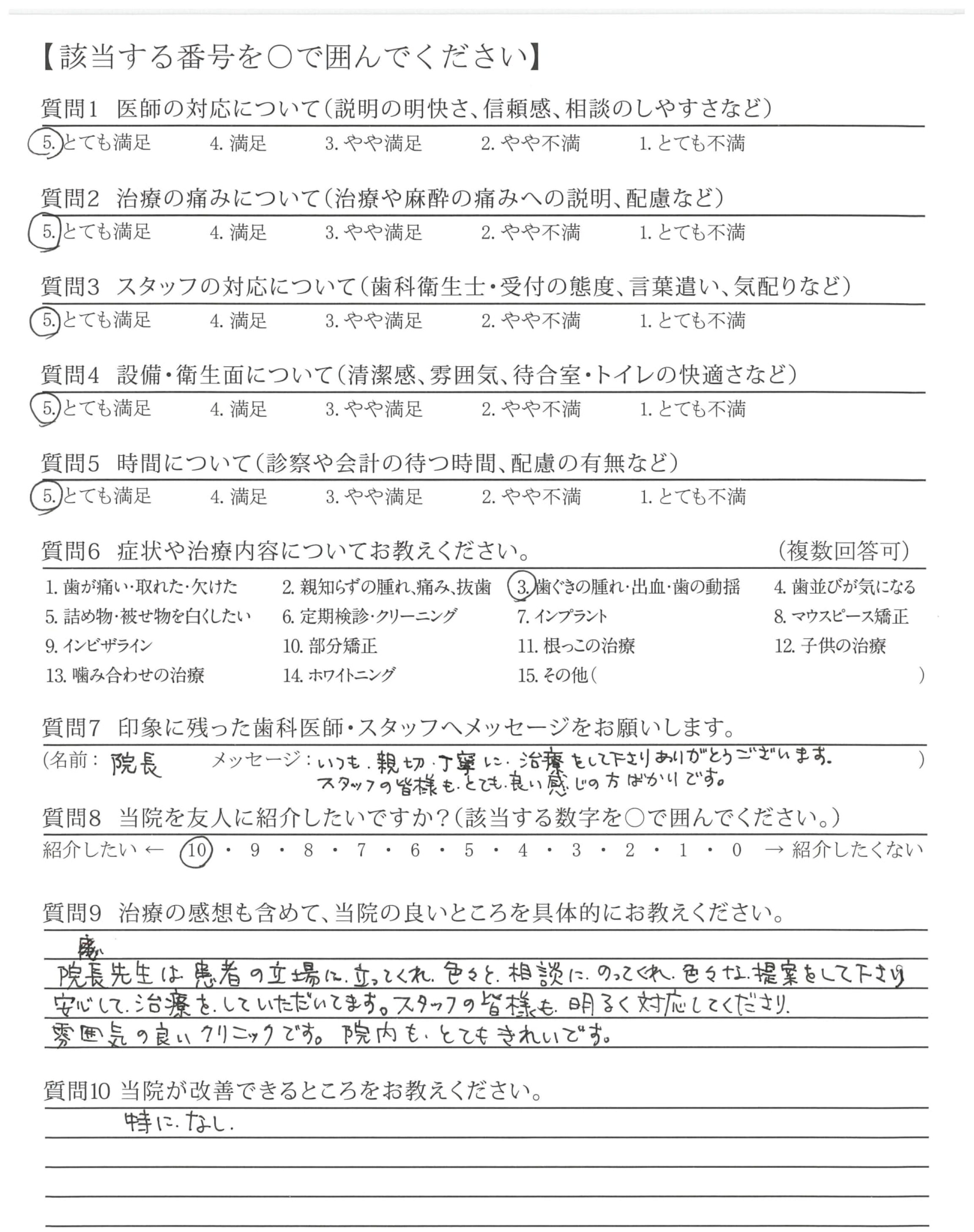 院長先生は患者の立場に立ってくれ、色々と相談にのってくれ、色々な提案をして下さり安心して治療をしていただいてます。