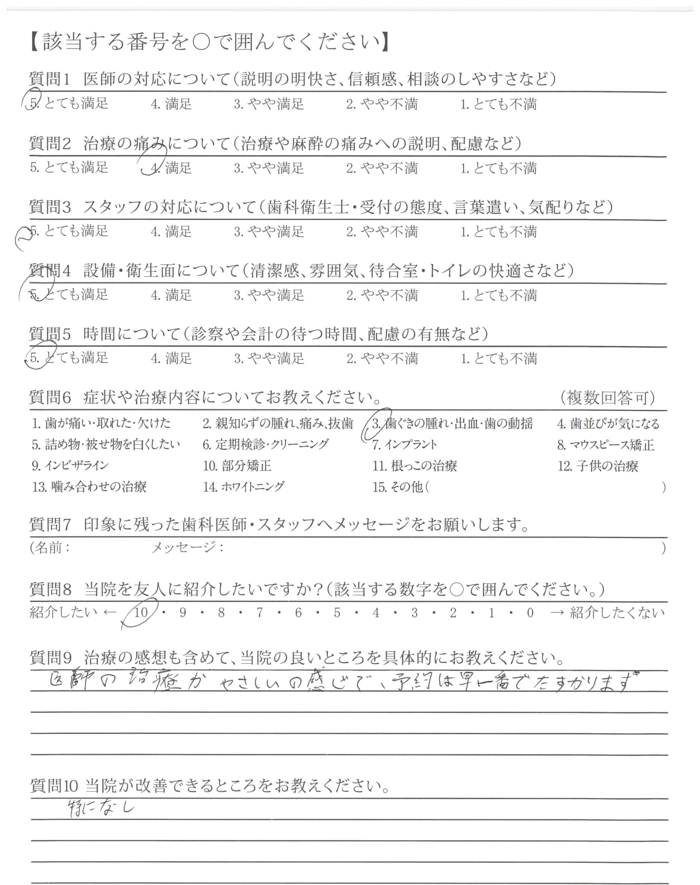 痛みの配慮、治療のすすめ方、今後の方針を説明してくださったのでとても安心して受けることができました。