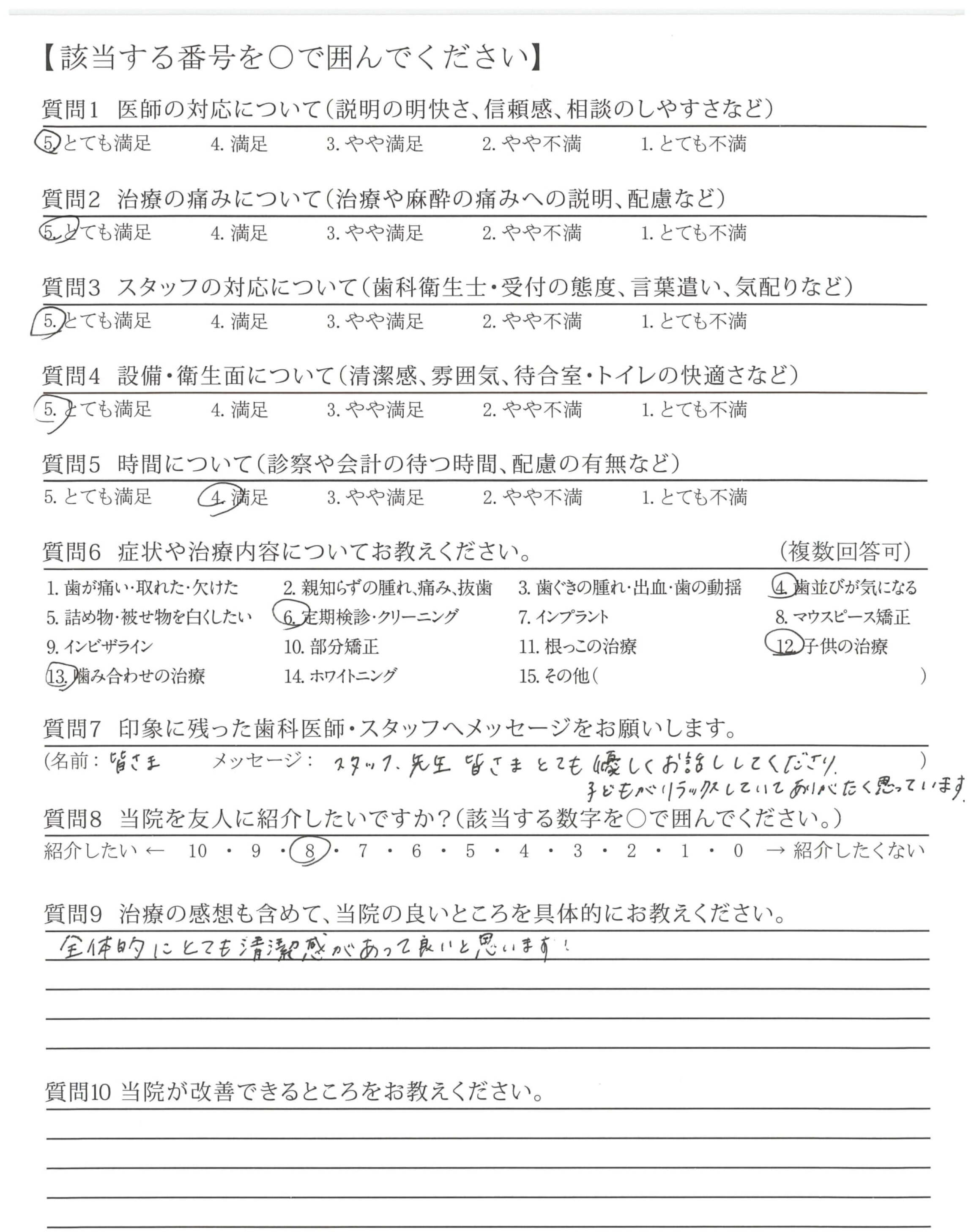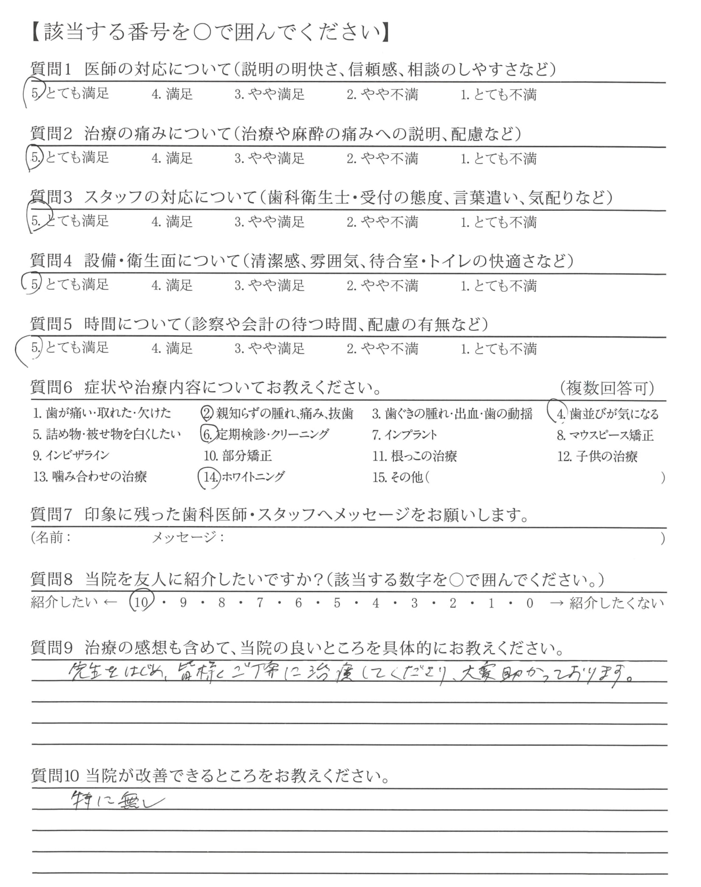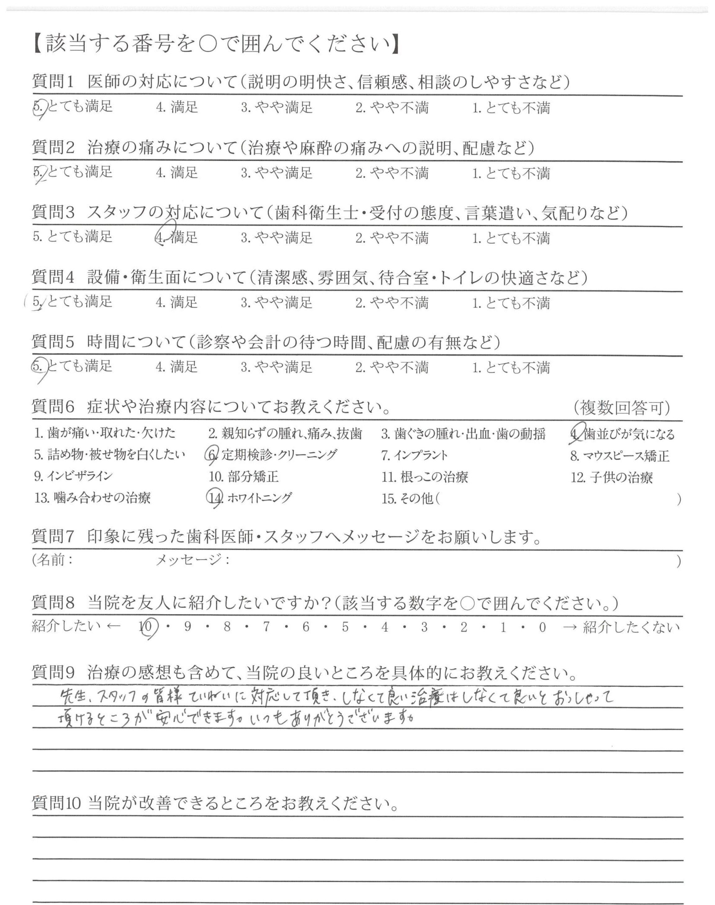 先生、スタッフの皆様ていねいに対応して頂き、しなくて良い治療はしなくて良いとおっしゃって頂けるところが安心できます。いつもありがとうございます。