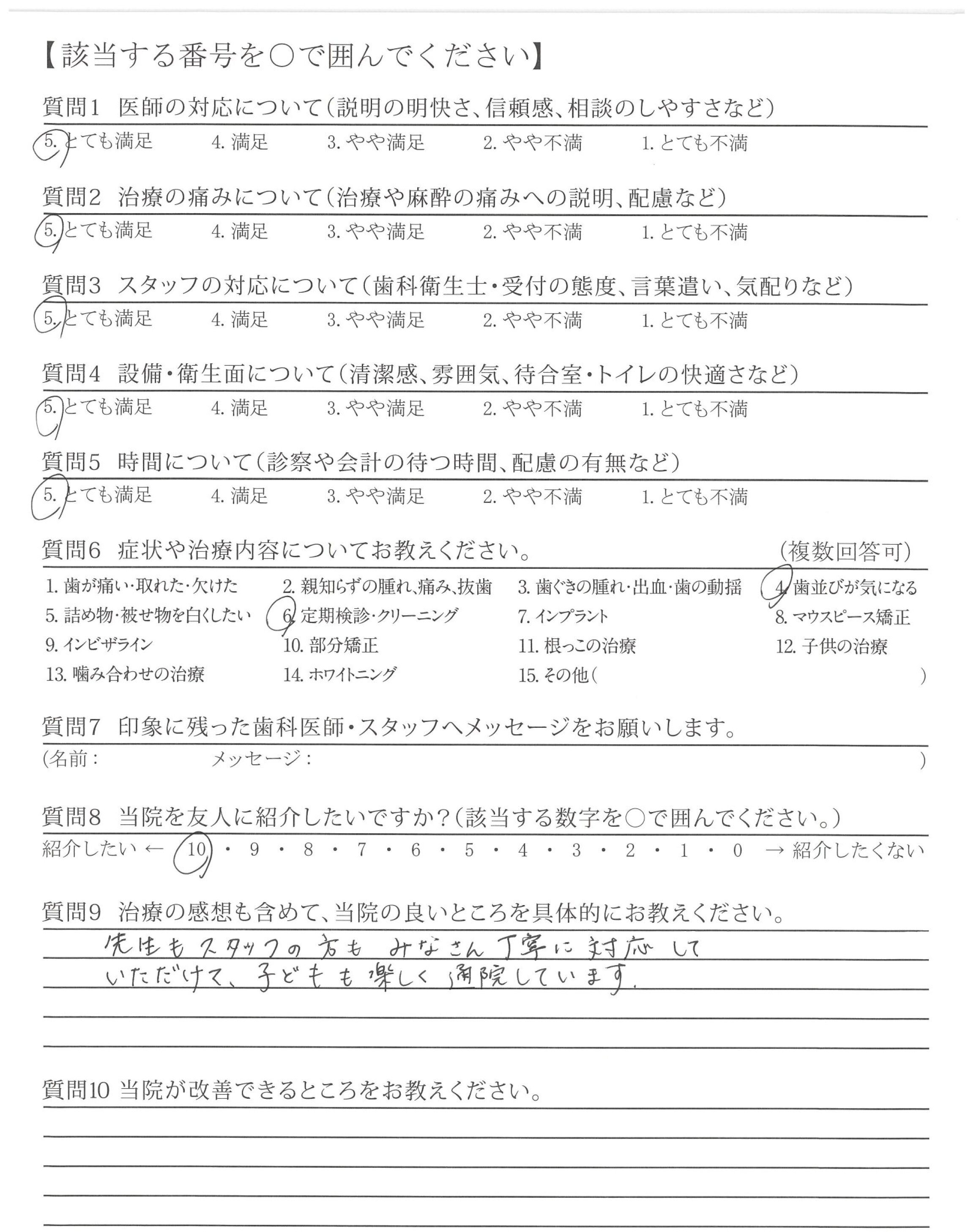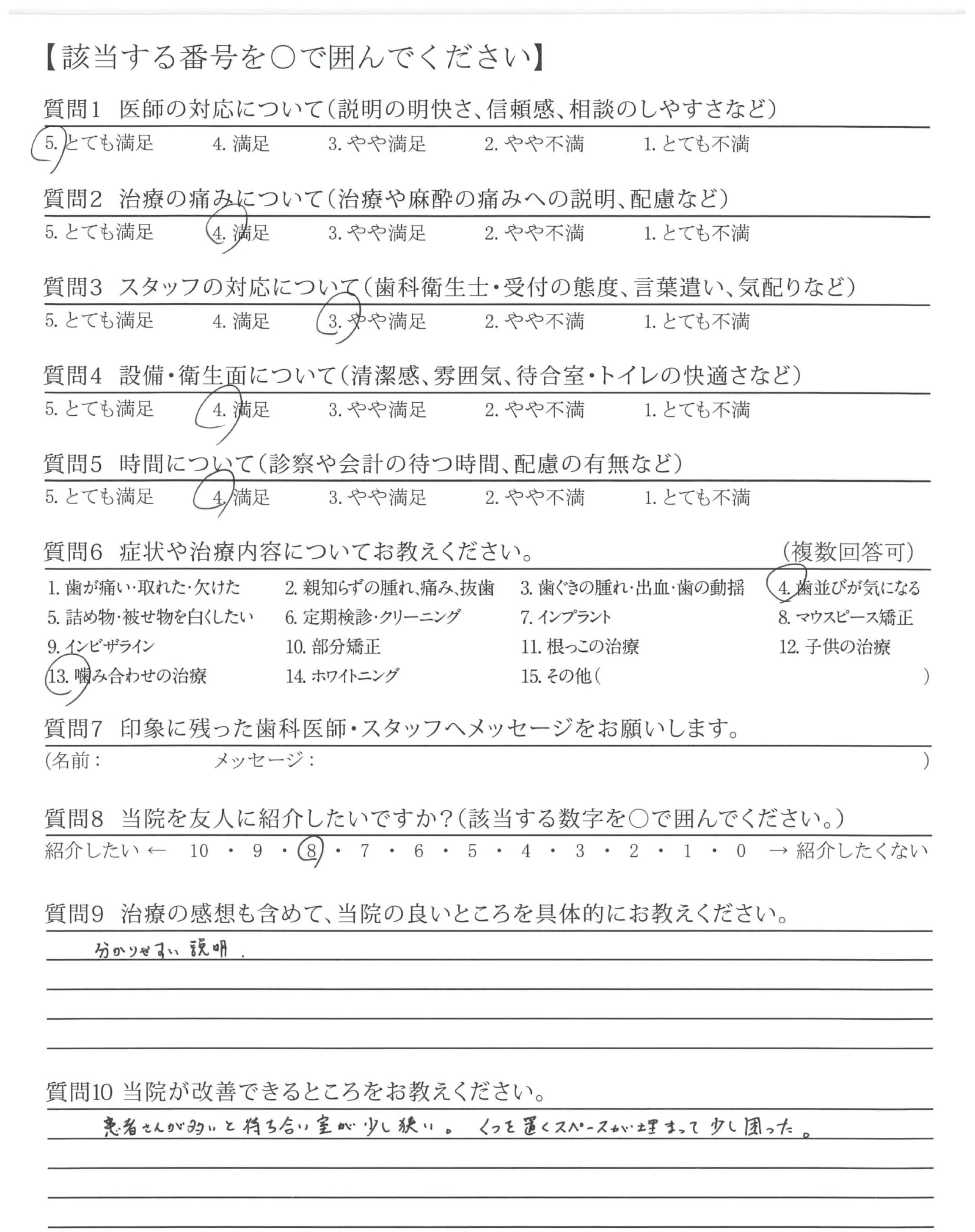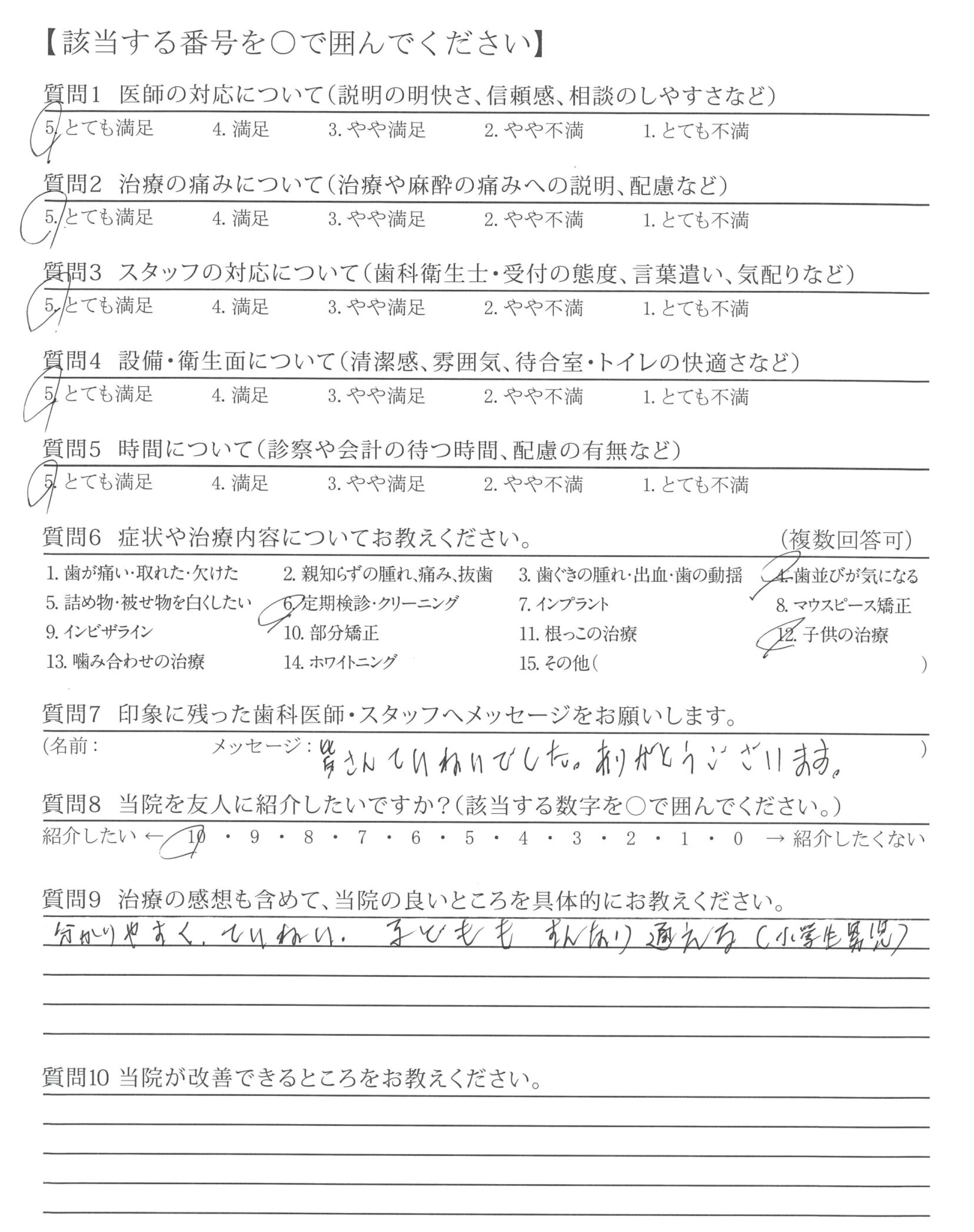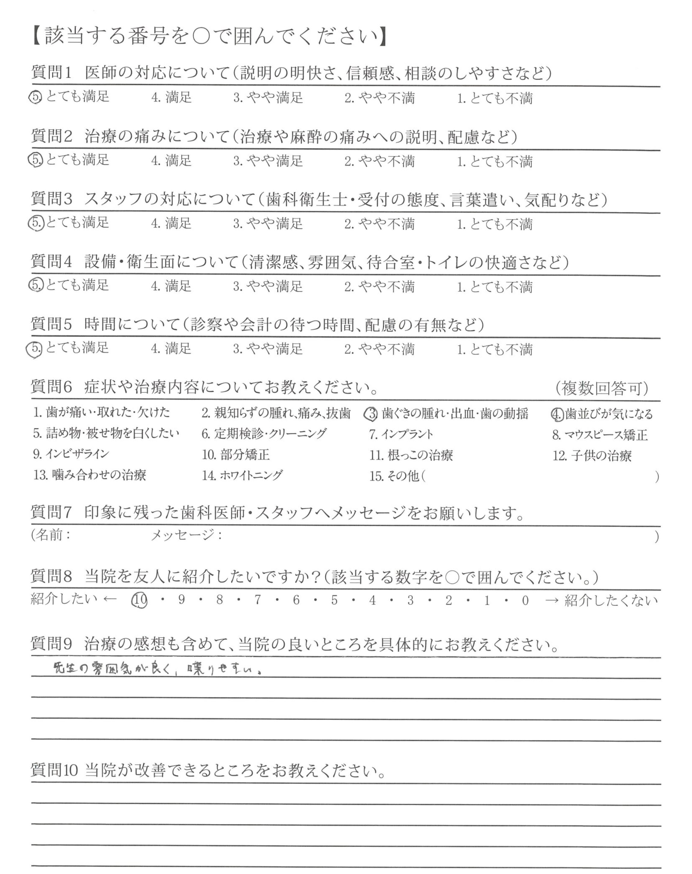 先生、スタッフの皆様ていねいに対応して頂き、しなくて良い治療はしなくて良いとおっしゃって頂けるところが安心できます。いつもありがとうございます。