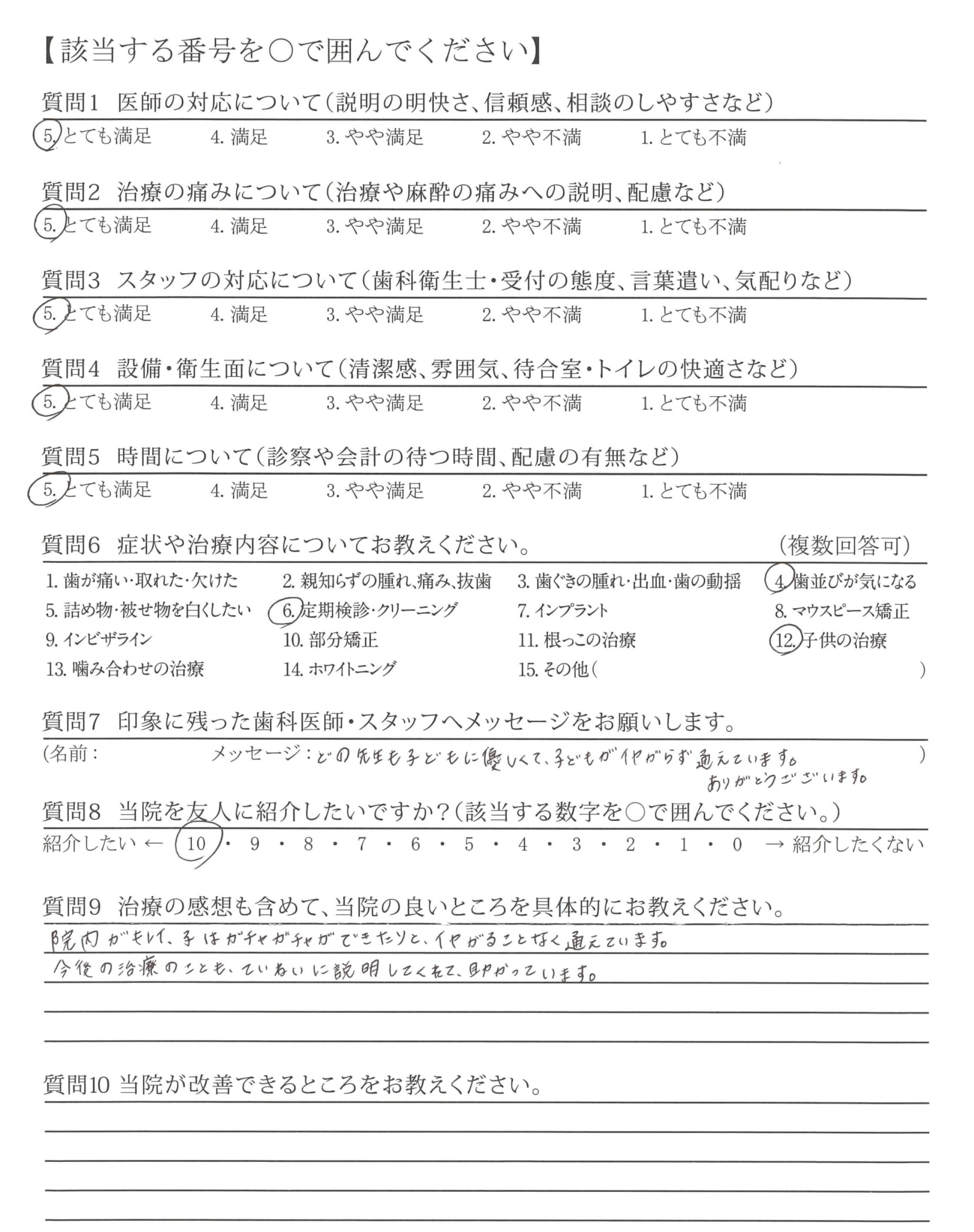 「ひとこと」で院長先生へのメッセージにも記入させていただきましたが、細やかに丁寧に対応していただいているところがいいところです。