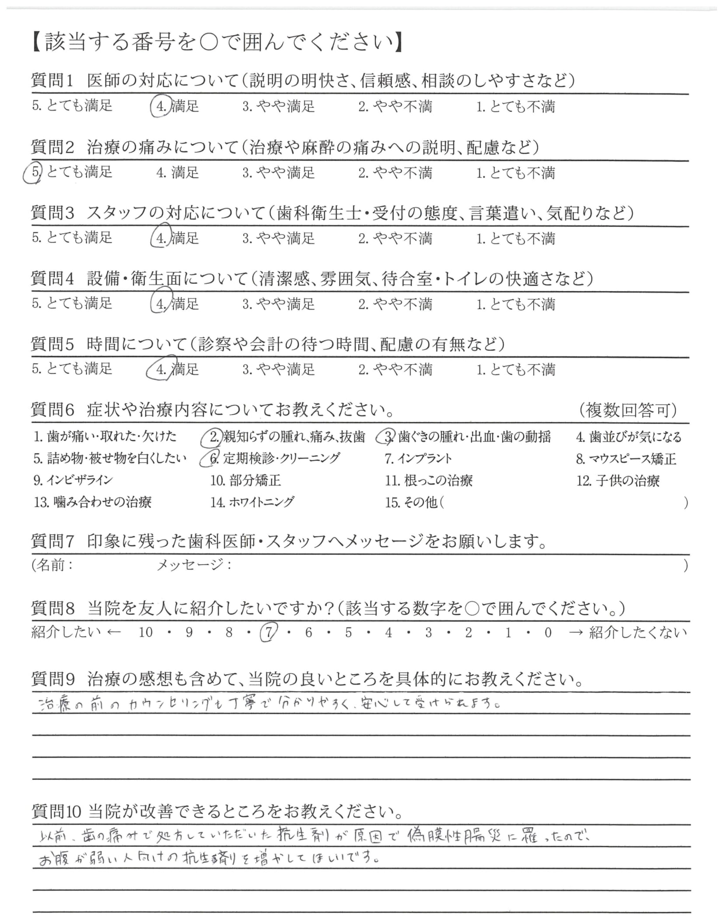 質問に対して、分かりやすい説明をしてくださり安心した。他院の専門医を紹介いただき適切な治療を受けることができ、感謝している。