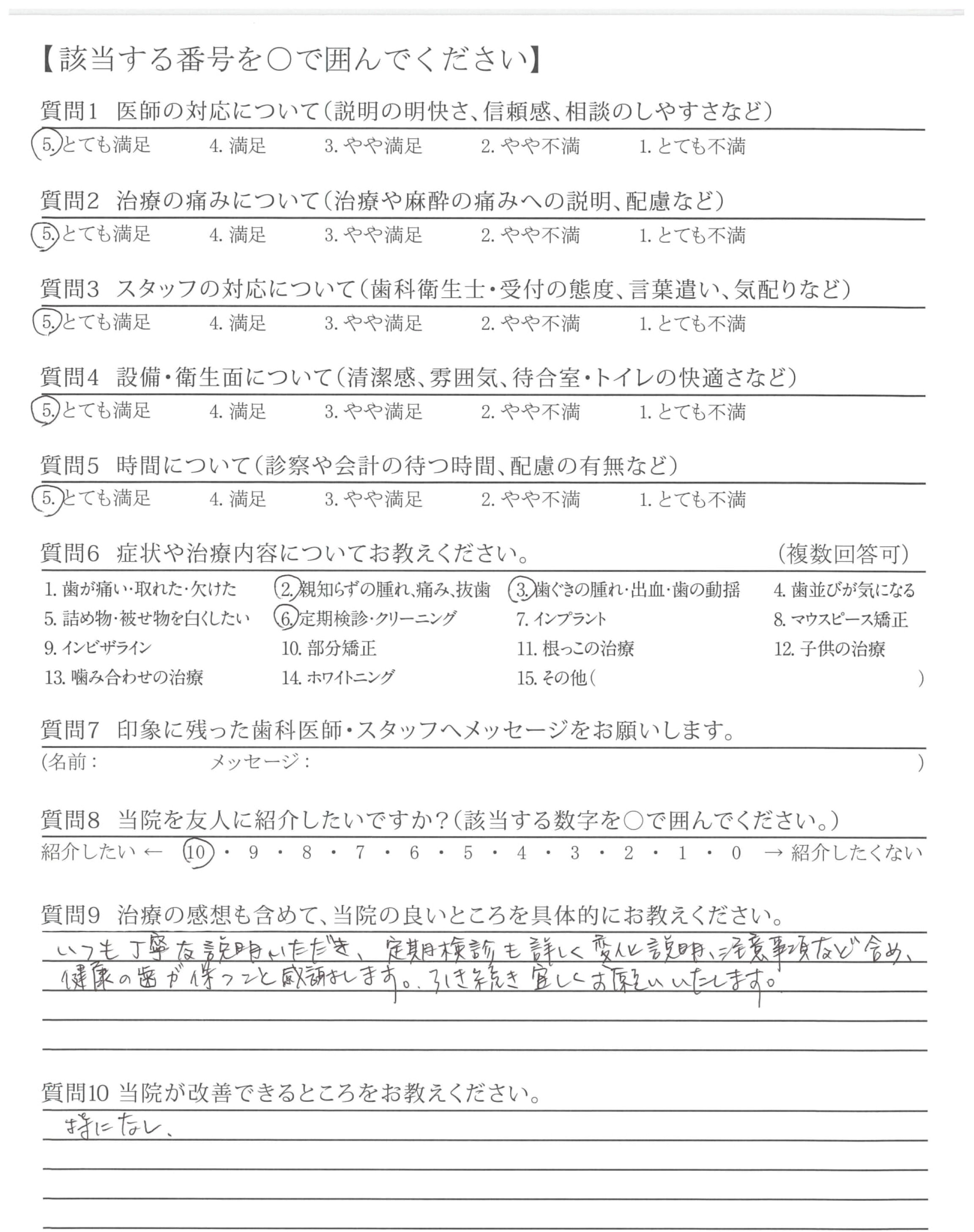 強いて言うなら、お話してくださるときもう少し前に来て頂けるとありがたいです。モニター見てていいのか後ろを振り向いた方がいいのか迷うときがあります。あと、お口をすすぐところにティッシュがあると嬉しいです。
