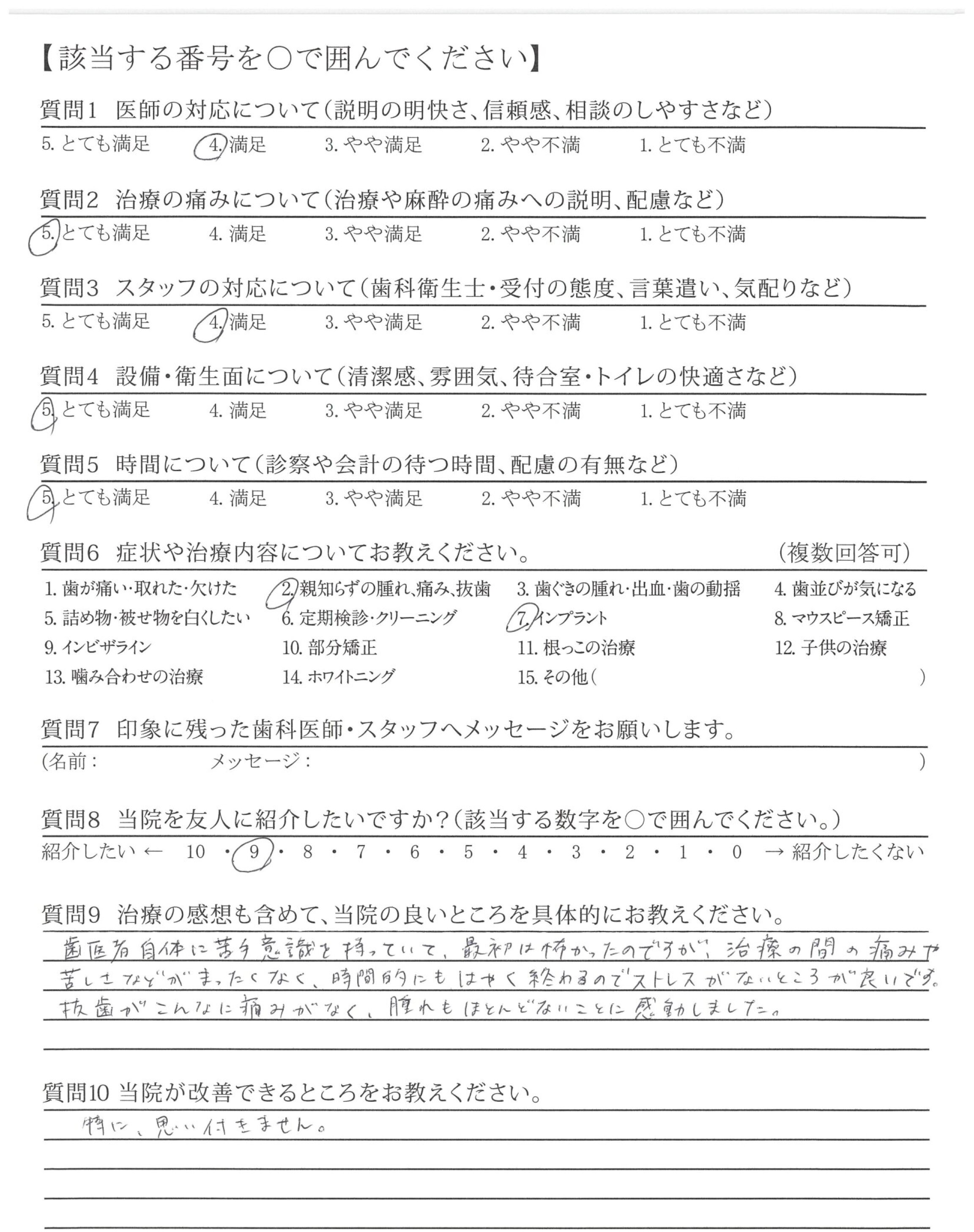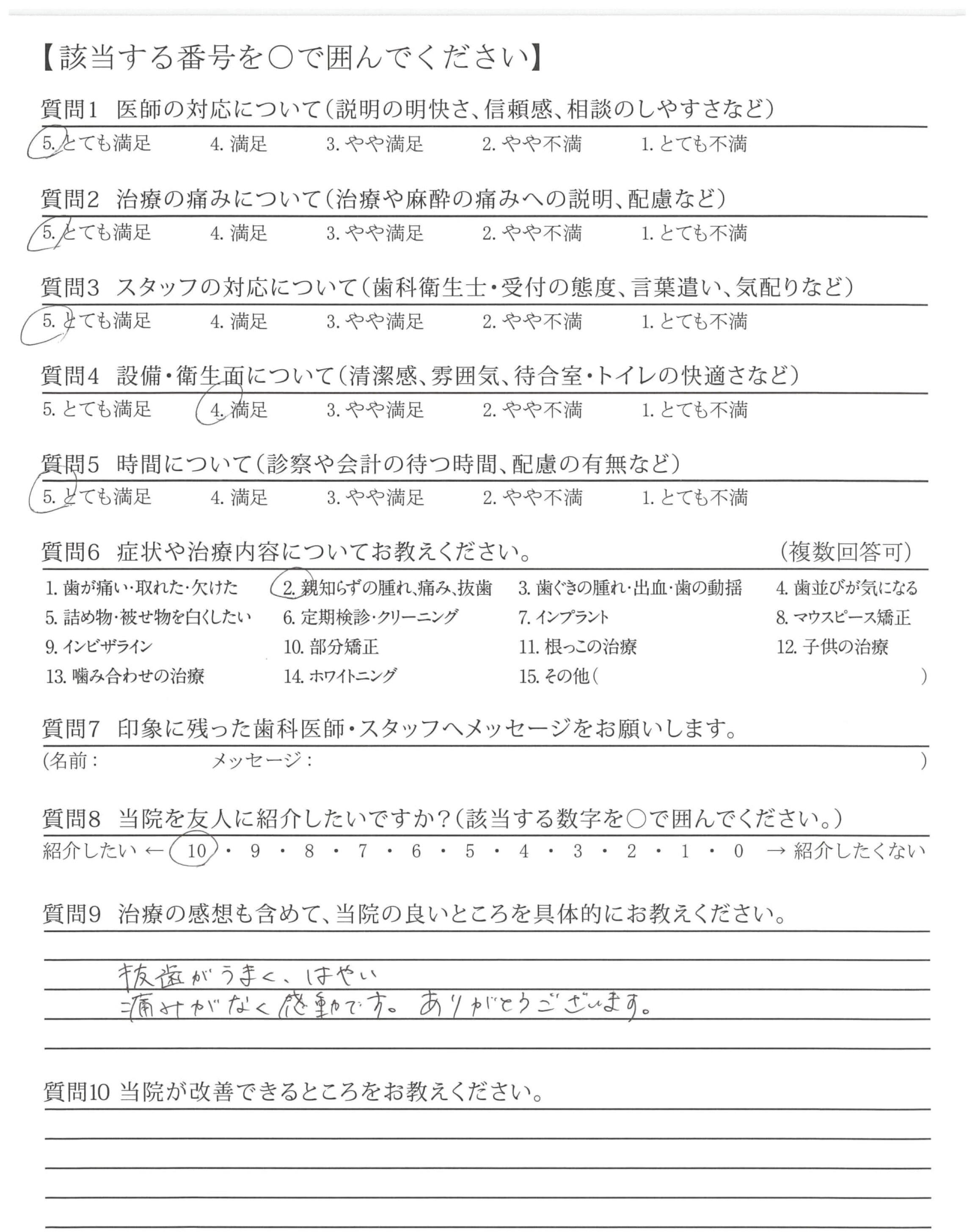 抜歯がこんなに痛みがなく、腫れもほとんどないことに感動しました。