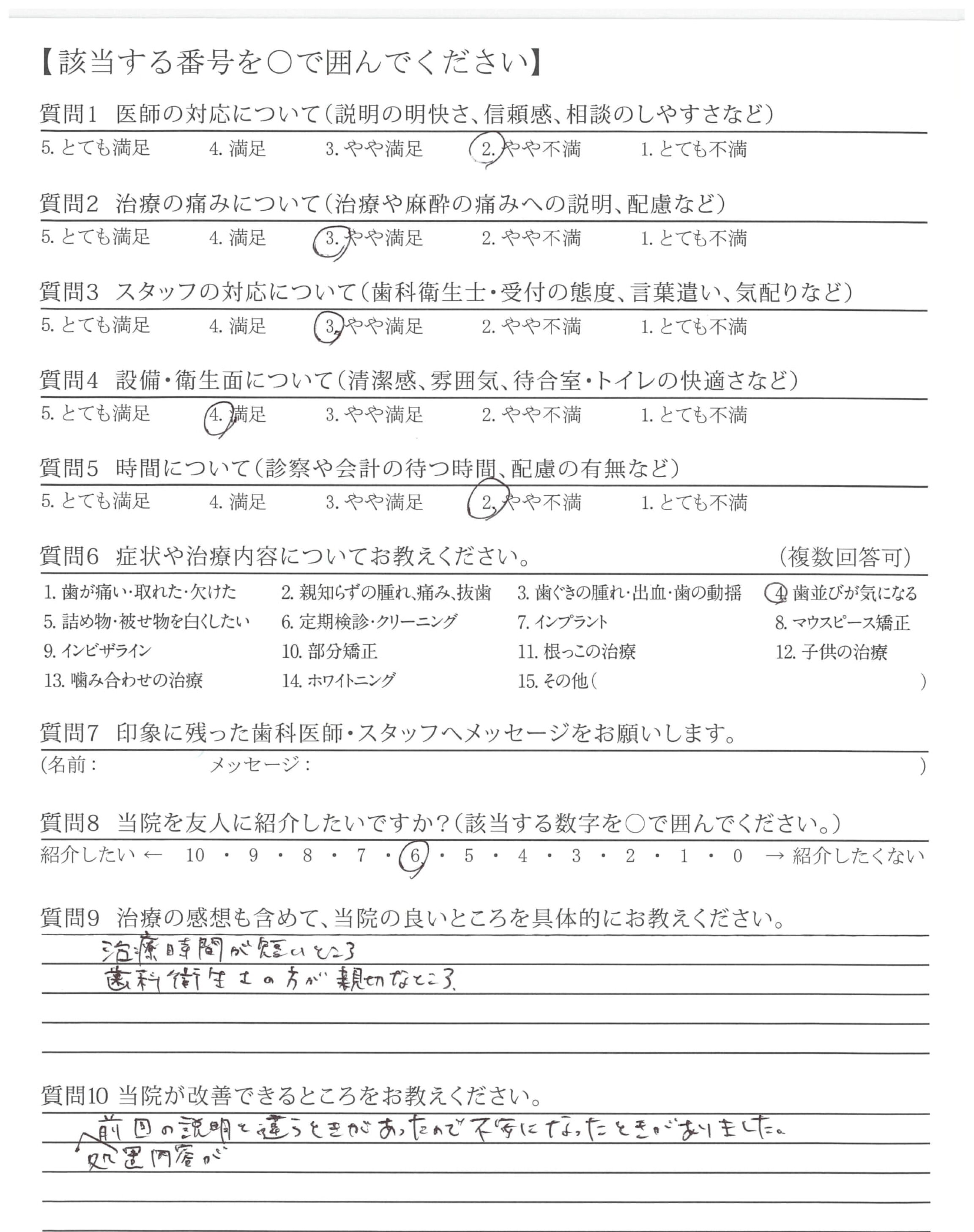 処置内容が前回の説明と違うときがあったので不安になったときがありました。